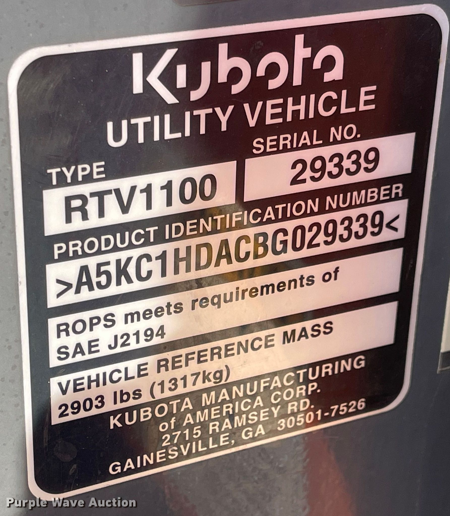 Purple Wave is selling a used Utility Vehicle in Kansas. This item is a Kubota RTV1100 utility vehicle with the following: Hours: Unknown, Serial: 29339
