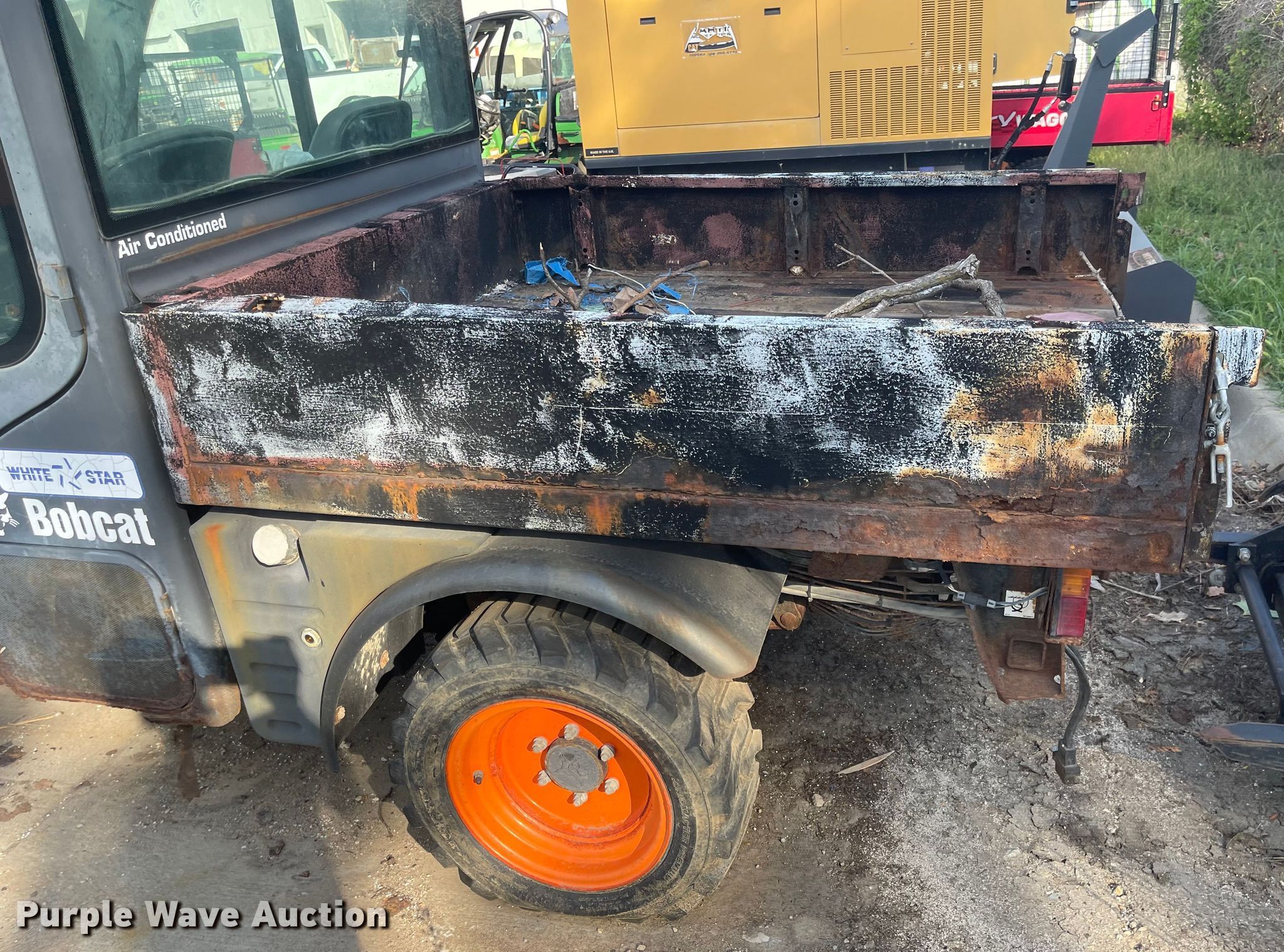 Bobcat utility vehicle. Hours: Unknown. Transmission Shuttle shift. Operators station Enclosed cab, AC, Heat. Features Tool carrier Auxiliary hydraulics, Quick coupler: Manual, Dump bed Dump bed type: Electric/ Hydraulic. Tires Size: 27x10.5-15. Notes Dead battery, Non-operational unit. KSU Division of Facilities. 226 Dykstra Hall. Manhattan, KS 66506
