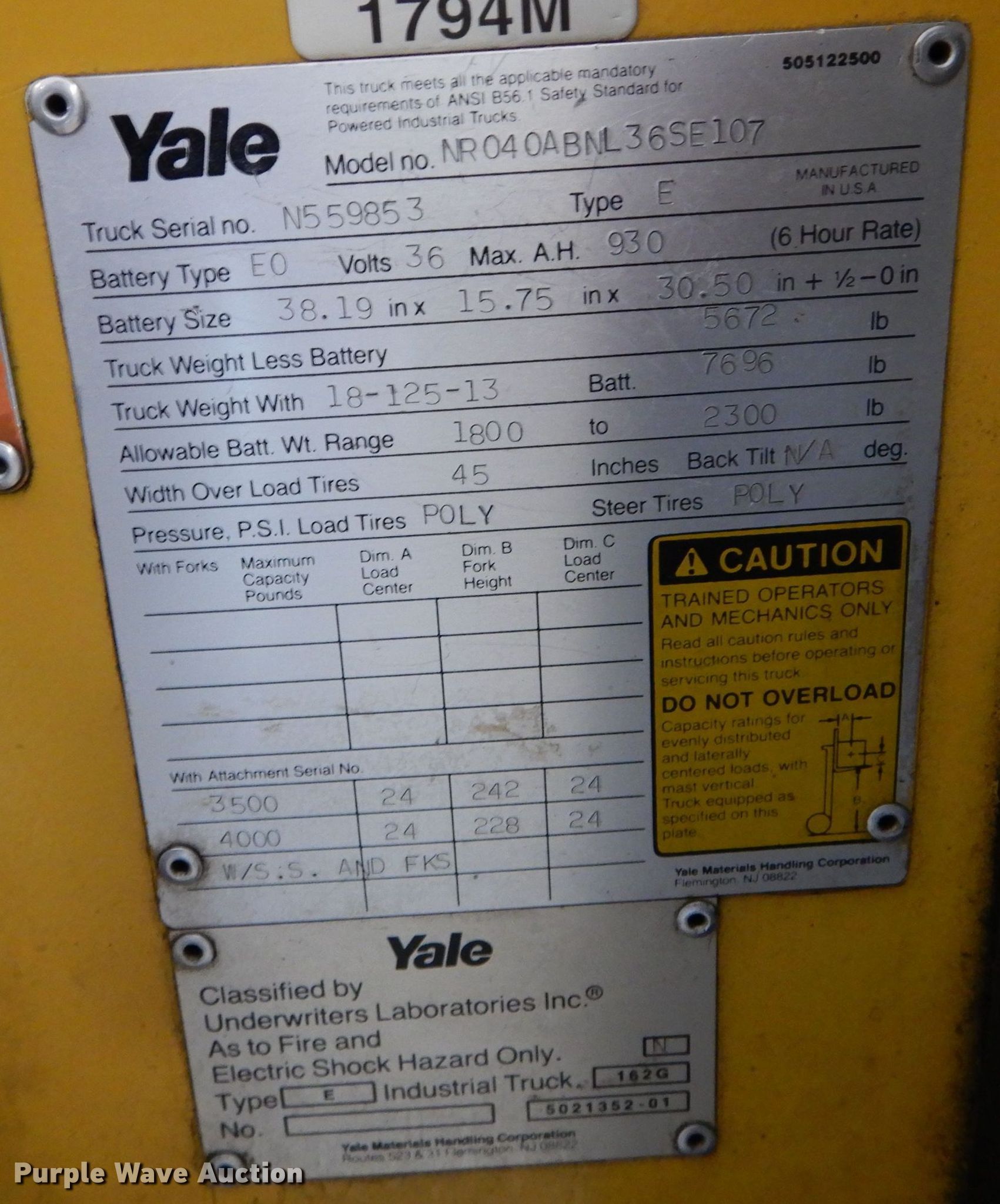 Yale NR040ABNL36SF107 forklift. Hours: 5,357 on meter, Serial: N55985-3. Electric Motor Volts: 36, Phase: Single, Charger: Single phase. Transmission Hydrostatic. Operators station Canopy. Features Maximum lift capacity: 4,000 lbs, Maximum lift height: 228", Mast stages: 1, Side shift, Fork length: 42". Tires Solid. Tonganoxie, KS 66086