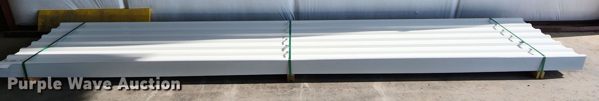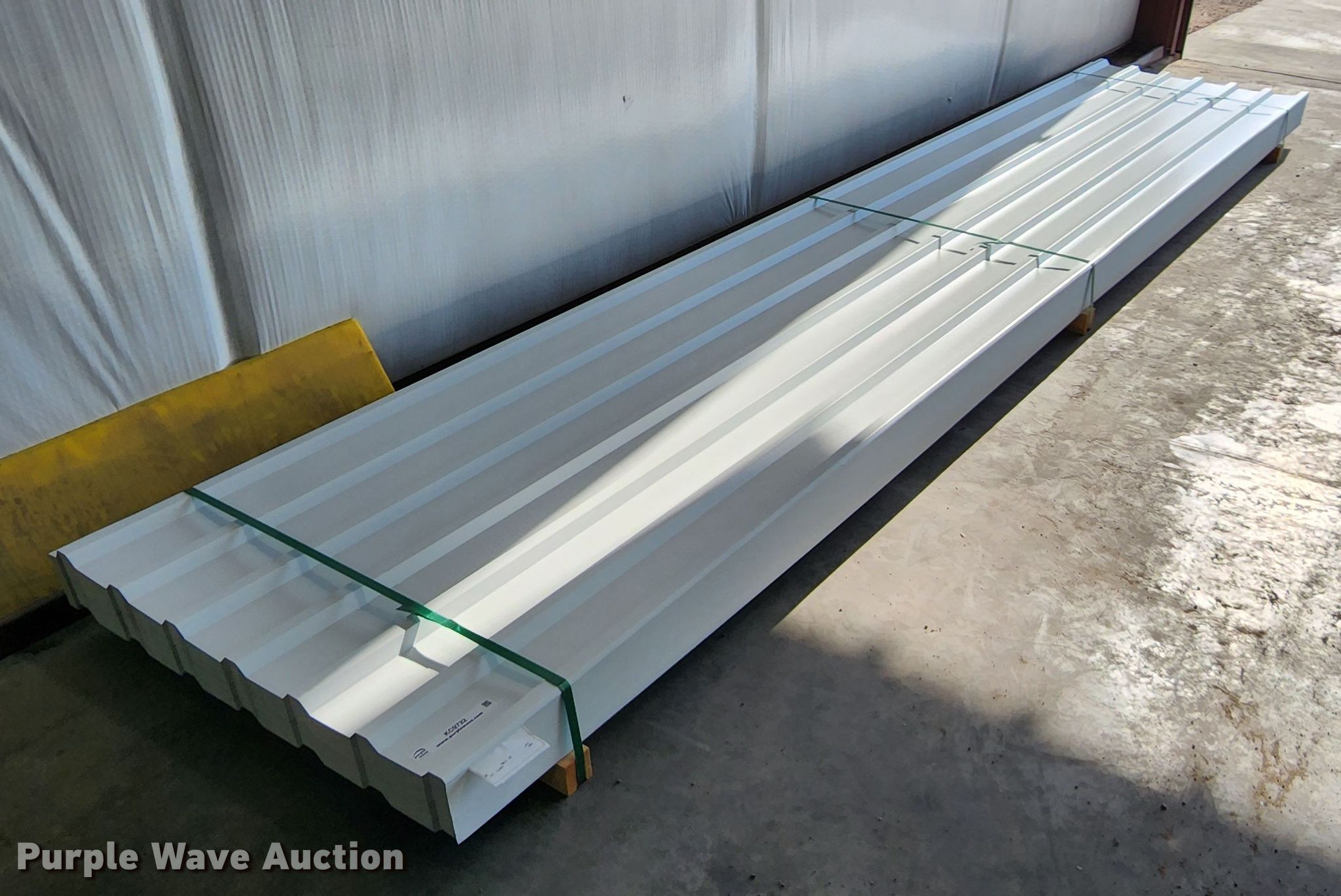 Purple Wave is selling a used Building Materials in Texas. This item is a (160) sheets of 2022 Doerksen Metal Components metal siding/roofing with the following: 16'L x 36"W overlap coverage, PBU profile, 29 gauge, Color: White, Possible blemishes