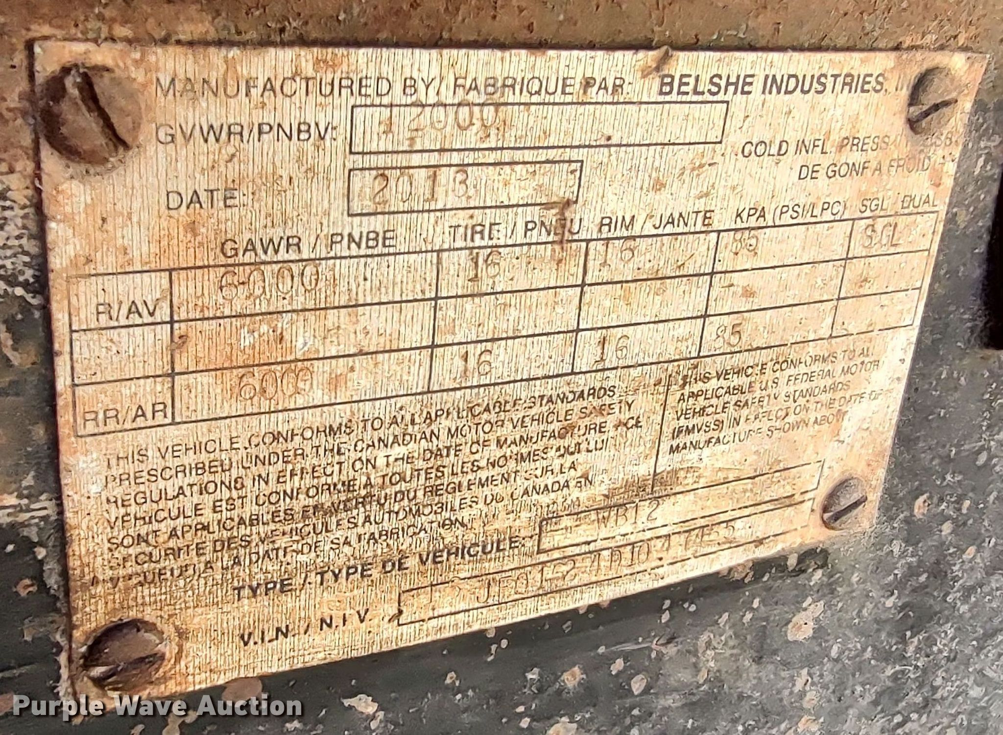 Take a look at this used 2013 Belshe WB12 utility trailer being sold on October 19th, 2022 in the SOLD! October 19 Vehicles and Equipment Auction made by Belshe. Take a look at all of the item information below or take a look at similar auctions for Trailers.