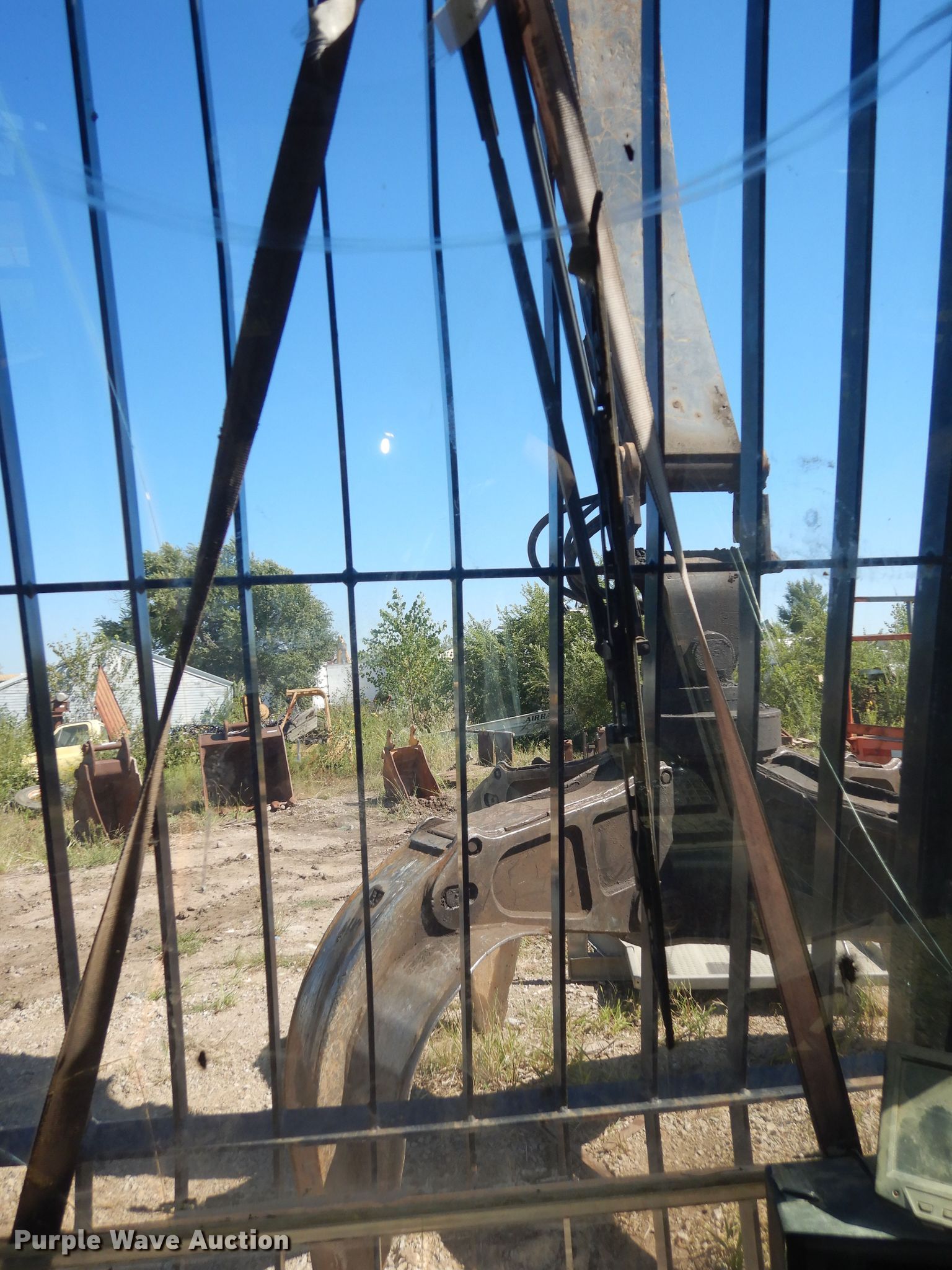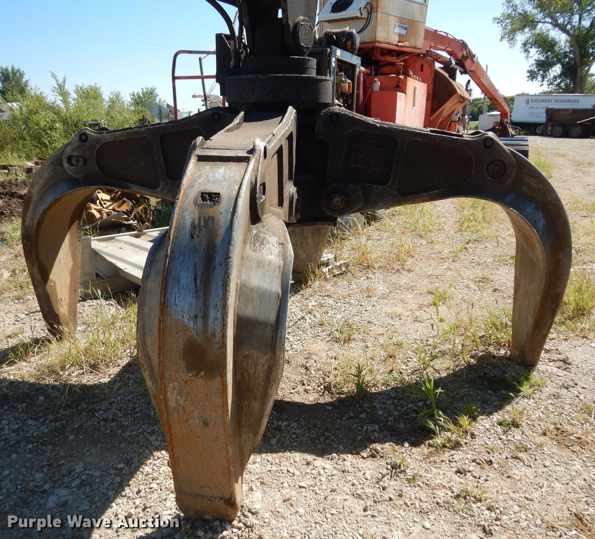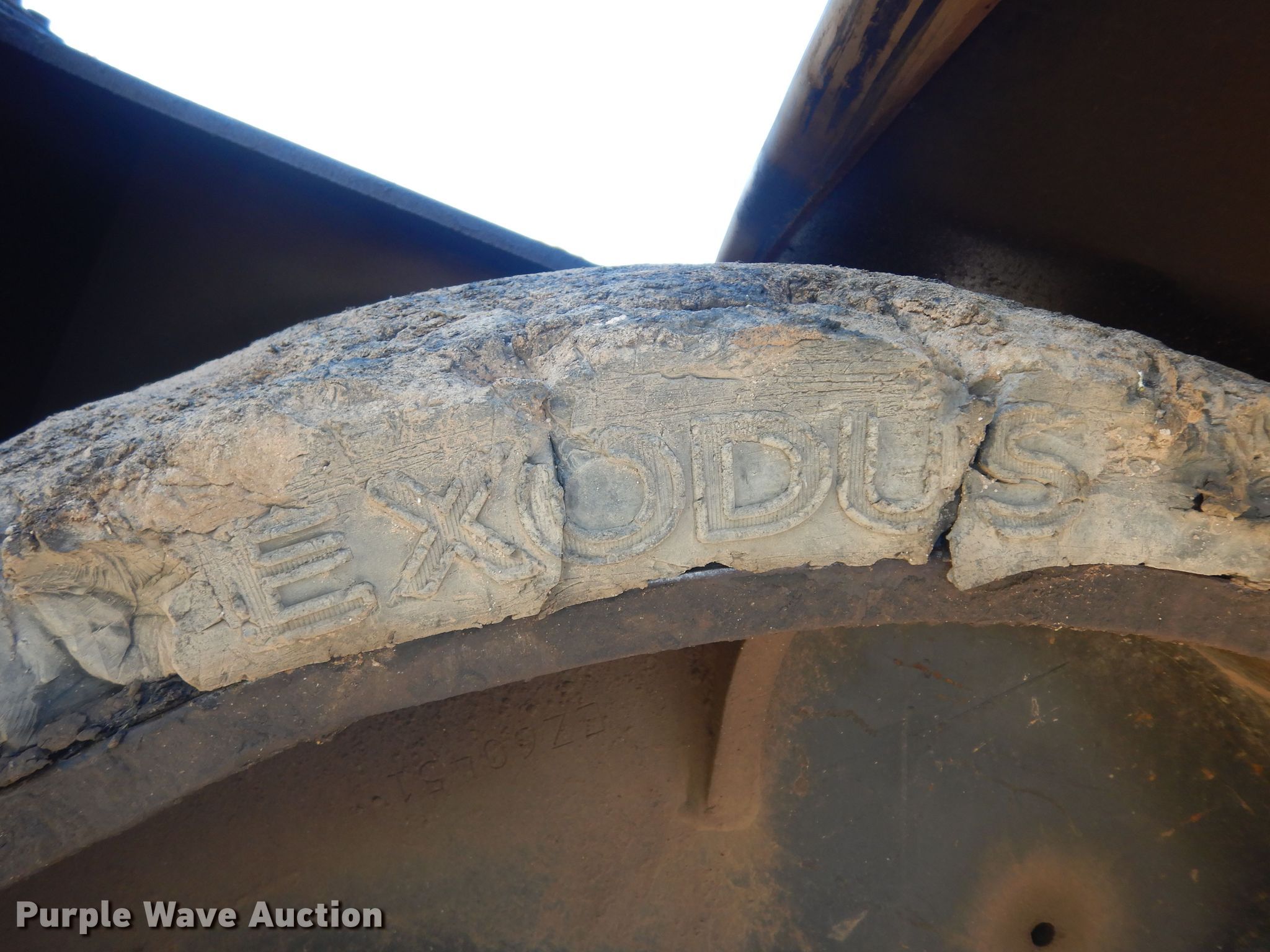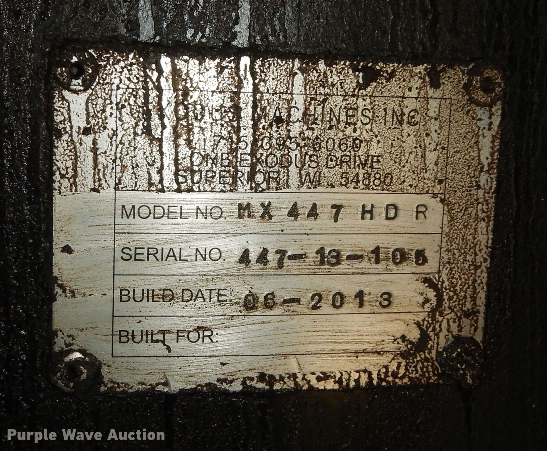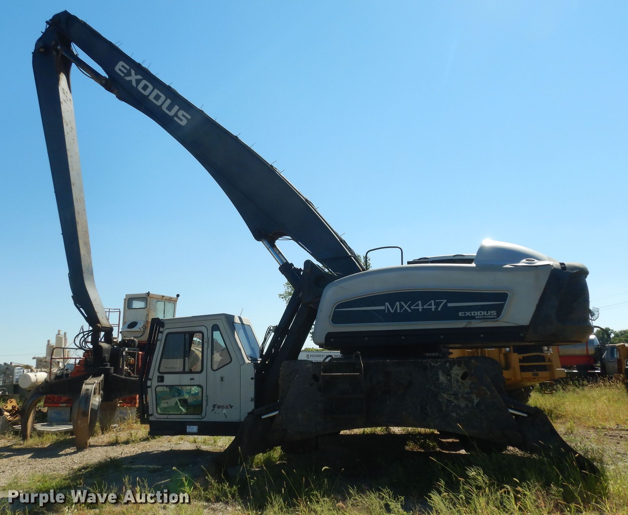 2013 Exodus MX447HDR long reach wheeled excavator. Hours: 11,287 on meter, Serial: 44713105. Engine Caterpillar C9, Cylinders: 6, Fuel type: Diesel. Transmission Hydrostatic. Operators station Enclosed cab, AC, Heat. Features Counter weights, Removable, Boom Standard, Stick Stick length: 26'3", Long reach Max reach: 64', Grapple Caterpillar, Stabilizers. Tires Size: 40.5x59, Brand: Exodus, Solid. Notes Glass cracked, Non-operational AC. Wamego Recycling. 18070 Hwy 24. Wamego, KS 66547