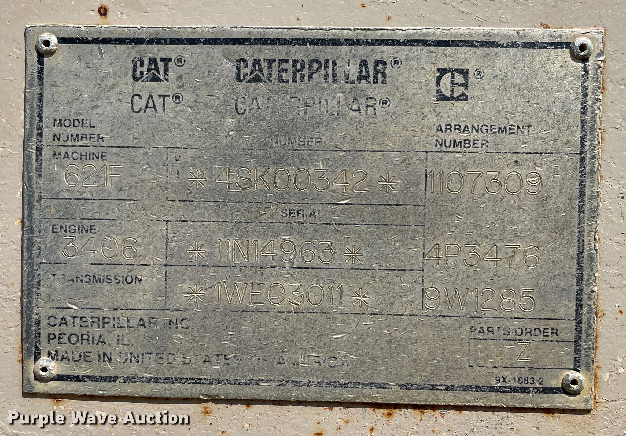 Purple Wave is selling a used Conventional Scraper in Texas. This item is a 1995 Caterpillar 621F conventional scraper with the following: Hours: 3,821 on meter, Serial: 4SK00342