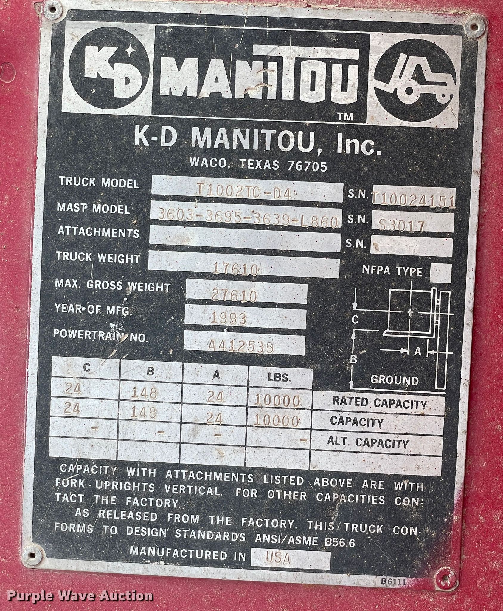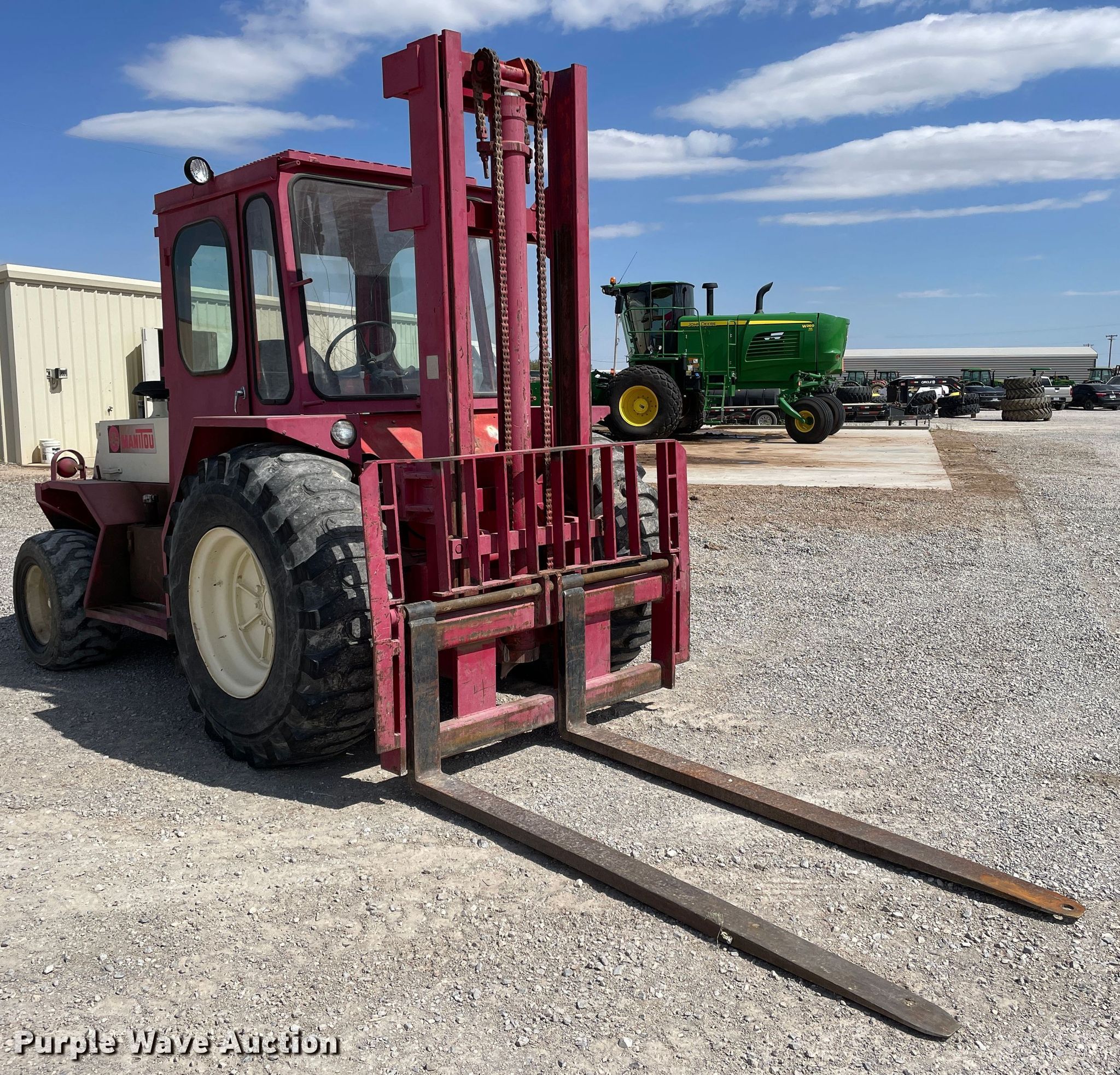 Purple Wave is selling a used Strt. Mast Rough Terr. Forklift in Texas. This item is a 1993 Manitou T1002TC-D4 forklift with the following: Hours: 7,992 on meter, Serial: T10024151
