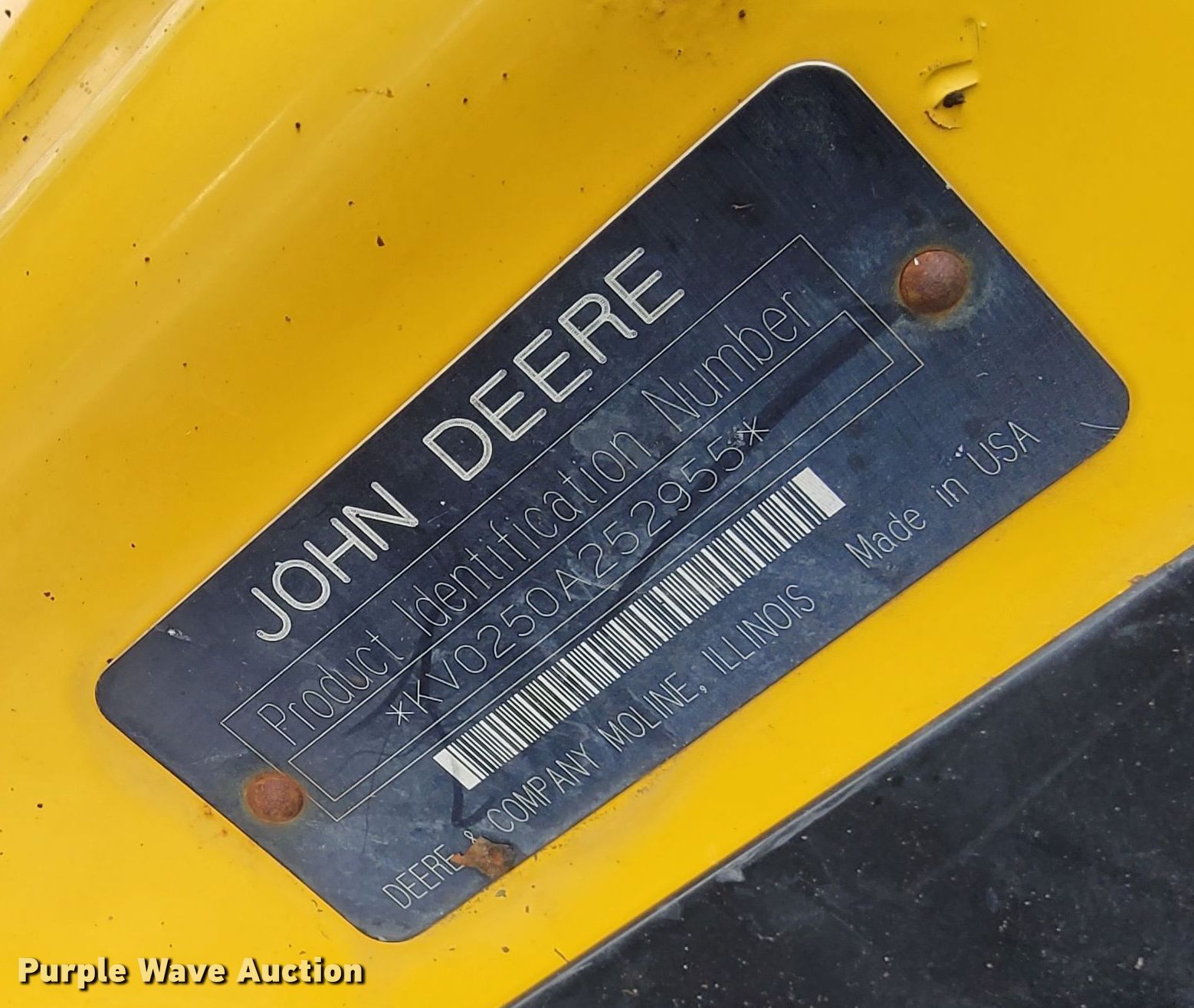 2000 John Deere 250 skid steer loader. Hours: 1,589 on meter, Serial: KV0250A252955. Engine Displacement: 2.9L, Cylinders: 3, Fuel type: Diesel. Transmission Hydrostatic. Operators station EROPS, Heat, Bucket control: Foot. Features Auxiliary hydraulics, Quick coupler: Manual, Bucket Width: 17", Cutting edge: Bolt-on. Tires Size: 12-16.5. 32729 County Rd 2. Morton, MN 56270