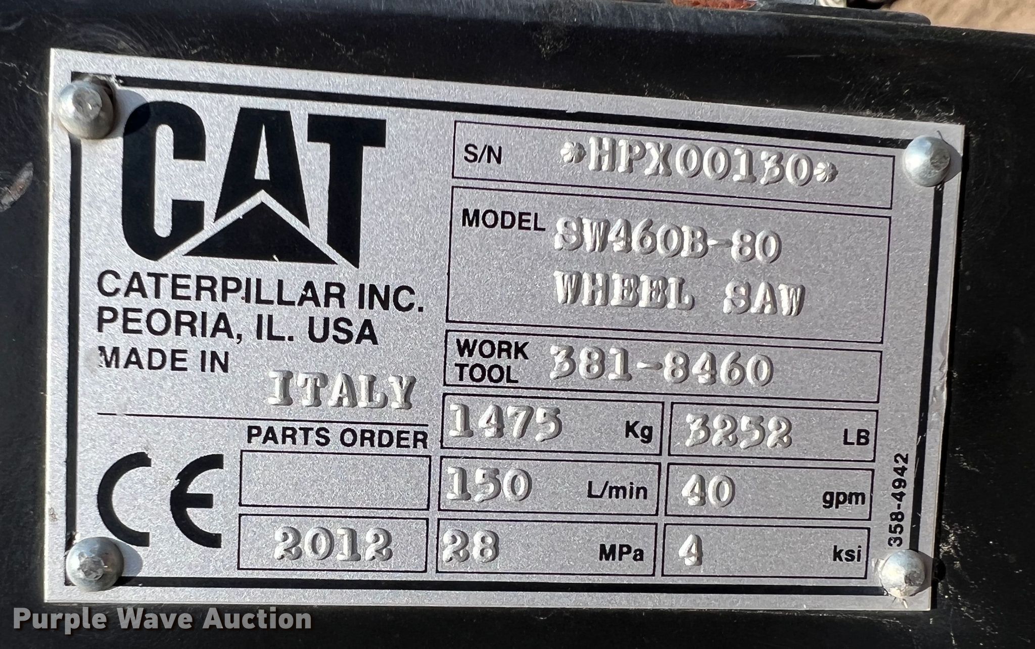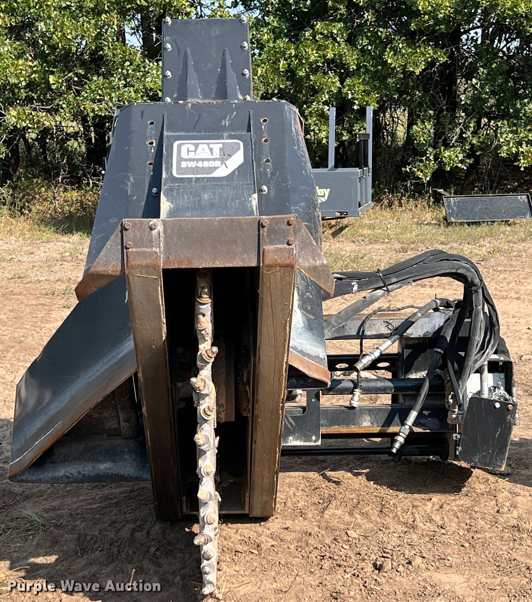 Purple Wave is selling a used Skid Steer Attach. in Kansas. This item is a 2012 Caterpillar SW460B-80 skid steer rock saw with the following: Serial: HPX00130, Width: 3", Blade diameter: 60", 14 pin adapter