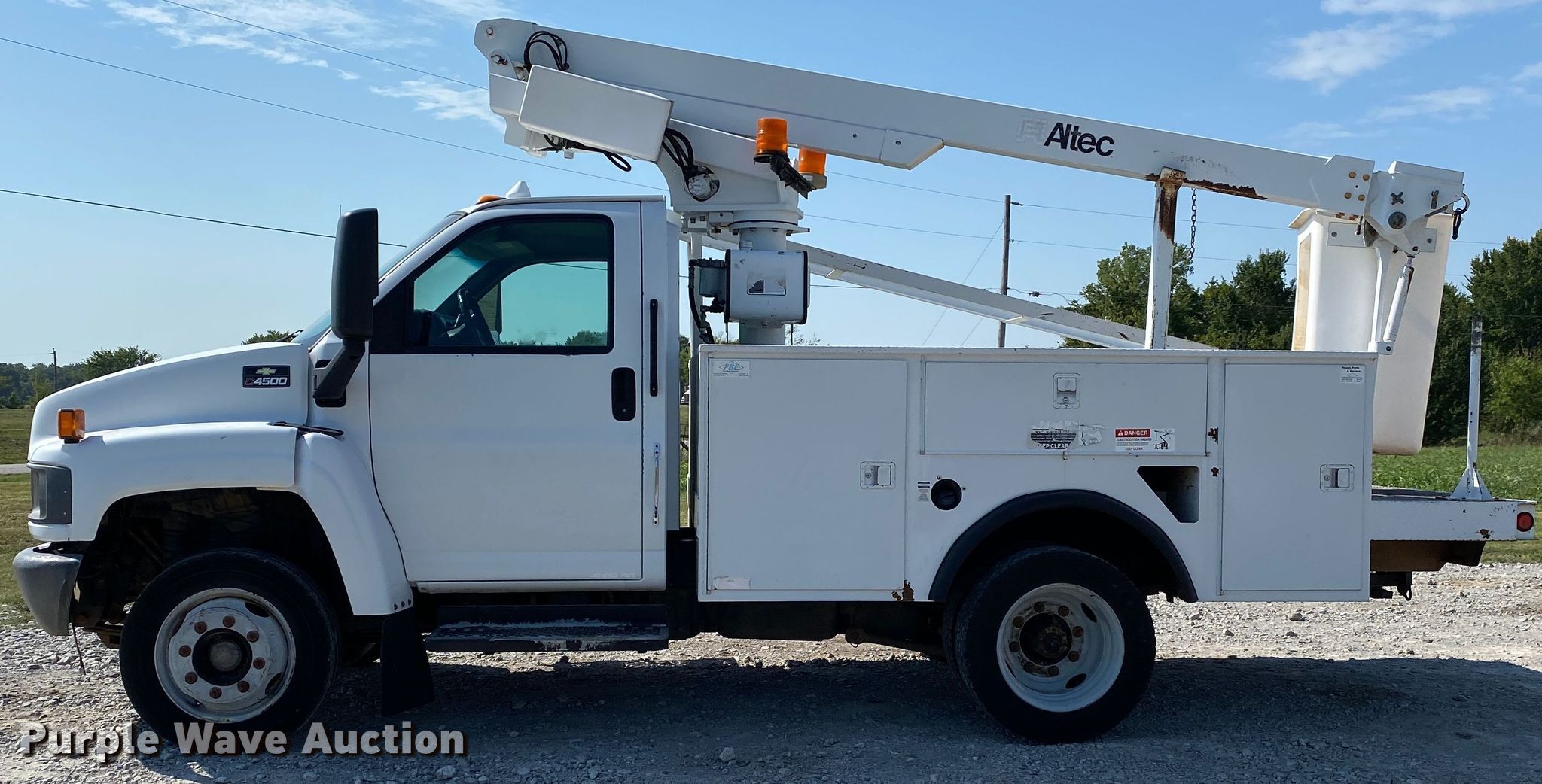 Purple Wave is selling a used Bucket Truck in Oklahoma. This item is a 2003 Chevrolet C4500 bucket truck with the following: Miles: 229,446 on odometer, VIN: 1GBC4E1E43F522502