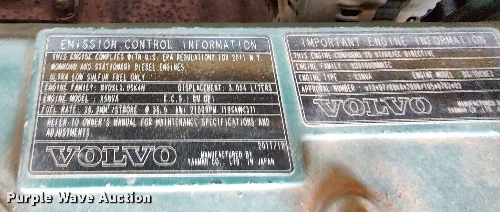 2012 Volvo EC55C mini excavator. Hours: 5,566 on meter, Serial: VCEE55CH00112241. Engine Volvo XSNVA, Serial: BYDXL3.05K4N, Displacement: 3.054L, Cylinders: 4, Fuel type: Diesel. Transmission Hydrostatic, Two speed travel. Operators station Enclosed cab, AC, Heat. Features Auxiliary hydraulics Standard, Backfill blade Width: 75", Boom Swing, Stick Stick length: 5', Bucket Width: 22", Cutting edge: Bolt on, Teeth: 5. Tracks Width: 15", Rubber. Notes Glass cracked. Cobalt Construction Inc.. 6401 Northwest 178th Street. Edmond, OK 73012