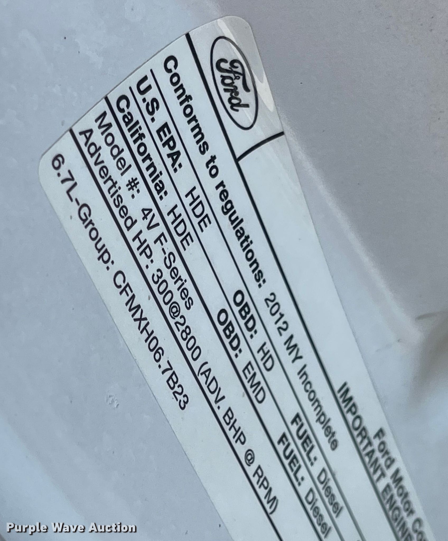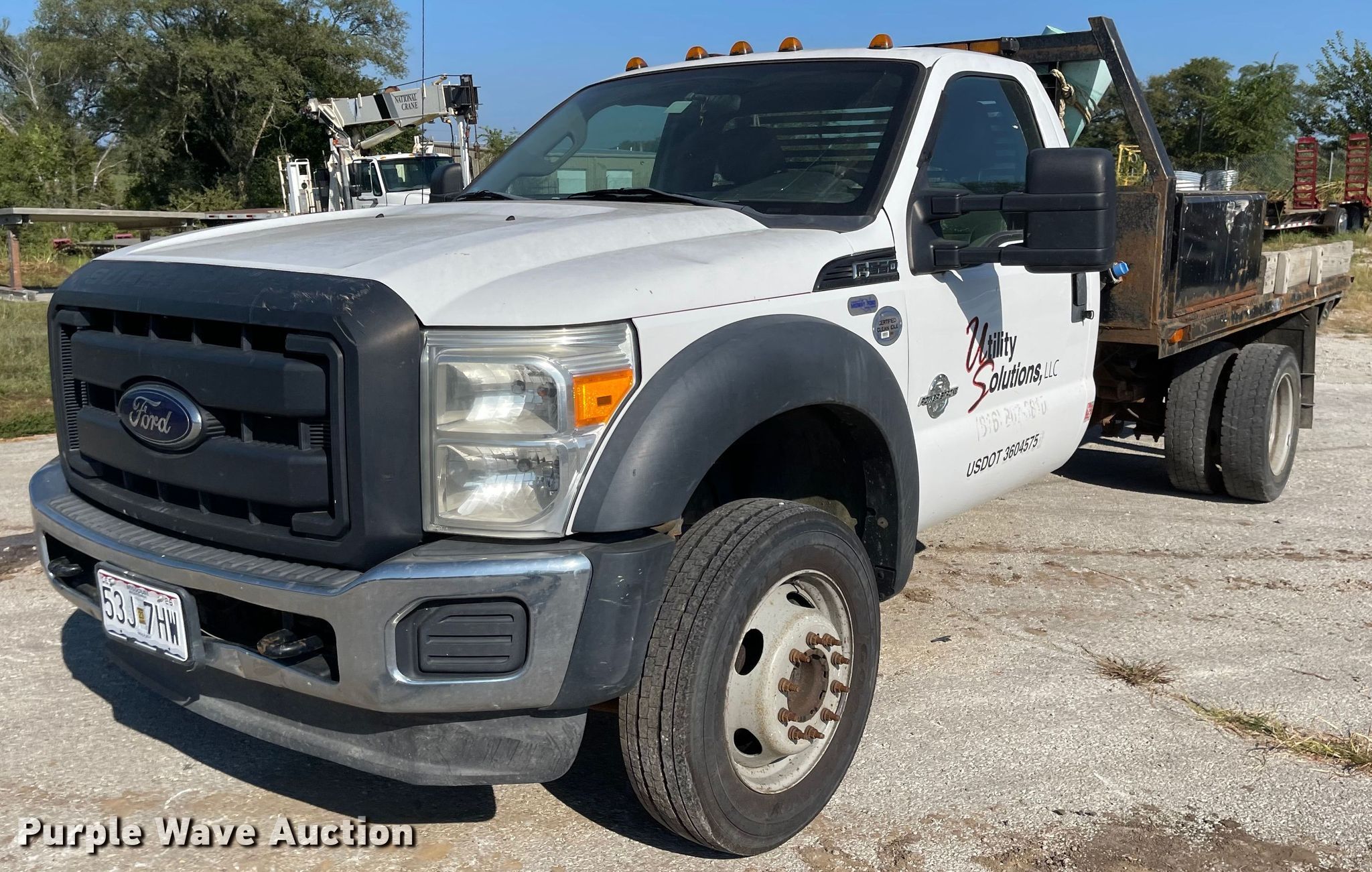 2012 Ford F550 Super Duty XL flatbed truck. Miles: 188,903 on odometer, VIN: 1FDUF5GT8CEB18362. Engine Displacement: 6.7L V8 OHV, Cylinders: 8, Fuel type: Diesel. Transmission Automatic. Chassis Axles: Single, Suspension: Spring, Brakes: Hydraulic, GVWR: 19,500 lbs. Interior AC, Heat, Cruise control, Brake controller. Features Flatbed 11' L x 96" W. Tires Size: 225/70R19.5. Notes Dash warning indicator: Check engine, Air bag. Kansas title. Title distribution may be delayed up to 14 days from verification of funds. RNG 10 Capital LLC - Open inspection Oct. 14, 19. 14612 Parallel Lane. Basehor, KS 66007