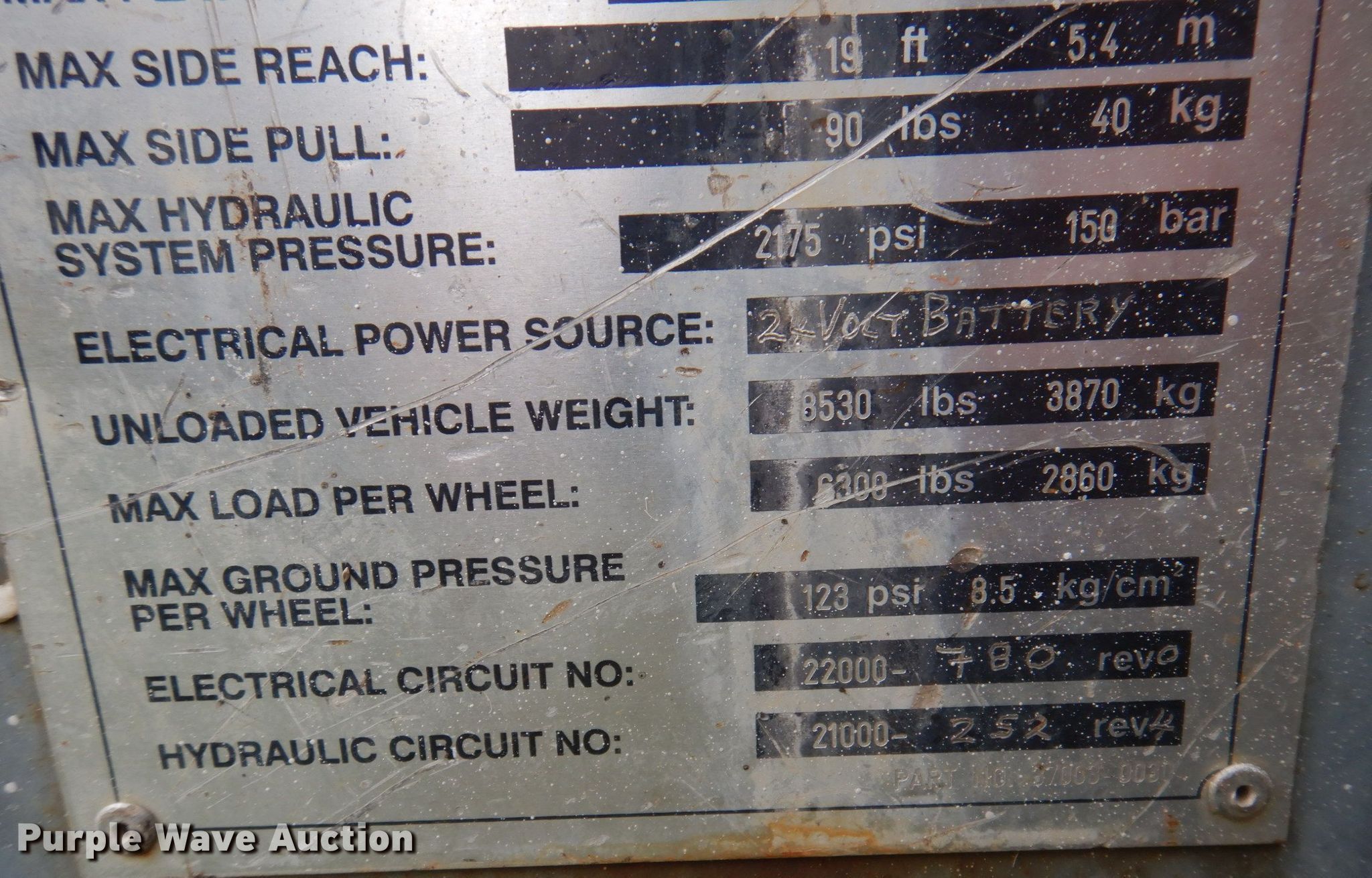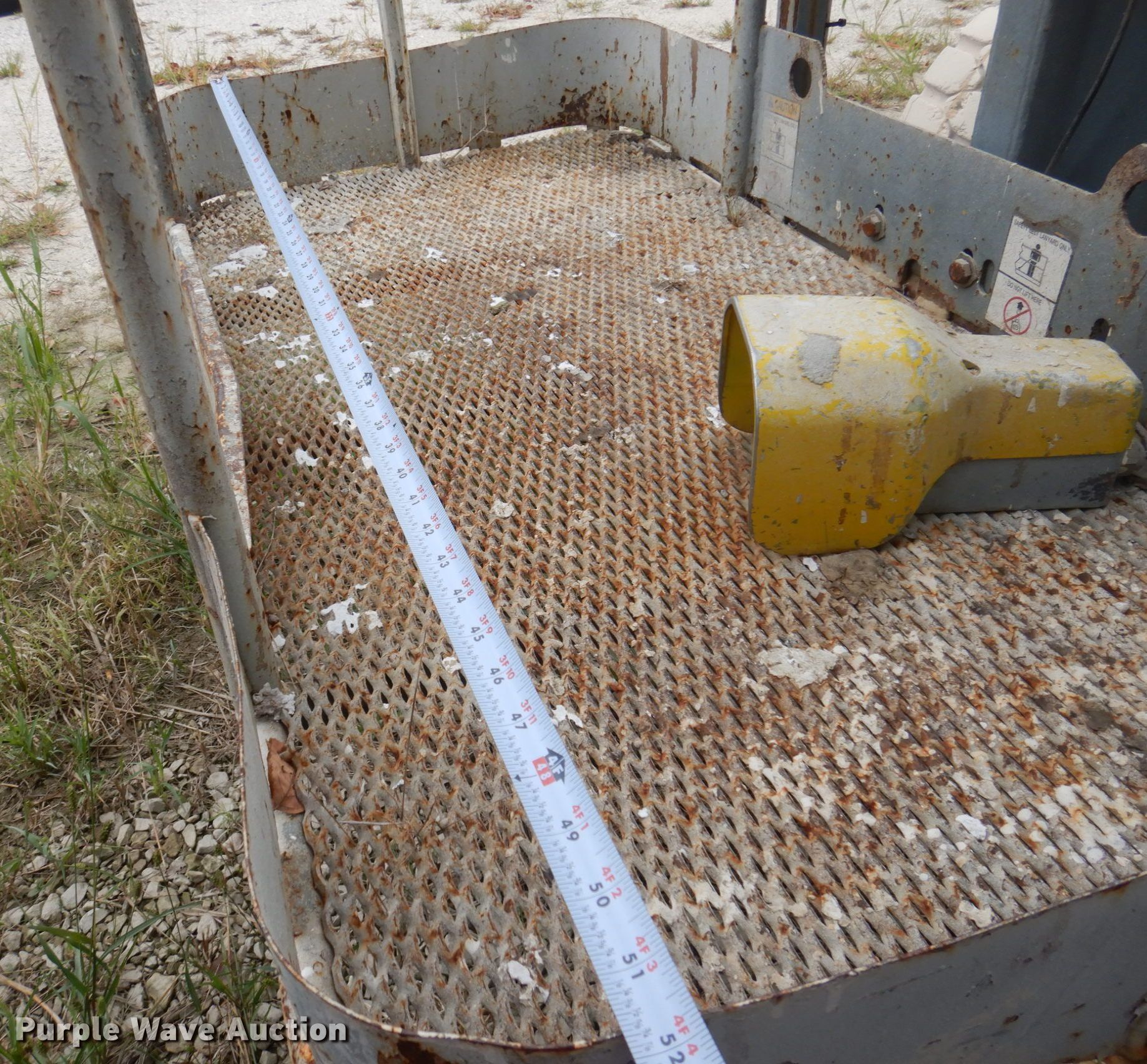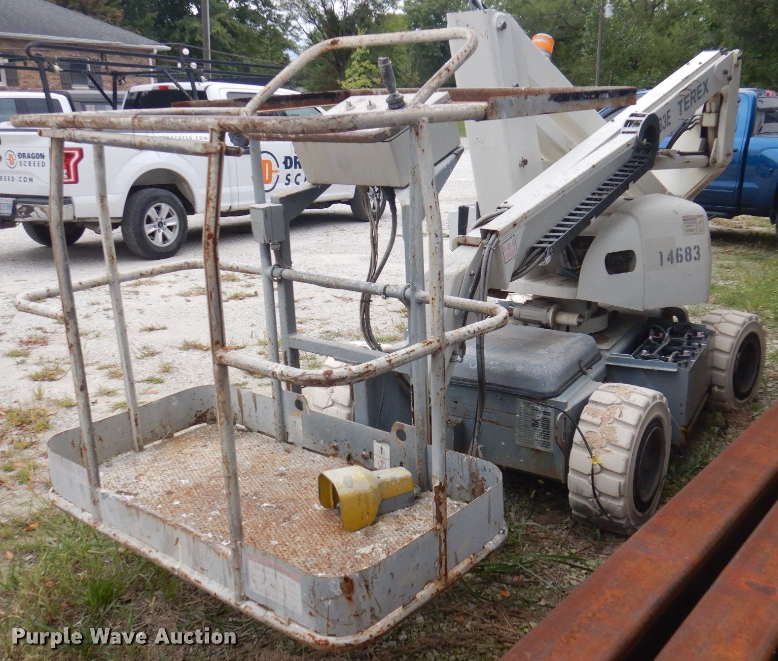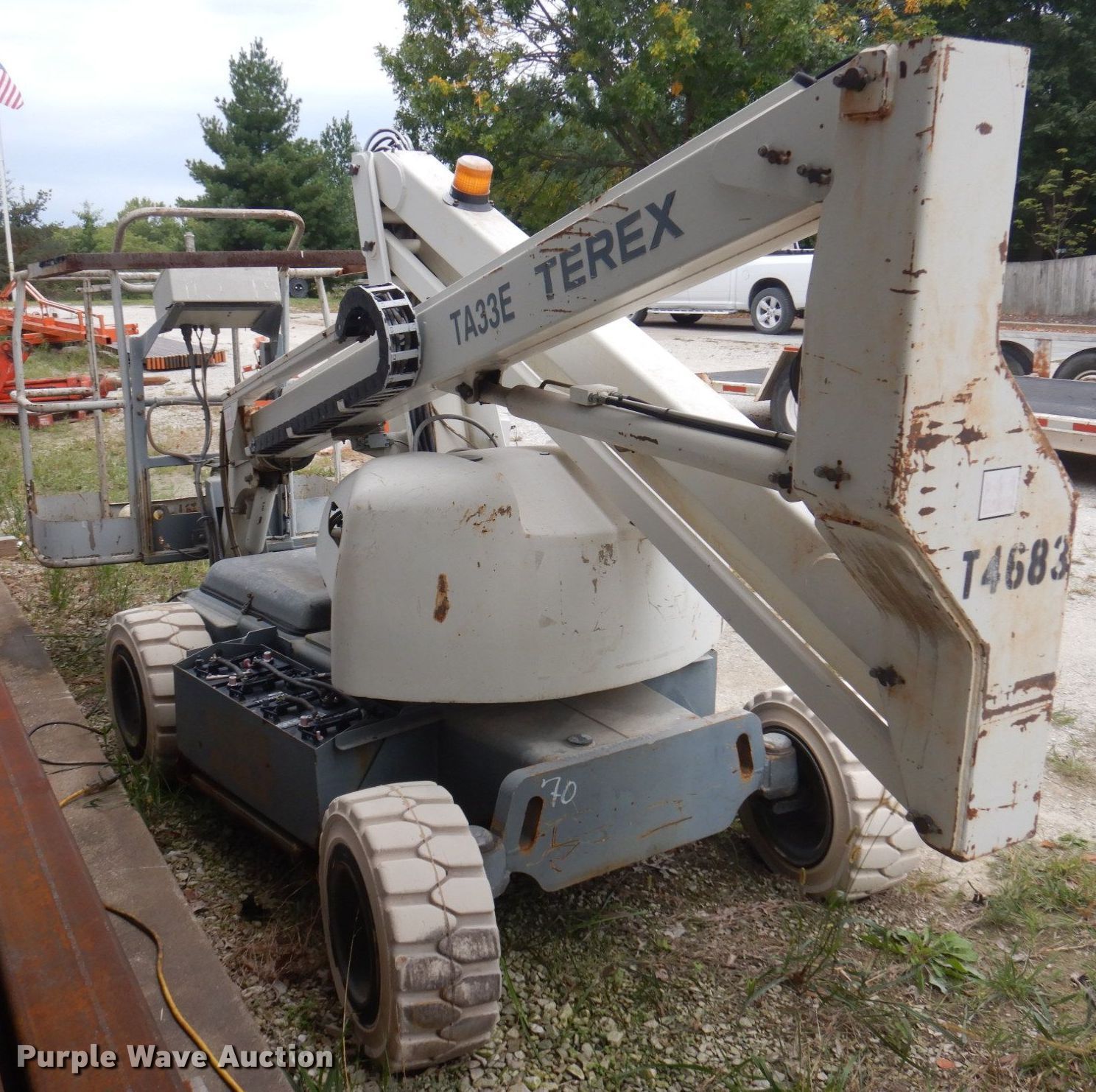 1998 Terex TA33E boom lift. Hours: 544 on meter, Serial: 14683. Electric Motor Volts: 24. Features Articulating boom, Maximum lift capacity: 500 lbs, Maximum lift height: 32' 6", Platform: 52" L x 27" W, AC power outlet, Controls: Platform, Platform rotation: Hydraulic. Tires Tire size: 23x10-12, Solid, Non marking. Terstriep Luke Concrete & Excavating. 6930 Horseshoe Valley Road. Quincy, IL 62305