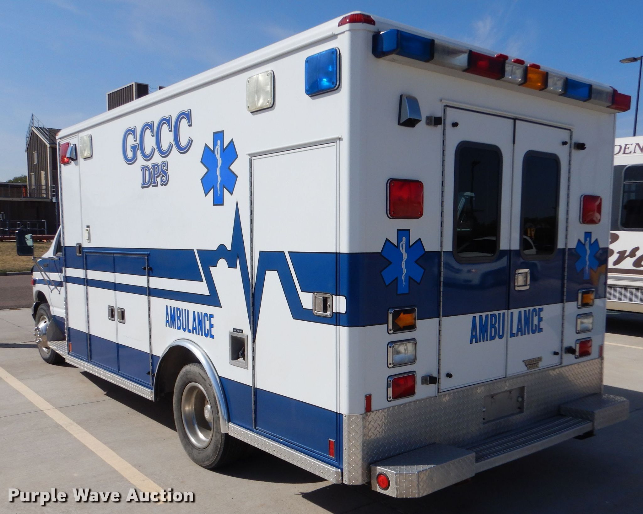 1996 Ford E350 ambulance. Miles: 106,406 on odometer, VIN: 1FDKE30F2THB10100. Engine Displacement: 7.3L V8 OHV, Cylinders: 8, Fuel type: Diesel. Transmission Automatic. Chassis Axles: Single, Suspension: Spring, Brakes: Hydraulic. Interior AC, Heat, Power windows, Power locks, Cruise control. Features Ambulance body PA/ siren controls, Oxygen hookups. Tires Size: LT225/75R16. Kansas title. Title distribution may be delayed up to 14 days from verification of funds. Garden City Community College. 801 Campus Drive. Garden City, KS 67846