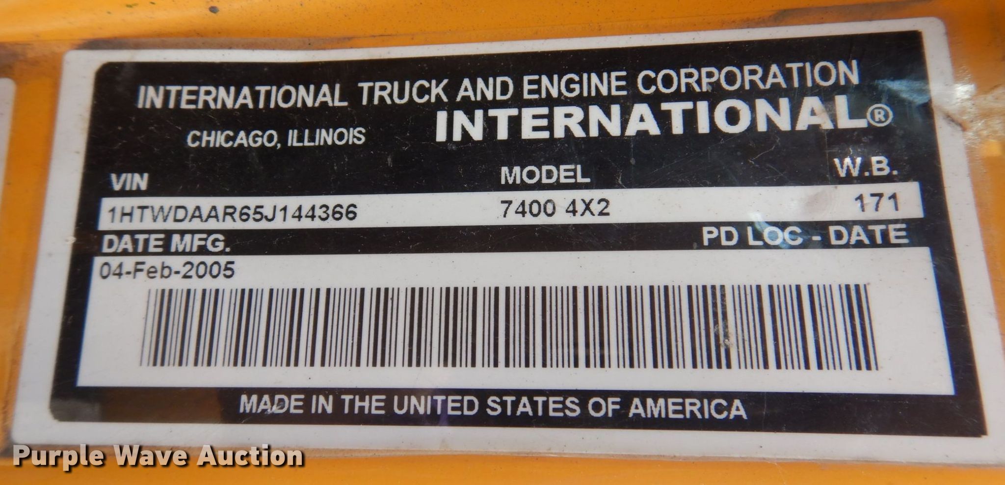 Purple Wave is selling a used Construction Dump Truck in Missouri. This item is a 2005 International 7400 dump truck with the following: Miles: 189,132 on odometer, Hours: 12,768 on meter, VIN: 1HTWDAAR65J144366, Unit #: 7341