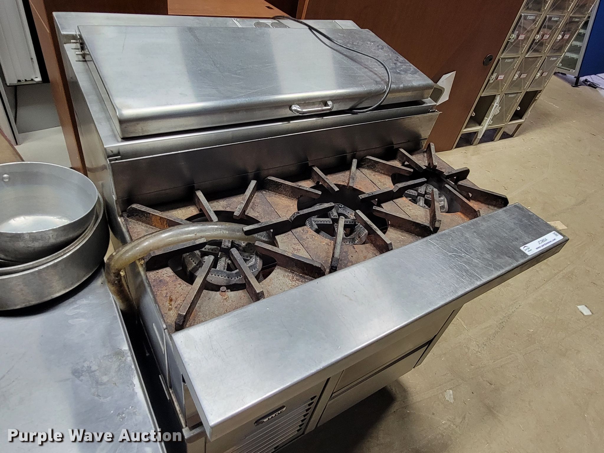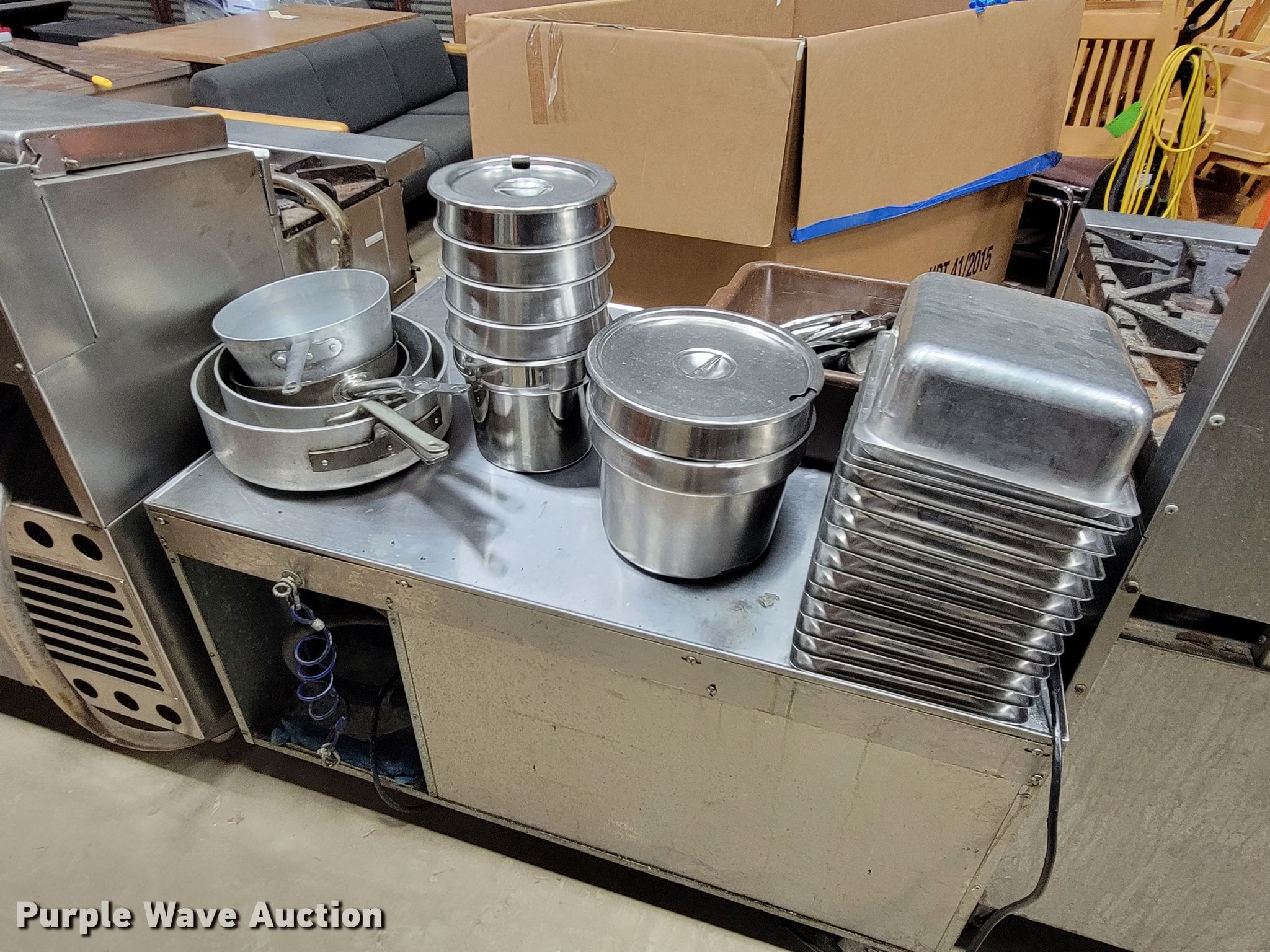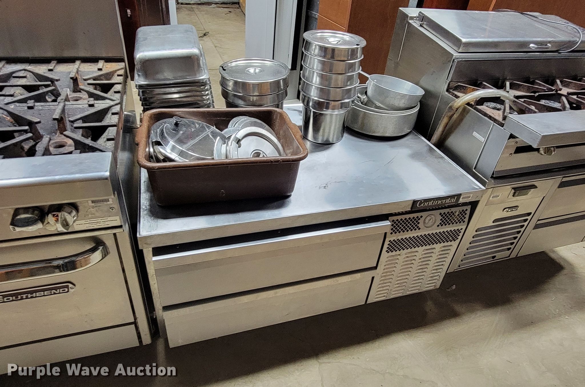 Purple Wave is selling a used Restaurant Equip. in South Dakota. This item is a Restaurant equipment with the following: South Bend four burner stove, Three burner stove, Continental freezer, Drink refrigerator, Steam table pans, Pots and pans