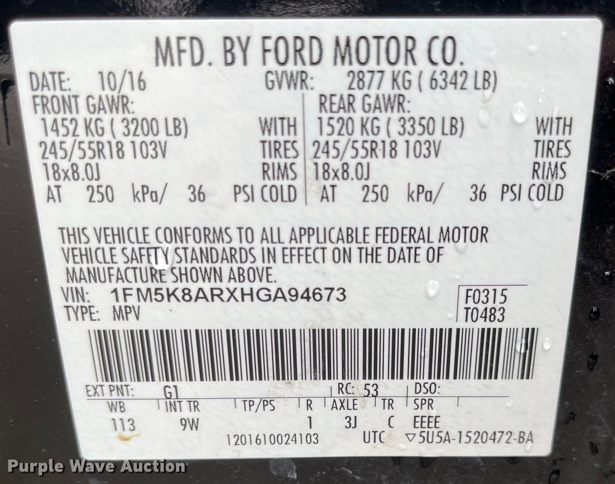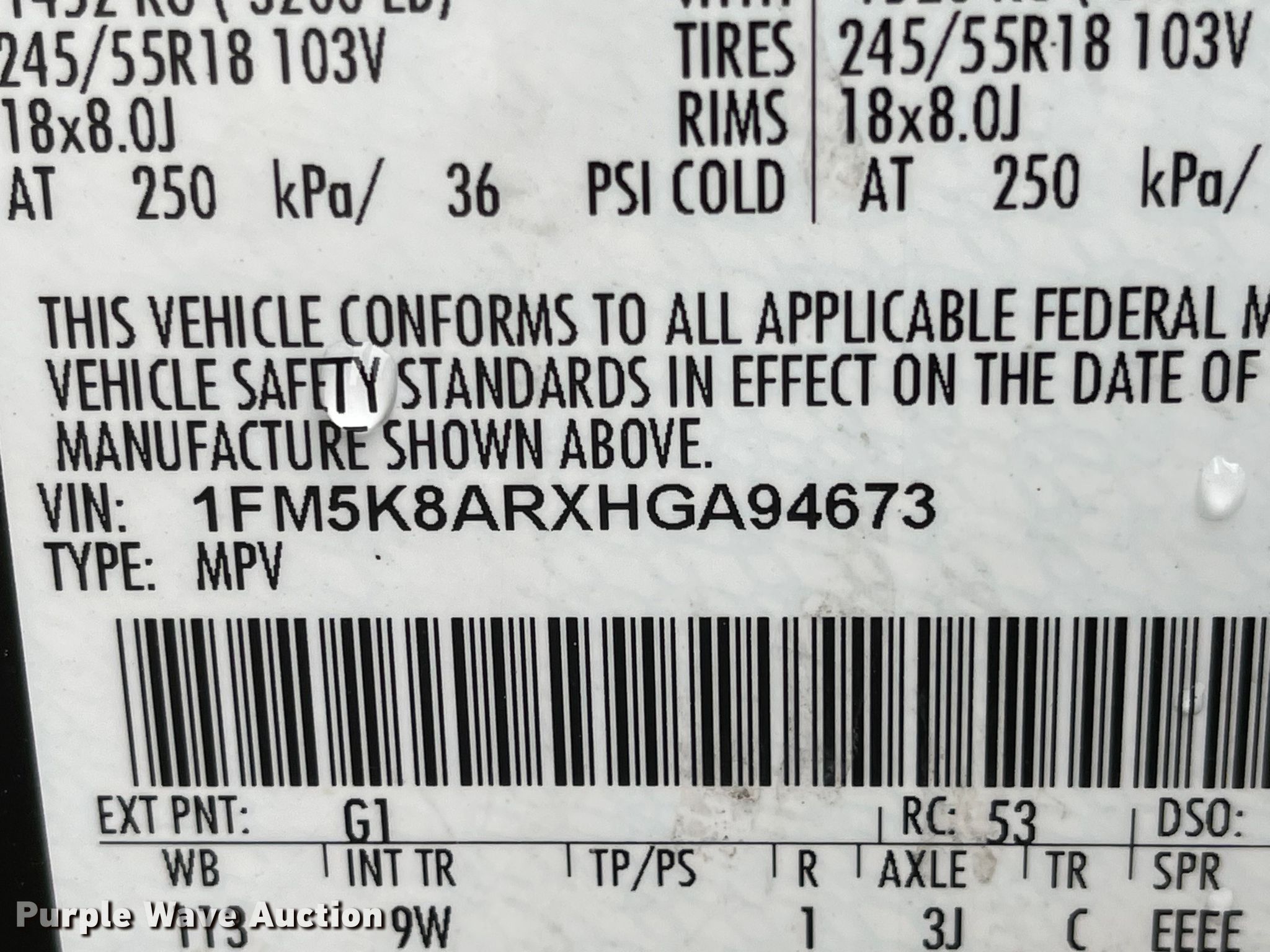 2017 Ford Explorer Police Interceptor SUV. Miles: 131,496 on odometer, VIN: 1FM5K8ARXHGA94673. Engine Displacement: 3.7L V6 DOHC, Cylinders: 6, Fuel type: Gas. Transmission Automatic, All wheel drive. Interior AC, Heat, Seat: Power driver, Power windows, Power locks, Cruise control, Backup camera. Tires Size: 245/55R18. Notes Center console missing. Kansas title. Title distribution may be delayed up to 14 days from verification of funds. City of Lenexa. 7700 Cottonwood St. Lenexa, KS 66216