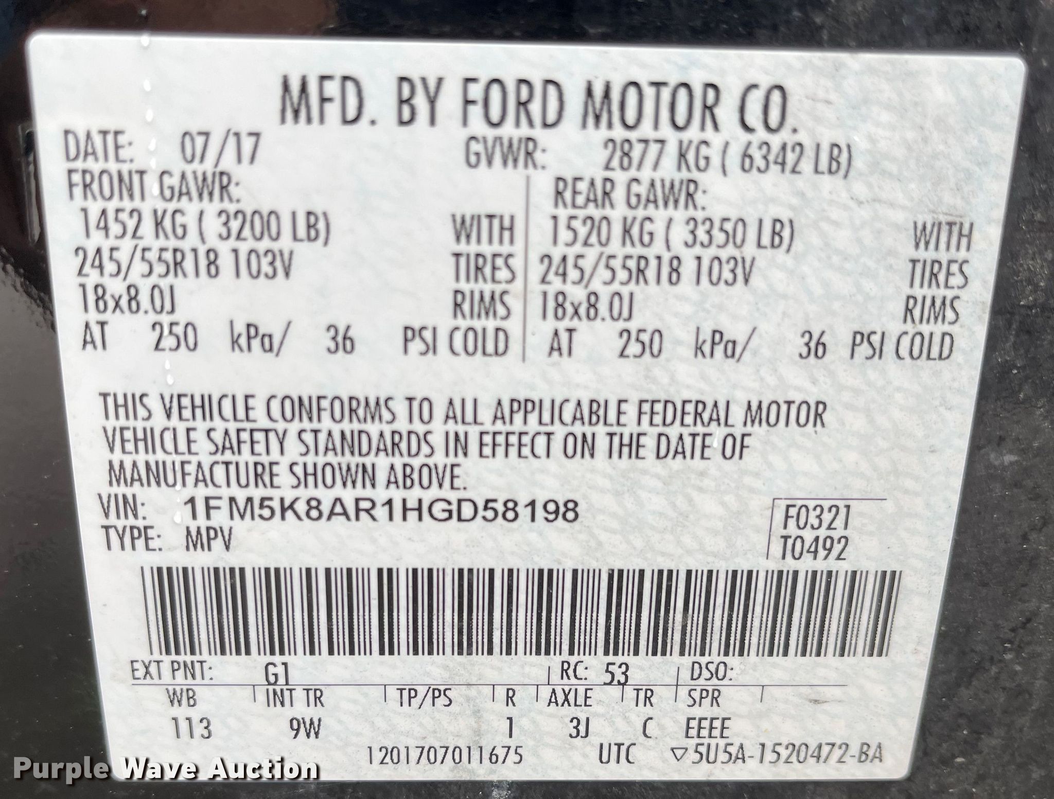 2017 Ford Explorer Police Interceptor SUV. Miles: 150,009 on odometer, VIN: 1FM5K8AR1HGD58198. Engine Displacement: 3.7L V6 DOHC, Cylinders: 6, Fuel type: Gas. Transmission Automatic, All wheel drive. Interior AC, Heat, Seat: Power driver, Power windows, Power locks, Cruise control, Backup camera. Tires Size: 245/55R18. Notes Interior partially disassembled Parts may be missing, Dash warning indicator: TPMS. Kansas title. Title distribution may be delayed up to 14 days from verification of funds. City of Lenexa. 7700 Cottonwood St. Lenexa, KS 66216