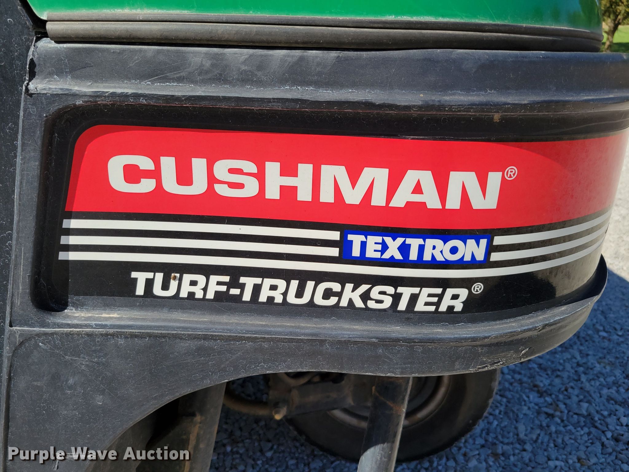 2000 Cushman Turf Truckster 898656 utility vehicle. Hours: 1,108 on meter, Serial: 00002327. Engine Cylinders: 3, Fuel type: Gas, HP: 32, kW: 24, Electric start. Transmission Manual, Speed: 4. Operators station Passengers: 2. Features Dump bed 48" L x 58" W, Dump bed type: Electric/ Hydraulic. Tires Front: 20x10.00-10, Rear: 24x13.00-12NHS. Transfer of ownership documentation will be a bill of sale. No title will be provided. Lincoln Golf/Parks & Rec. 3403 W Van Dorn Street. Lincoln, NE 68522