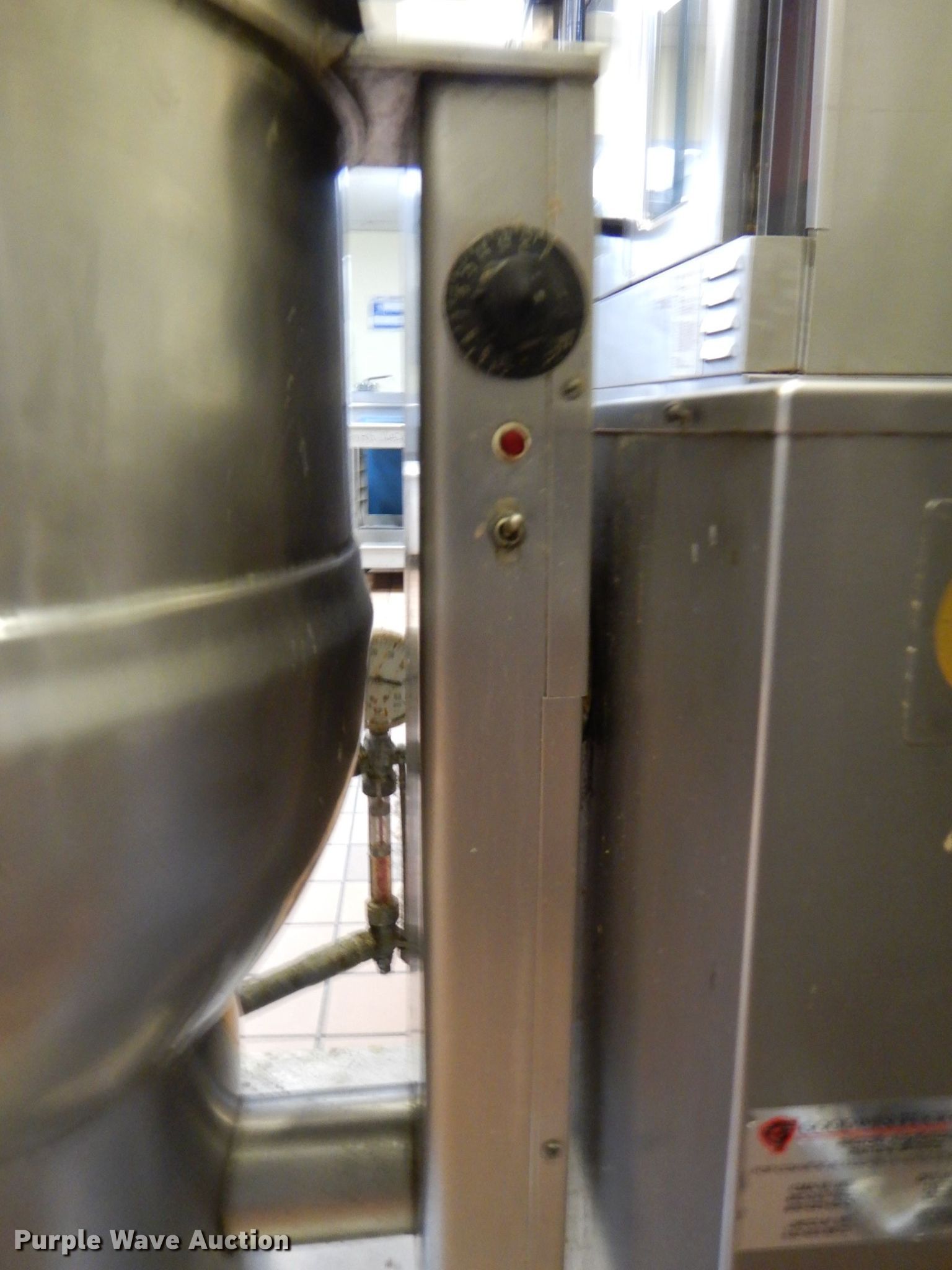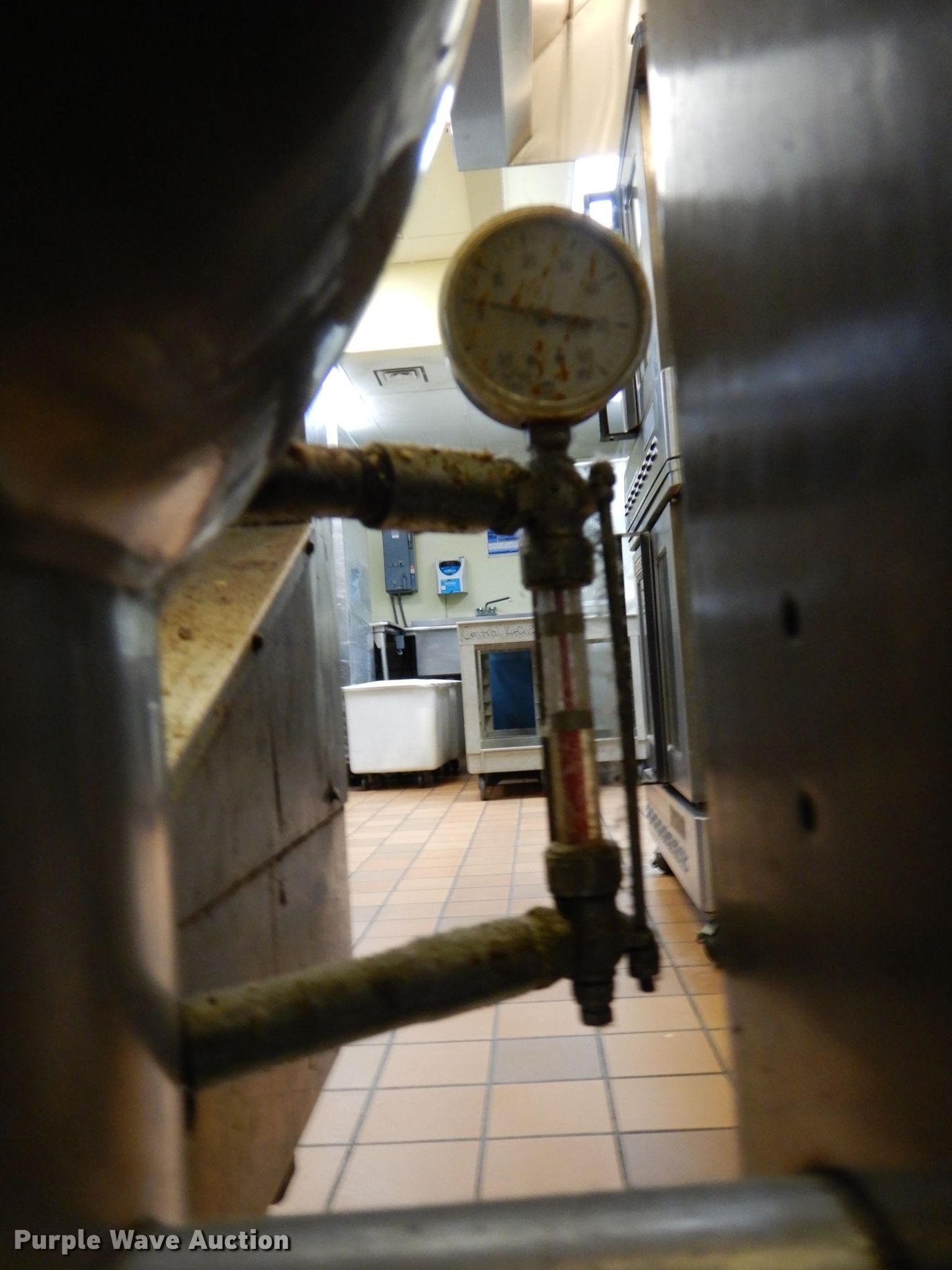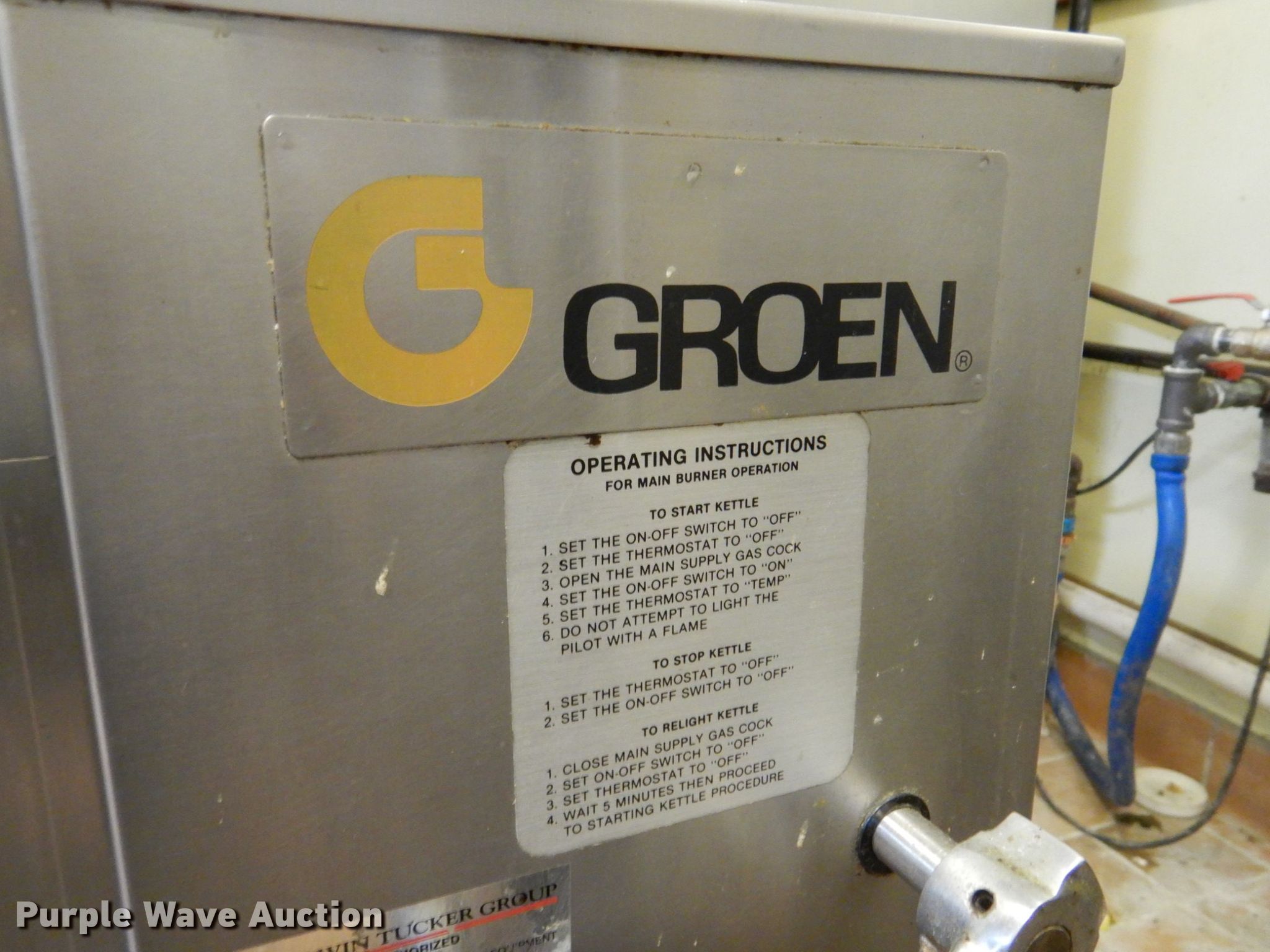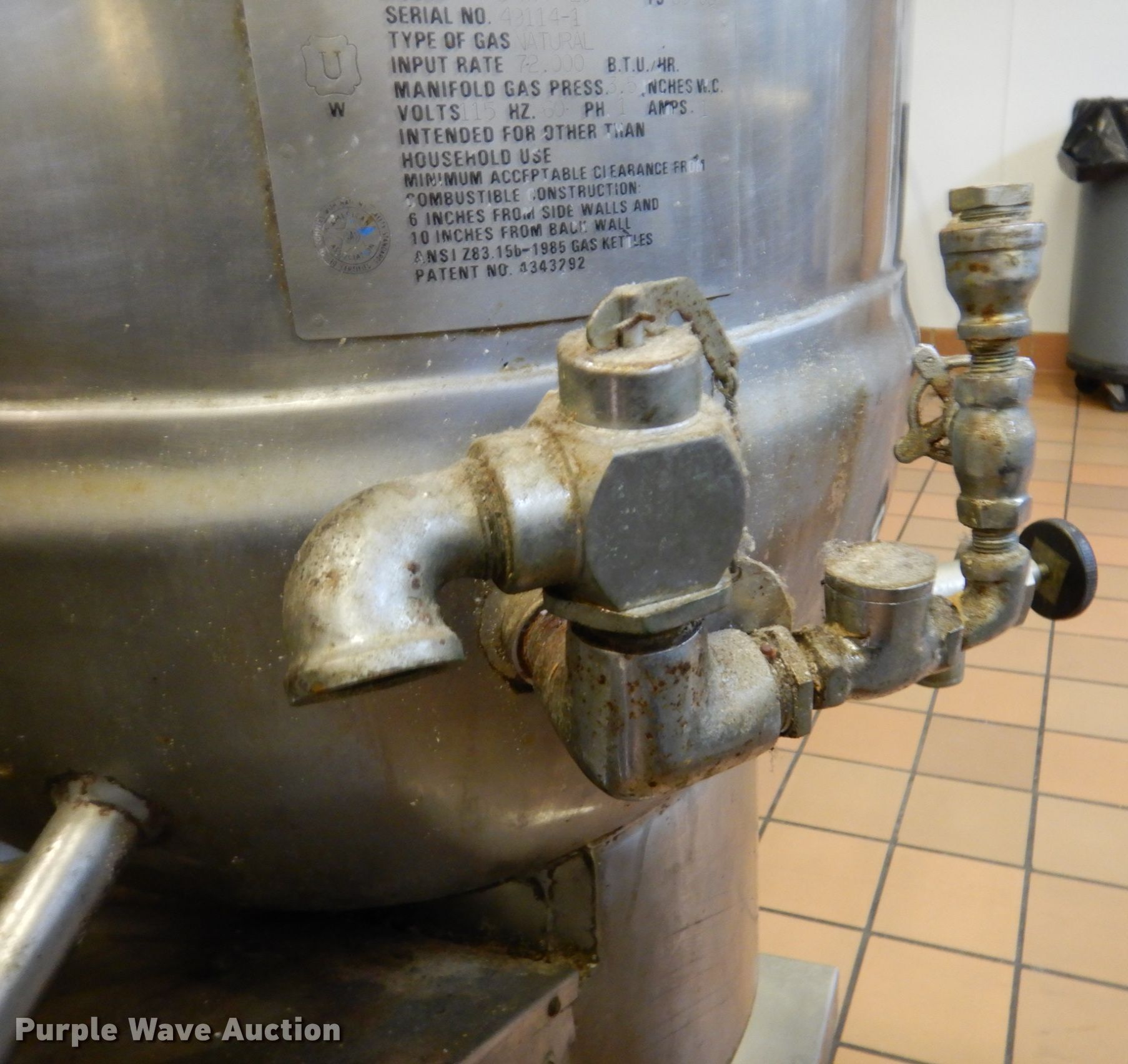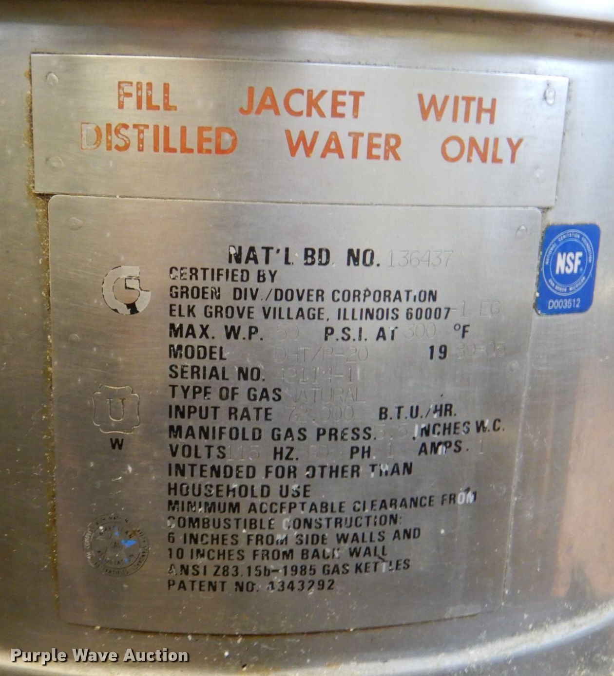 Purple Wave is selling a used Restaurant Equip. in Nebraska. This item is a 1989 Groen DHT/P-20 steam kettle with the following: 115V, Single phase, 60 gallon capacity, Natural gas fired, 72,000 BTU input, 60 Hz, 1 amp, Serial: 49114-1