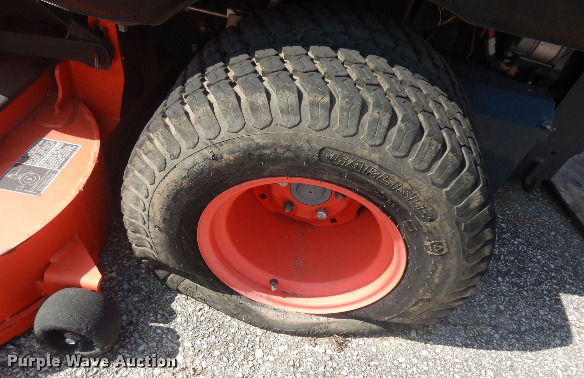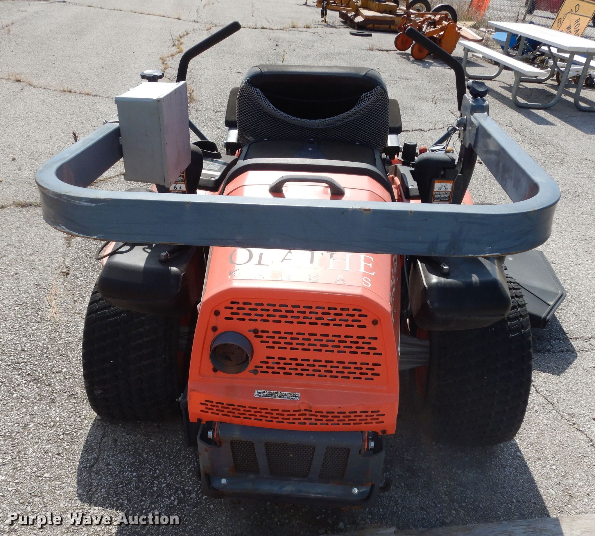 Kubota ZG332 ZTR lawn mower. Hours: 1,258 on meter, Cutting width: 72". Engine Kubota, Cylinders: 3, Fuel type: Gas. Transmission Hydrostatic. Tires Front: 15x6.00-6/4.60, Rear: 26x12.00-12, Brand: ZPR. Notes No keys, Deck wheel missing, Flat tires, Unknown operating condition. City of Olathe. Olathe, KS 66061