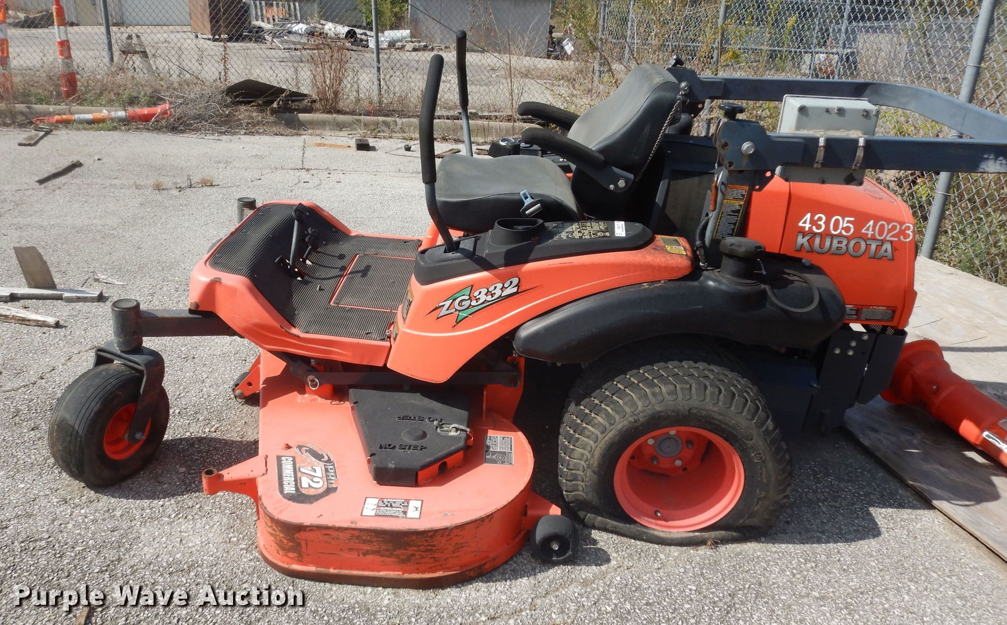Purple Wave is selling a used Commercial Turf Mower in Kansas. This item is a Kubota ZG332 ZTR lawn mower with the following: Hours: 1,258 on meter, Cutting width: 72"