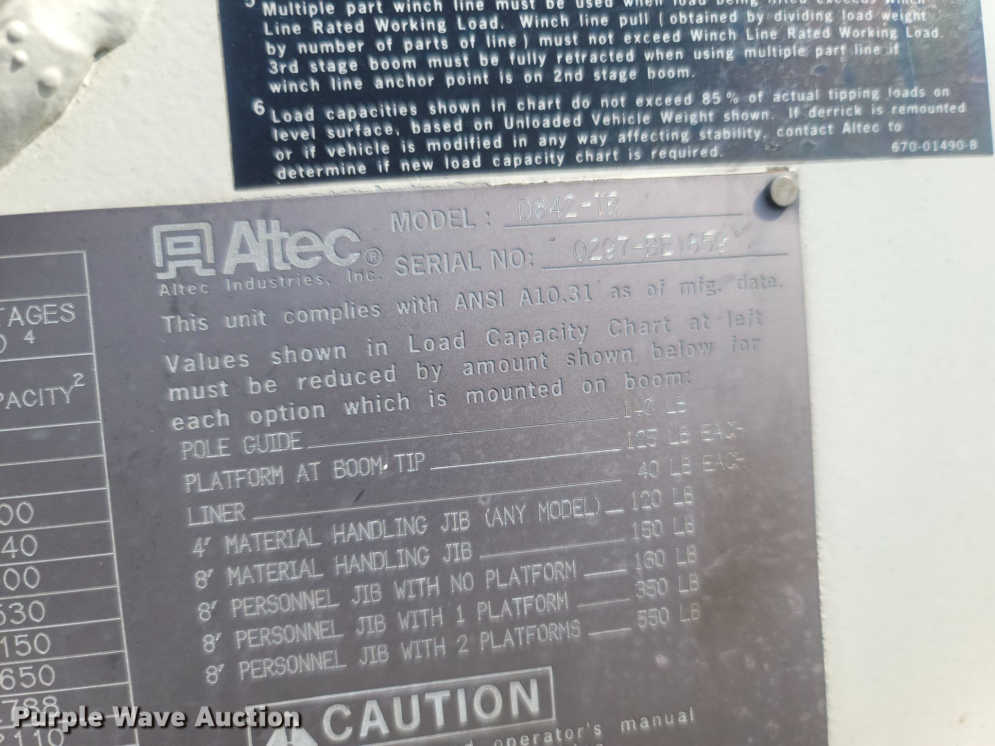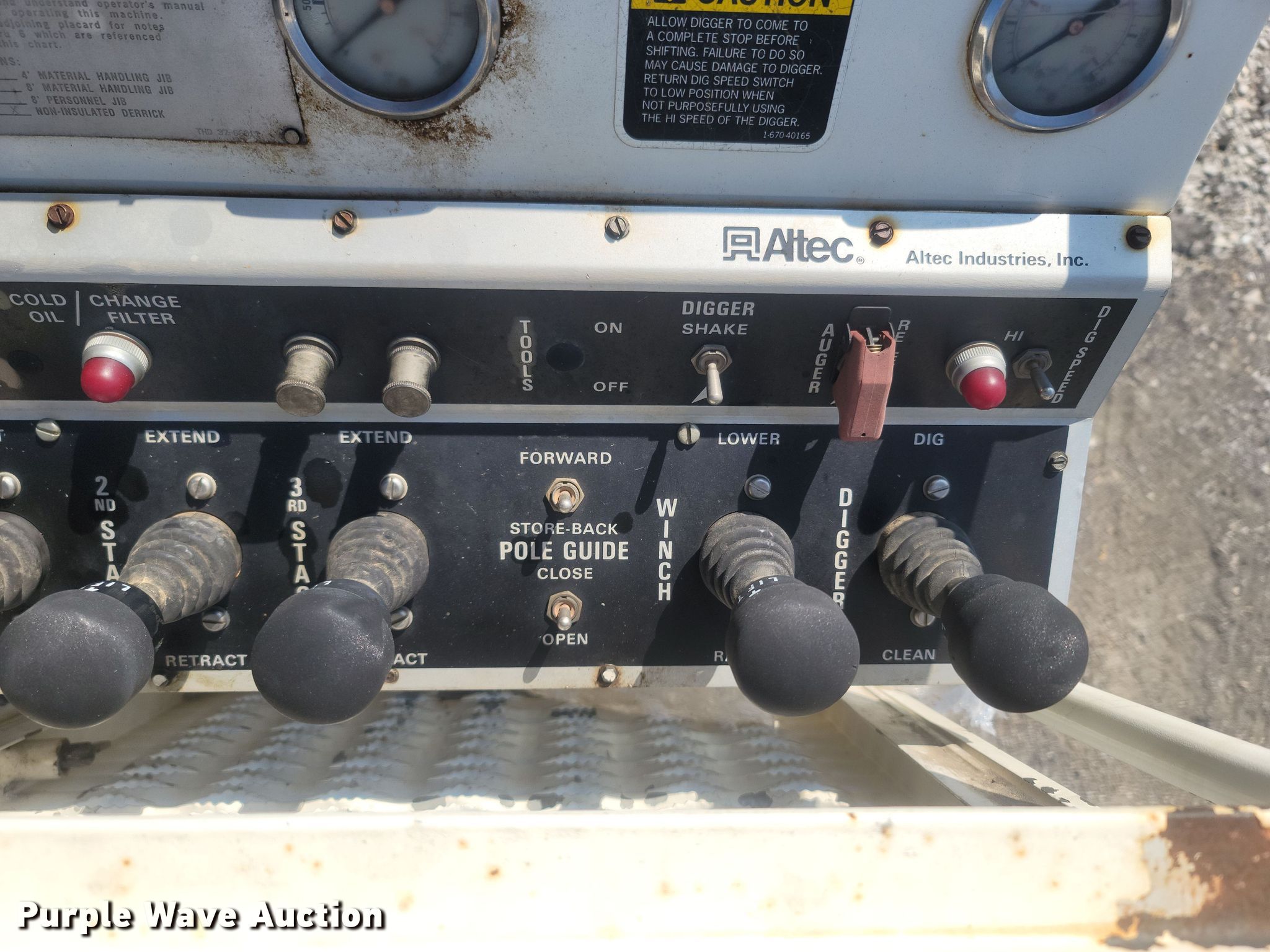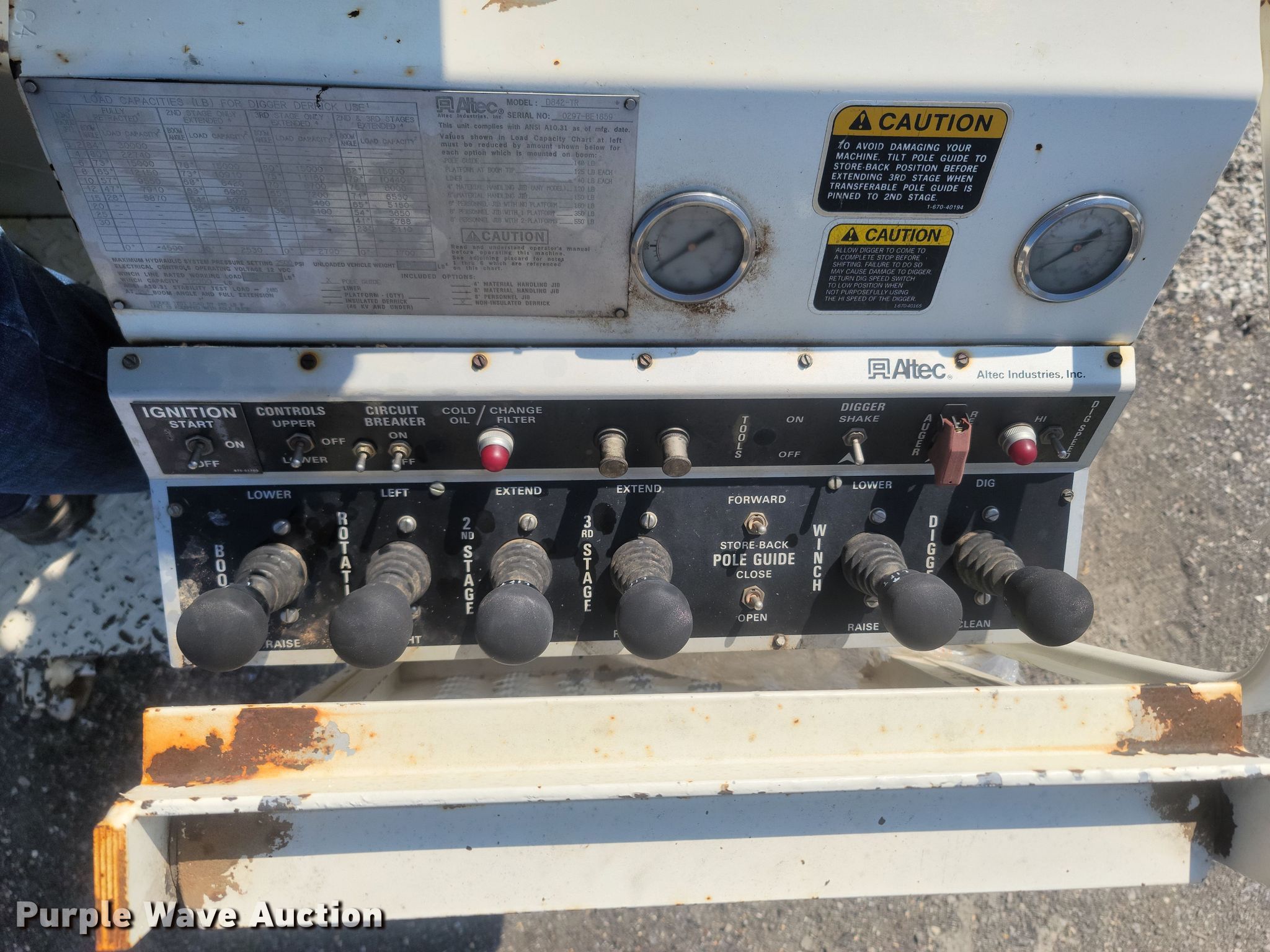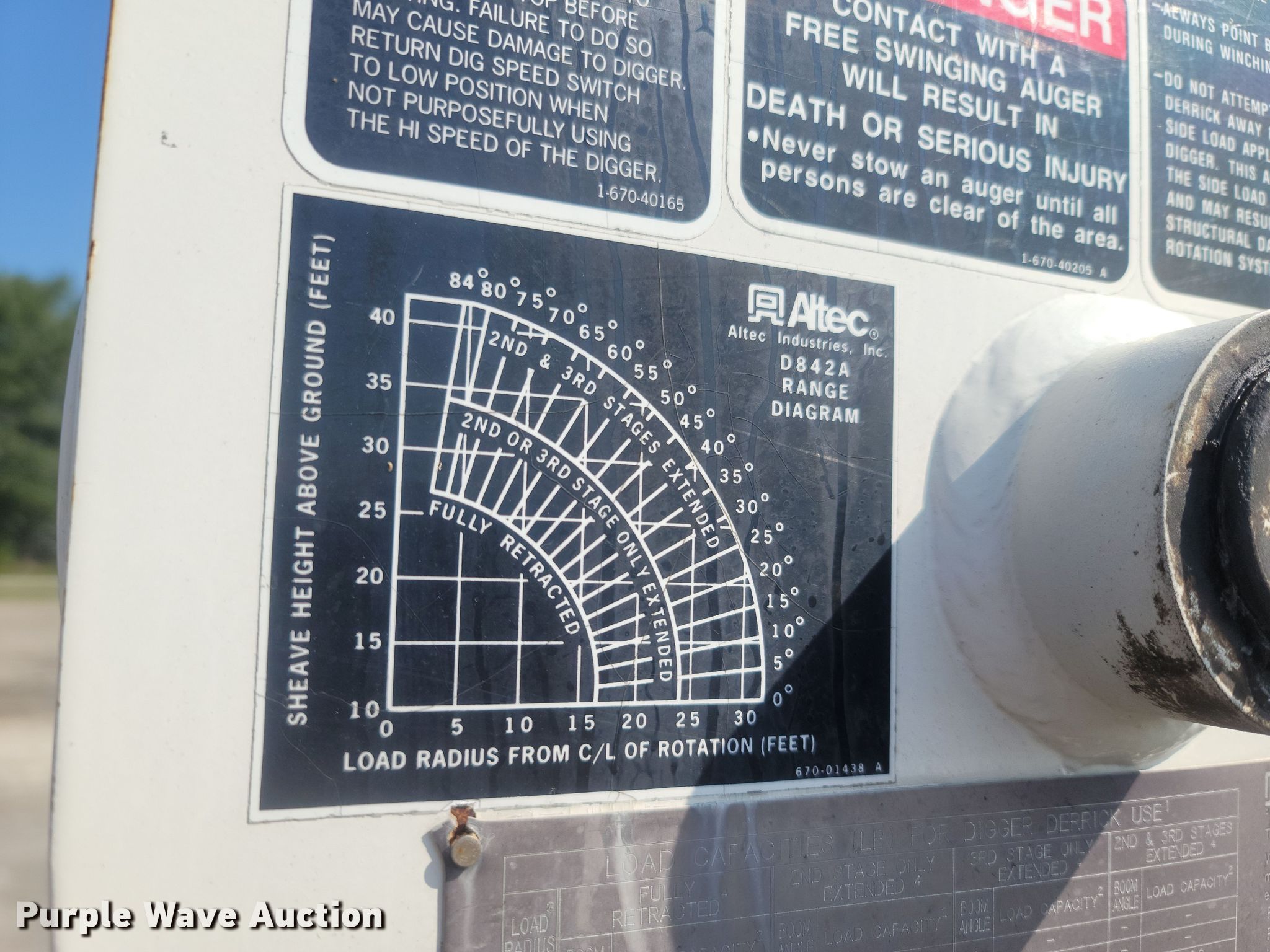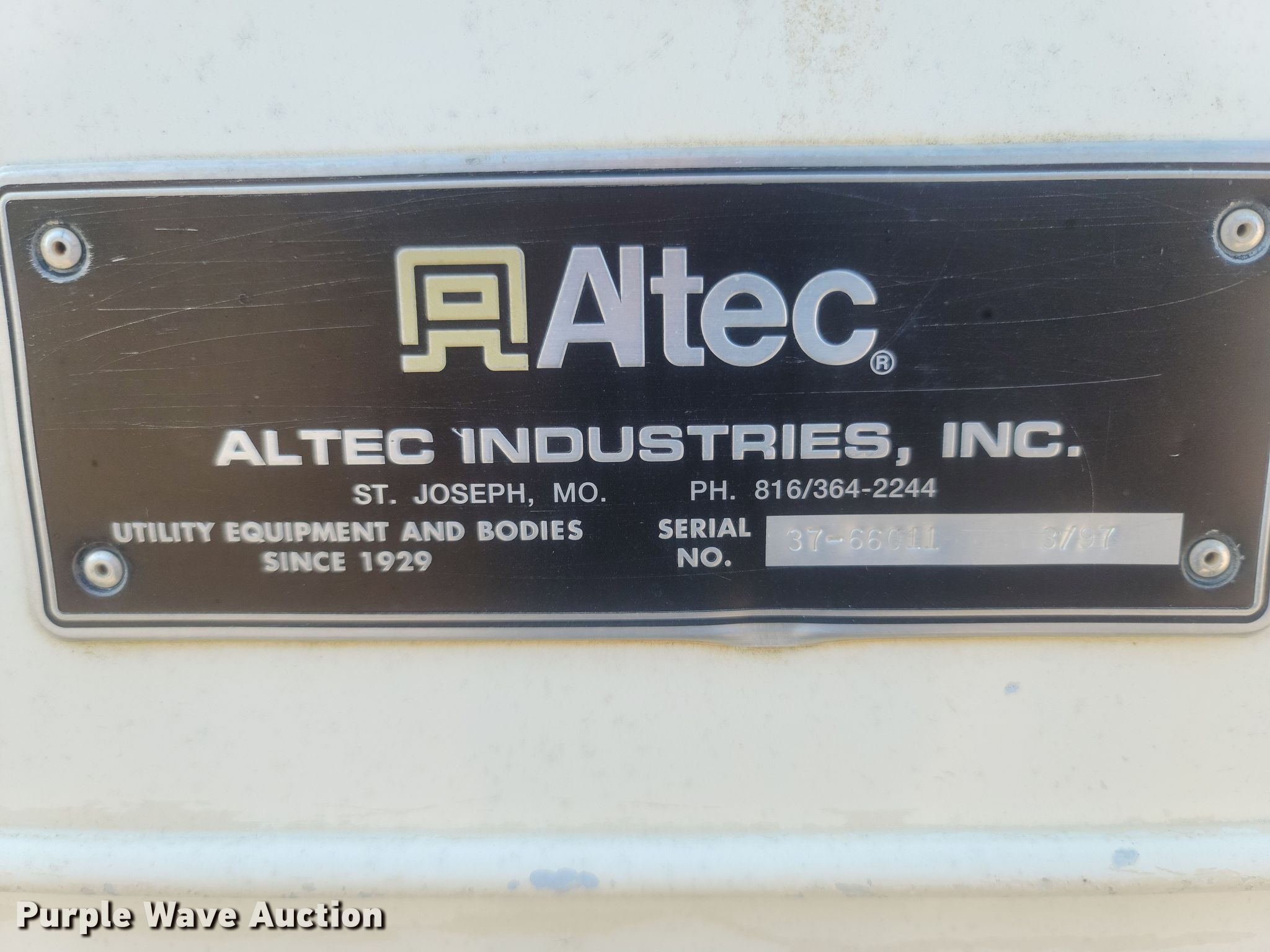1997 Ford F800 digger derrick truck. Miles: 16,935 on odometer, VIN: 1FDXF80C5VVA39338. Engine Cummins, Displacement: 5.9L, Cylinders: 6, Fuel type: Diesel. Transmission Allison, Automatic. Chassis Axles: Single, Suspension: Spring, Brakes: Air, PTO, GVWR: 33,000 lbs. Interior AC, Heat. Features Bed ALTEC, Serial: 37-660LL, 12' L x 94" W, Boom Altec D842-TR, Serial: 0297-BE-1859, Boom length: 30', Mast height: 40', Maximum lift capacity: 30,000 lbs, Maximum lift height: 40', Boom type: Telescopic, Boom controls Ground, Platform/ basket, Pole guide, Auger Diameter: 18".. Tires Size: 11R22.5. Notes Unknown operating condition of AC, Winch rope missing. Missouri title. City of Salem, MO. 400 North Iron Street. Salem, MO 65560