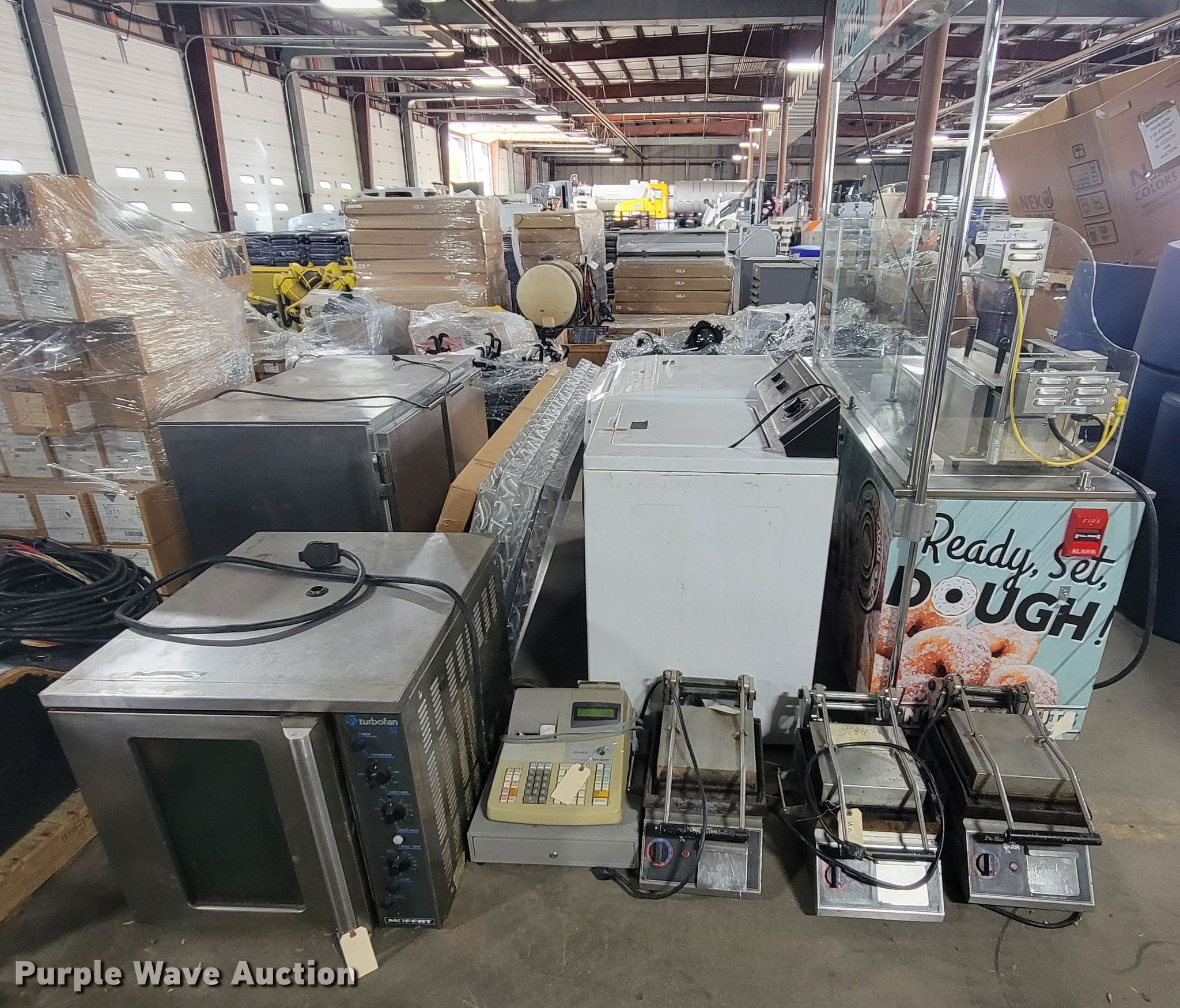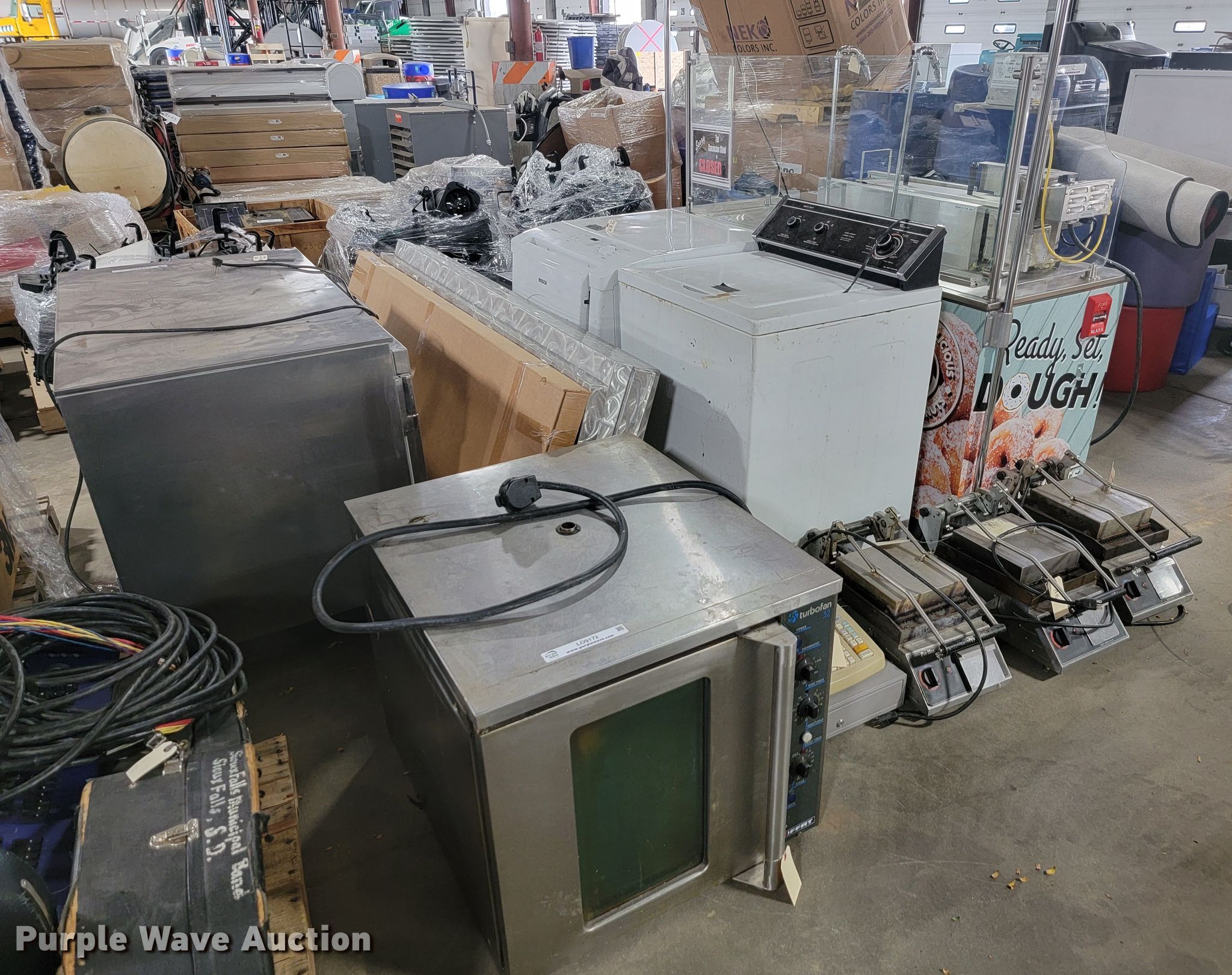 Purple Wave is selling a used Restaurant Equip. in South Dakota. This item is a Restaurant equipment with the following: Beverage-Air refrigerator, (5) stainless steel counter tops, Toastmaster warmer, Washer, Dryer, Doughnut cart, (3) Pro-Max presses, Cash register, Turbofan 32 oven