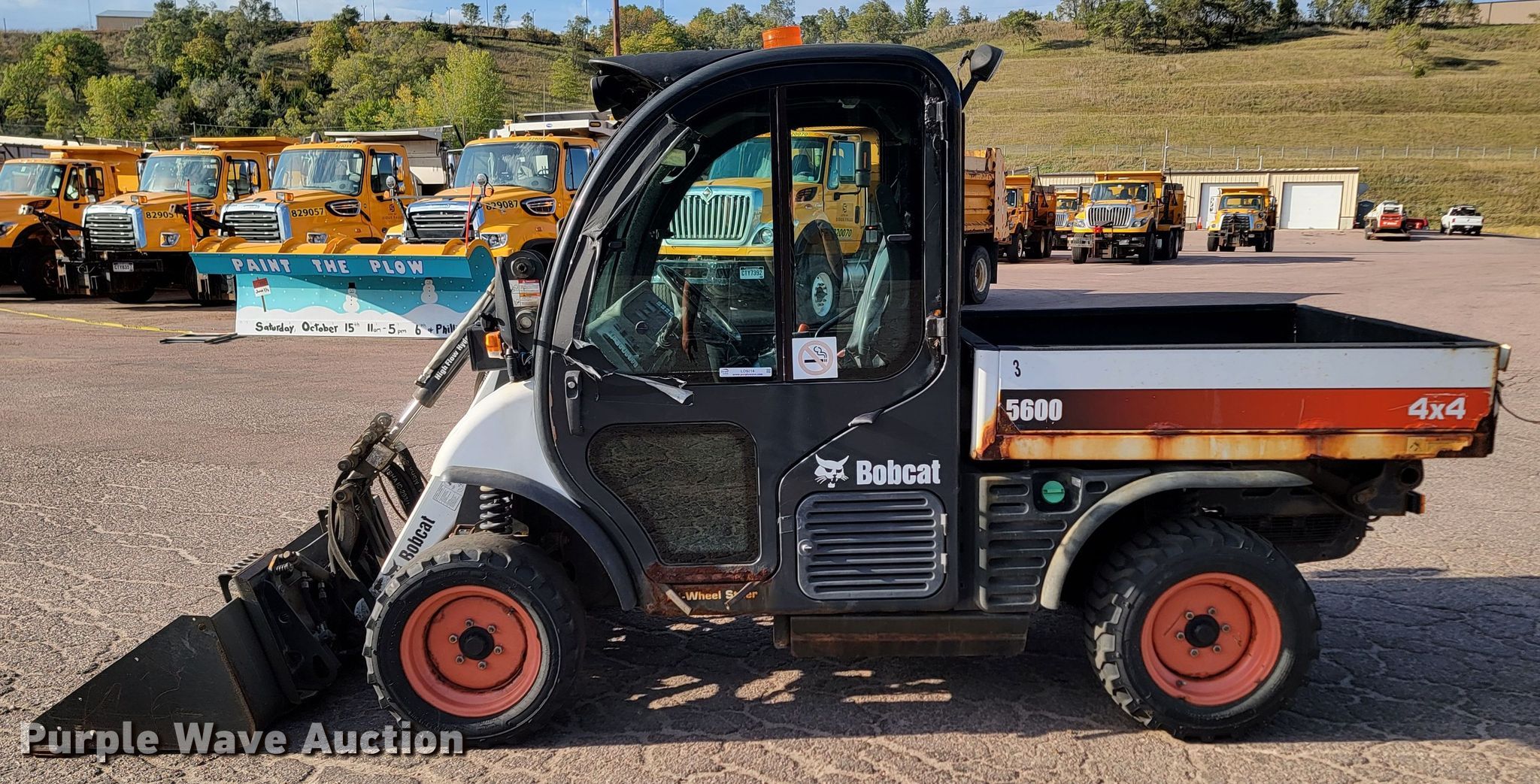 2012 Bobcat Toolcat 5600 utility vehicle. Hours: 4,879 on meter, Serial: A94Y12262. Engine Kubota, Cylinders: 4, Fuel type: Diesel. Transmission Hydrostatic. Chassis Four wheel drive. Operators station Enclosed cab, AC, Heat. Features Receiver hitch, Dump bed 57" L x 58" W, Dump bed type: Electric/ Hydraulic, Tool carrier Auxiliary hydraulics, Auxiliary electrical outlet, Quick coupler: Hydraulic, Bucket Width: 60", Cutting edge: Bolt-on.. Tires Size: 27x10.50-15. Transfer of ownership documentation will be a bill of sale. Sioux Falls Street Department - Open inspection Oct. 21. 1000 E Chambers St.. Sioux Falls, SD 57104