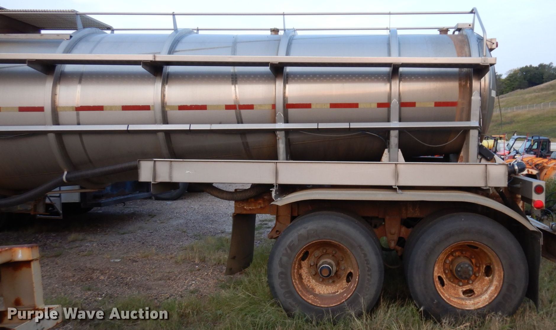 1998 Arco tank trailer. VIN: 1A911422XW1005060. Dimensions Overall: 40' 8" L x 8' W. Features Tank type: Stainless steel, Compartments: 1, Outlet valves: 2 Size: 7", Relief valve size: 3", No. of manways/manholes: 1 Width: 18", Full length walkway. Chassis Landing gear: Dual, Suspension: Spring, Brakes: Air, Axles: Tandem. Tires Steel wheels, Size: 11R22.5. Notes Unknown operating condition. South Dakota title. Sioux Falls Street Department - Open inspection Oct. 21. 1000 E Chambers St.. Sioux Falls, SD 57104