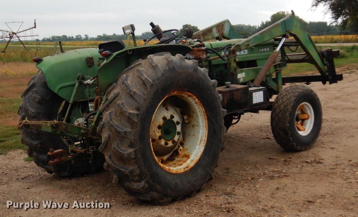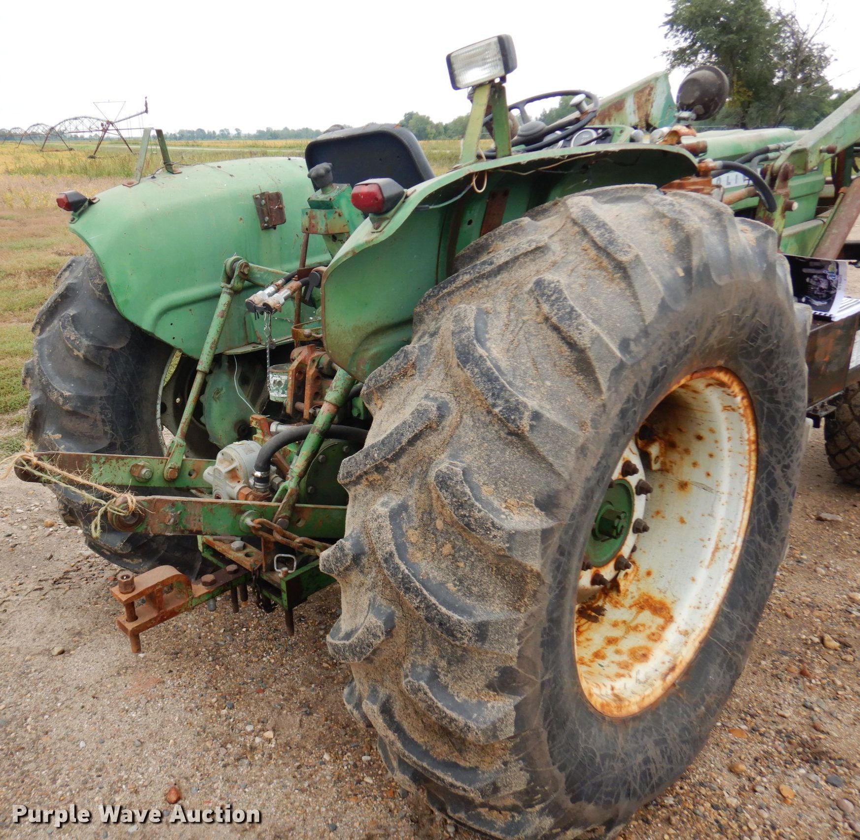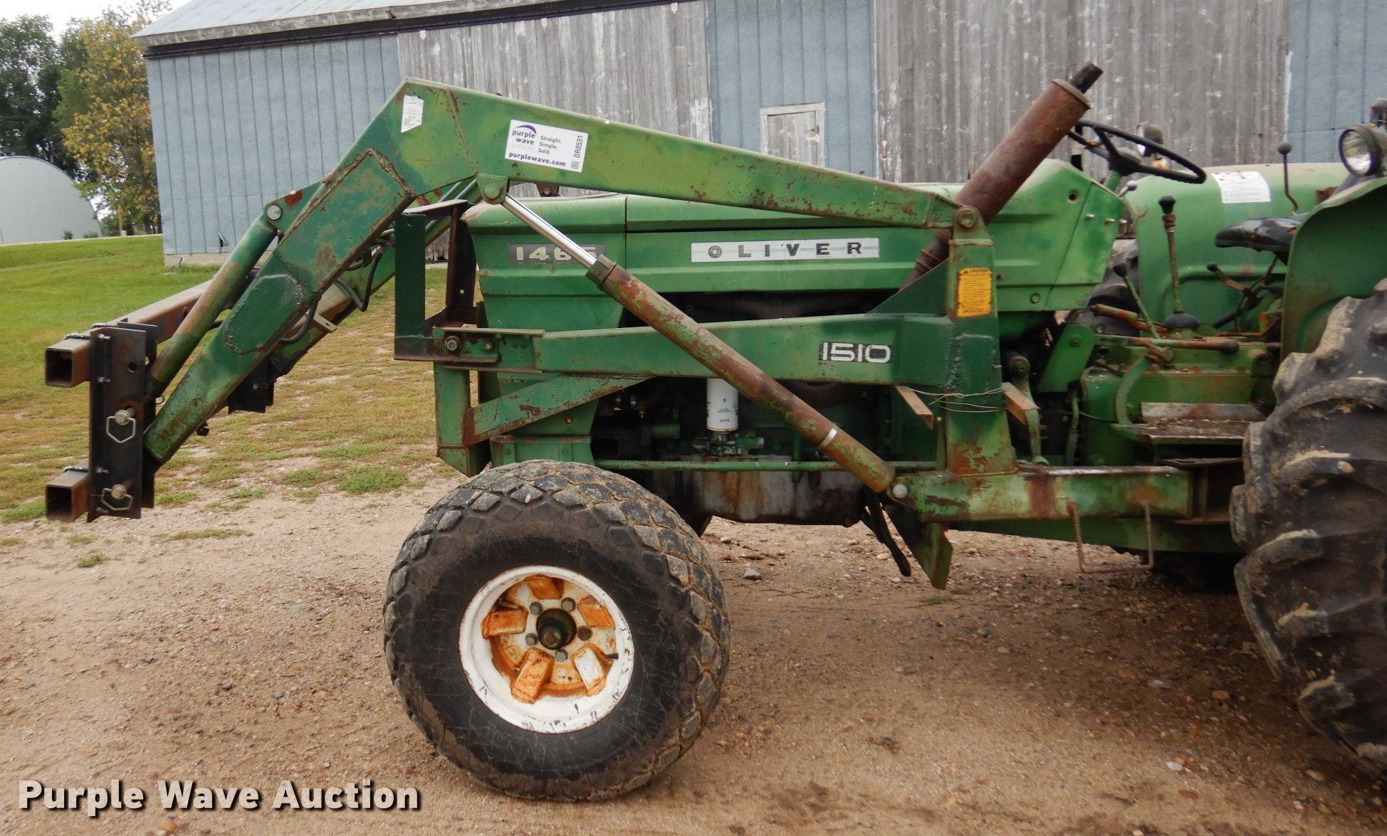 1974 Oliver 1465 tractor. Hours: 3,727 on meter, Serial: 839242. Engine Cylinders: 4, Fuel type: Diesel. Transmission Manual, 8F - 2R. Features PTO: 540, Three point, Hydraulic remote sets Front: 1, Loader Model: 1510, Controls: Two lever, Push bar: 5' W x 1' 7" H. Tires Front: 12.4-16, Rear: 18.4-30. Notes Fuel leak, Hydraulic leak. 10900 270th Ave NE. Belgrade, MN 56312