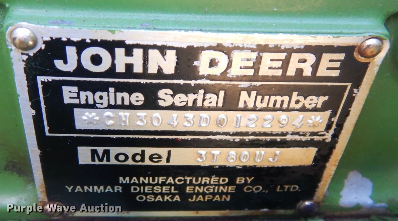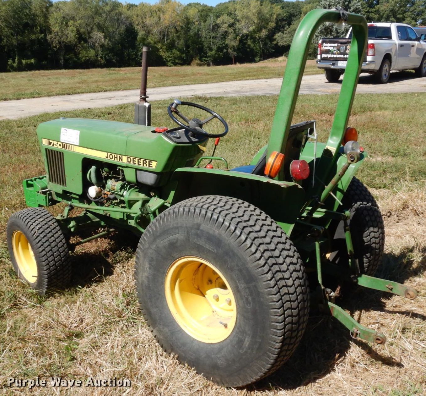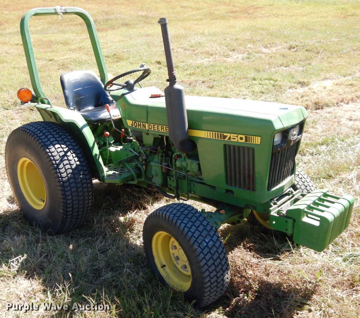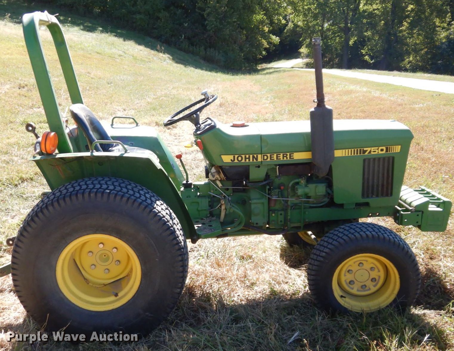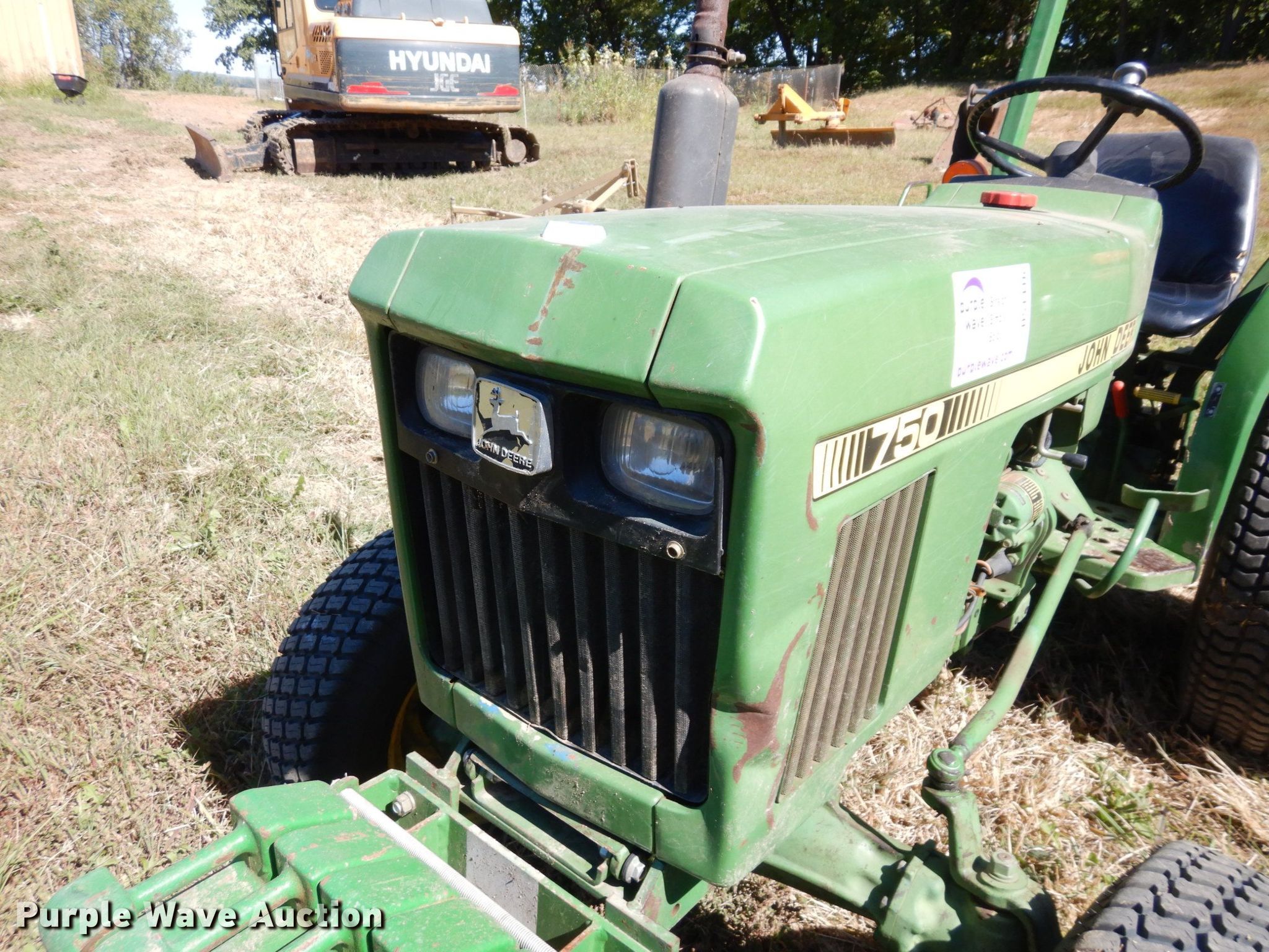 1985 John Deere 750 MFWD tractor. Hours: 1,351 on meter, Serial: CH0750S013918. Engine John Deere 3T80UJ, Serial: CH3043D012294, Cylinders: 3, Fuel type: Diesel. Transmission Manual, 8F - 2R, Differential lock. Features PTO: 540, Three point Top link, Suitcase weights: 5. Tires Front: 215/65-14, Rear: 13.6-16. Kansas City, KS 66109