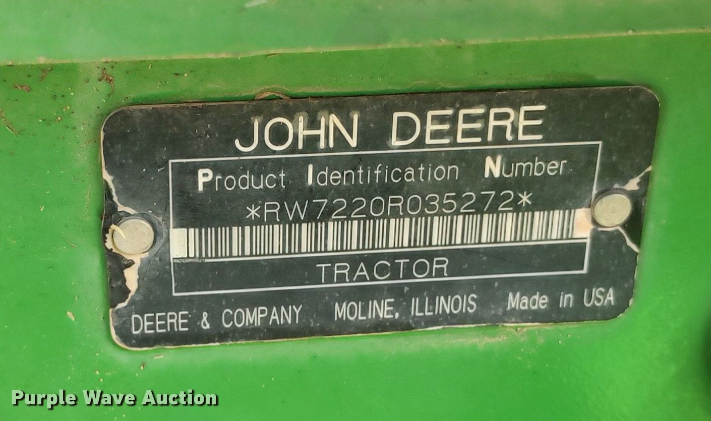 Purple Wave is selling a used Tractor in Oklahoma. This item is a 2005 John Deere 7220 MFWD tractor with the following: Hours: 6,075 on meter, Serial: RW7220R035272, Claim #: 2-811676
