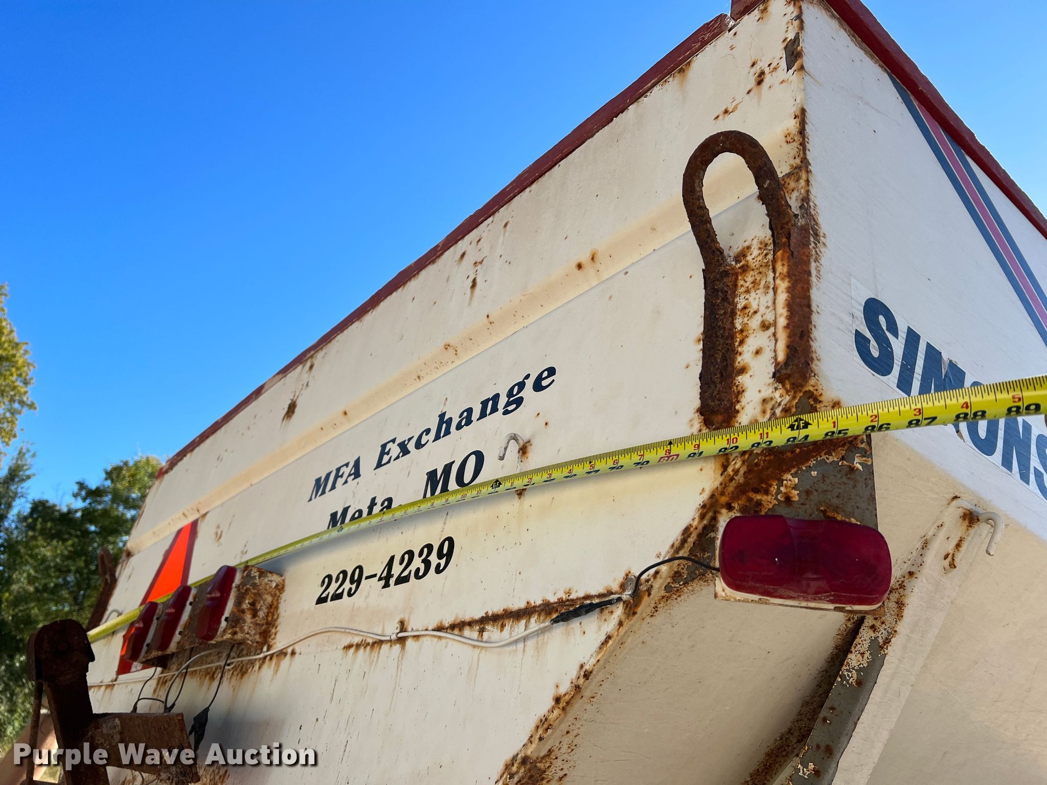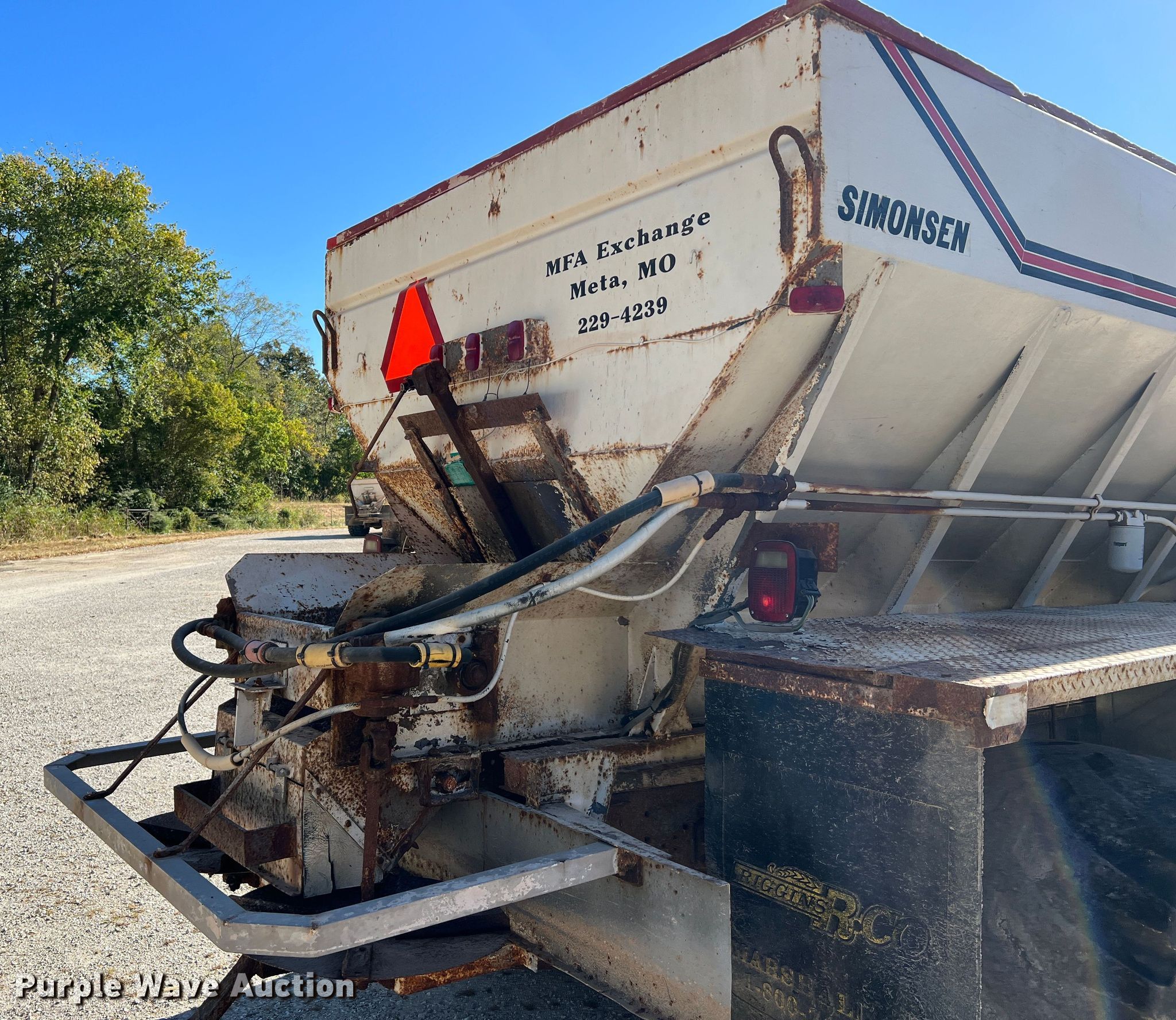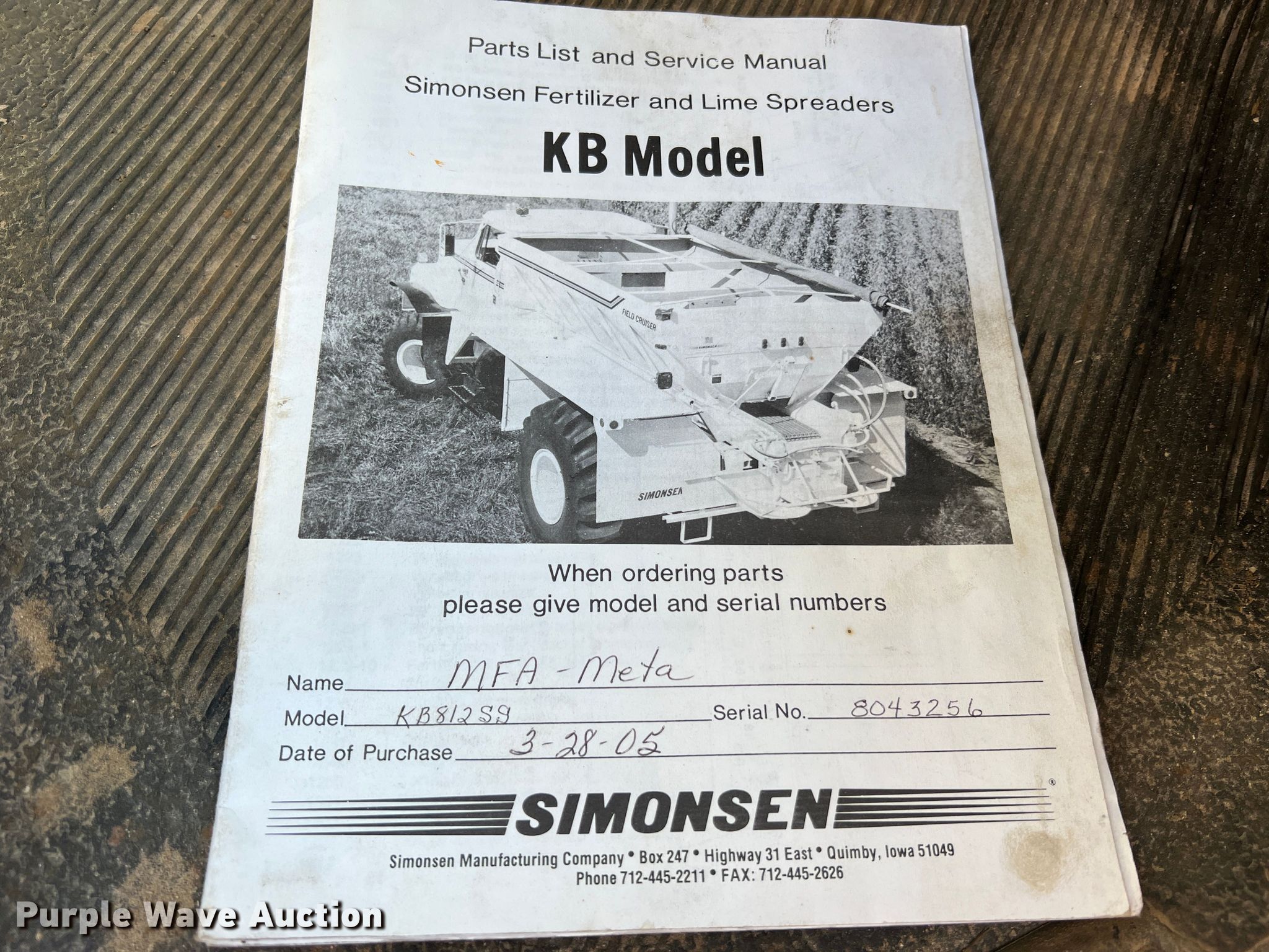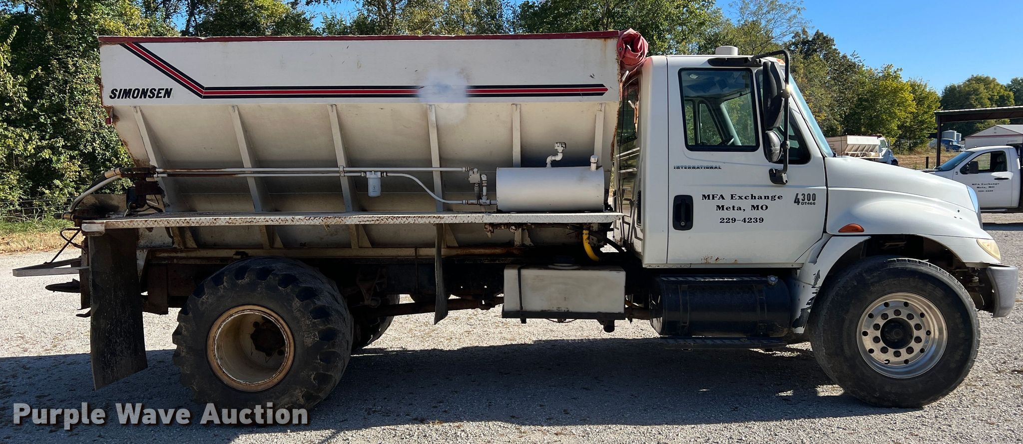 2005 International 4300 applicator truck. Miles: 224,408 on odometer, Engine hours: 13,105 on meter, VIN: 1HTMMAAN25H132176. Engine International DT466, Displacement: 7.6L, Cylinders: 6, Fuel type: Diesel. Transmission Eaton Fuller, Manual, Speed: 6. Operators station AC, Heat. Features Dry fertilizer spreader bed Simonsen KB812SS, Serial: 8043256, Length: 12', Dual spinners, Roll tarp, Conveyor belt Width: 20".. Tires Front: 385/65R22.5, Rear: 48X31.00-20, Flotation tires. Notes Dead battery. Missouri title. MFA Exchange Meta. 501 West Fourth Street. Meta, MO 65058