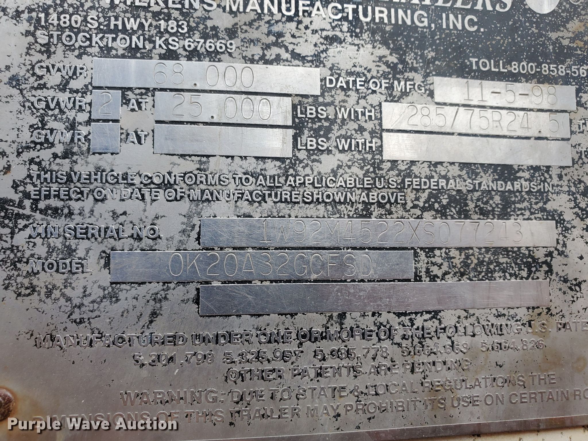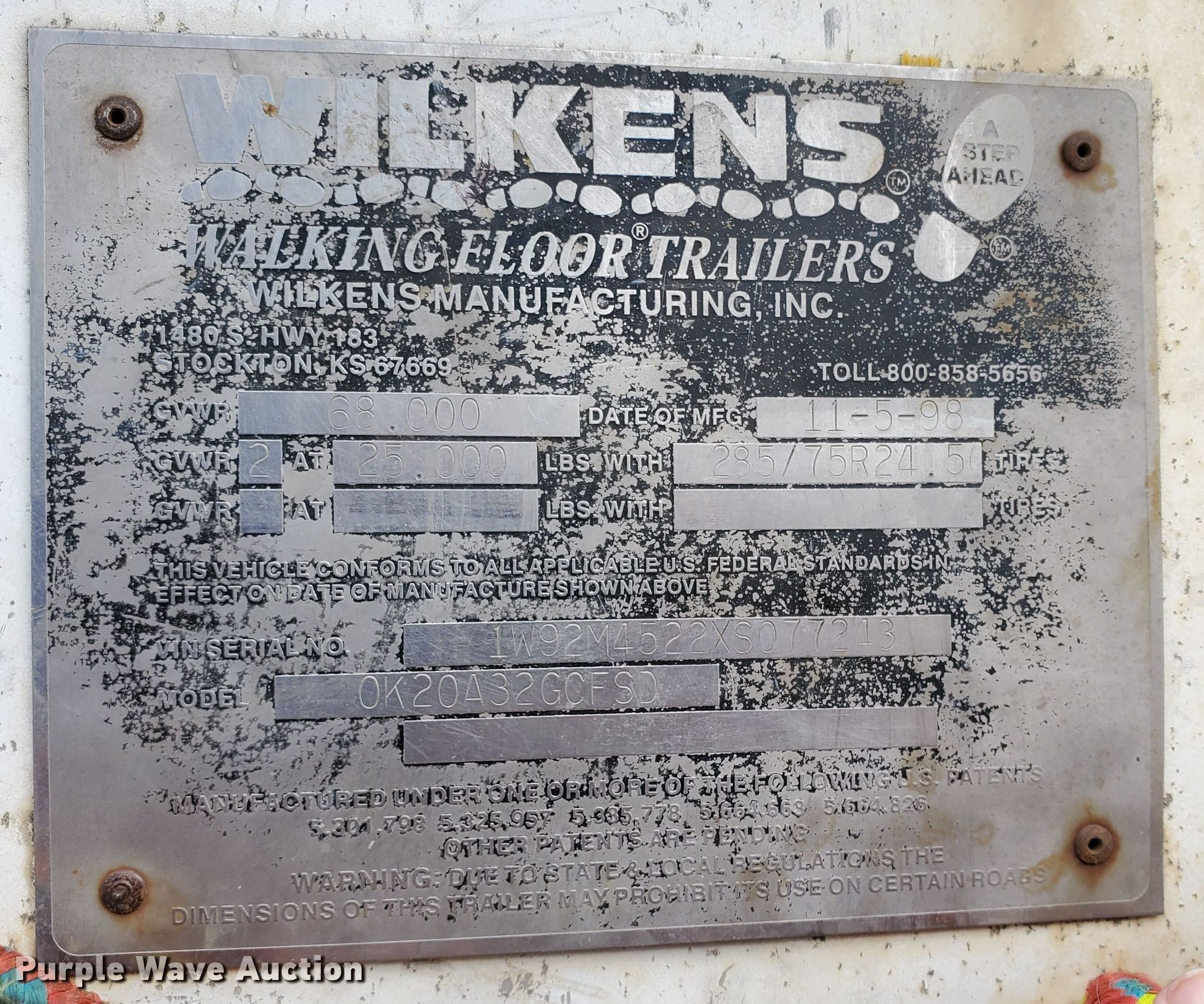 Purple Wave is selling a used Grain or Commodity Trailer in Kansas. This item is a 1999 Wilkens OK20A32GCFSD walking floor trailer with the following: VIN: 1W92M4522XS077243