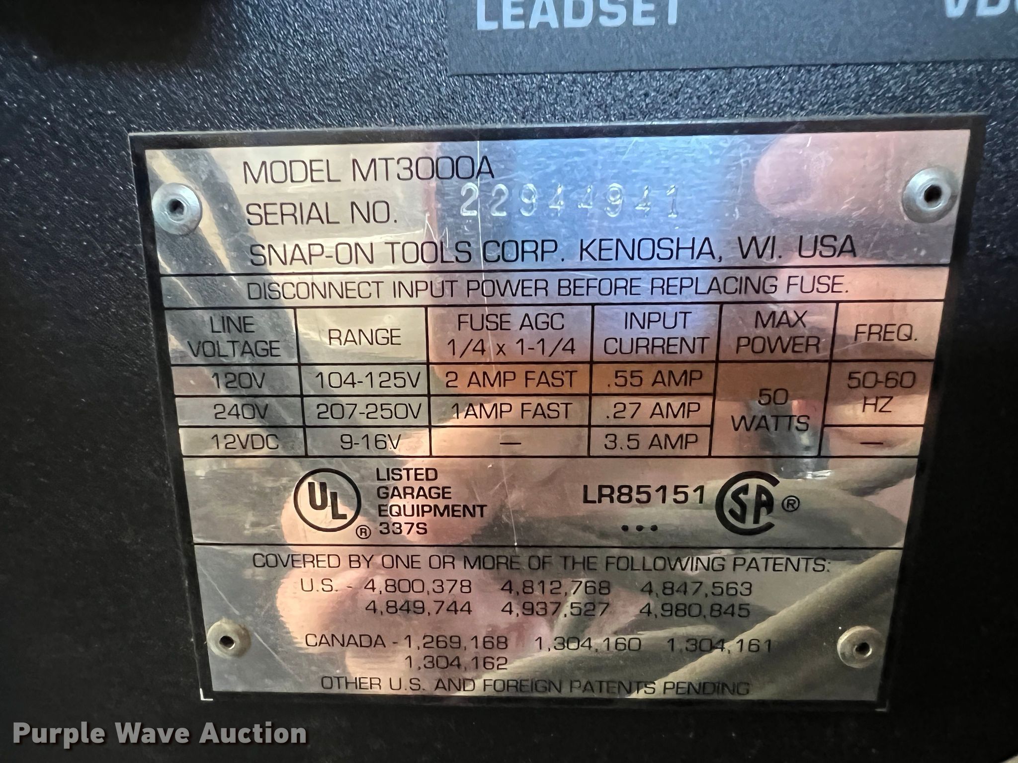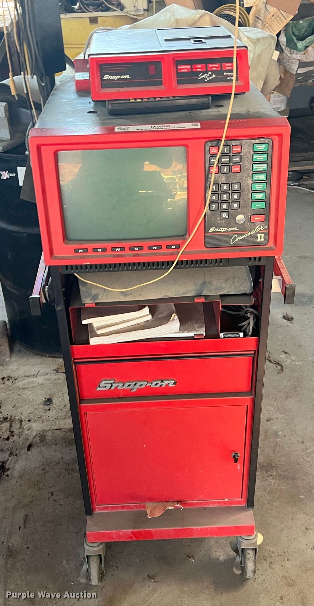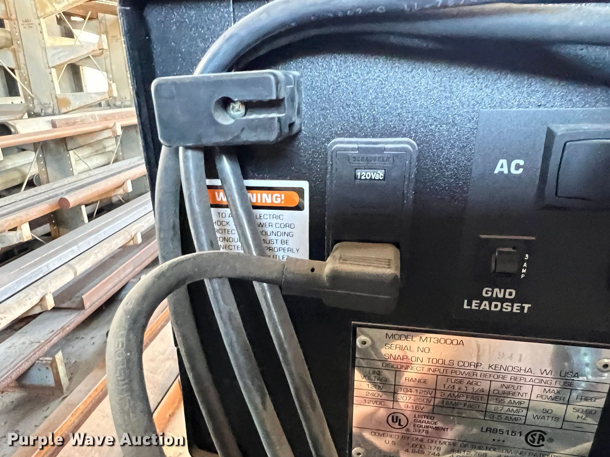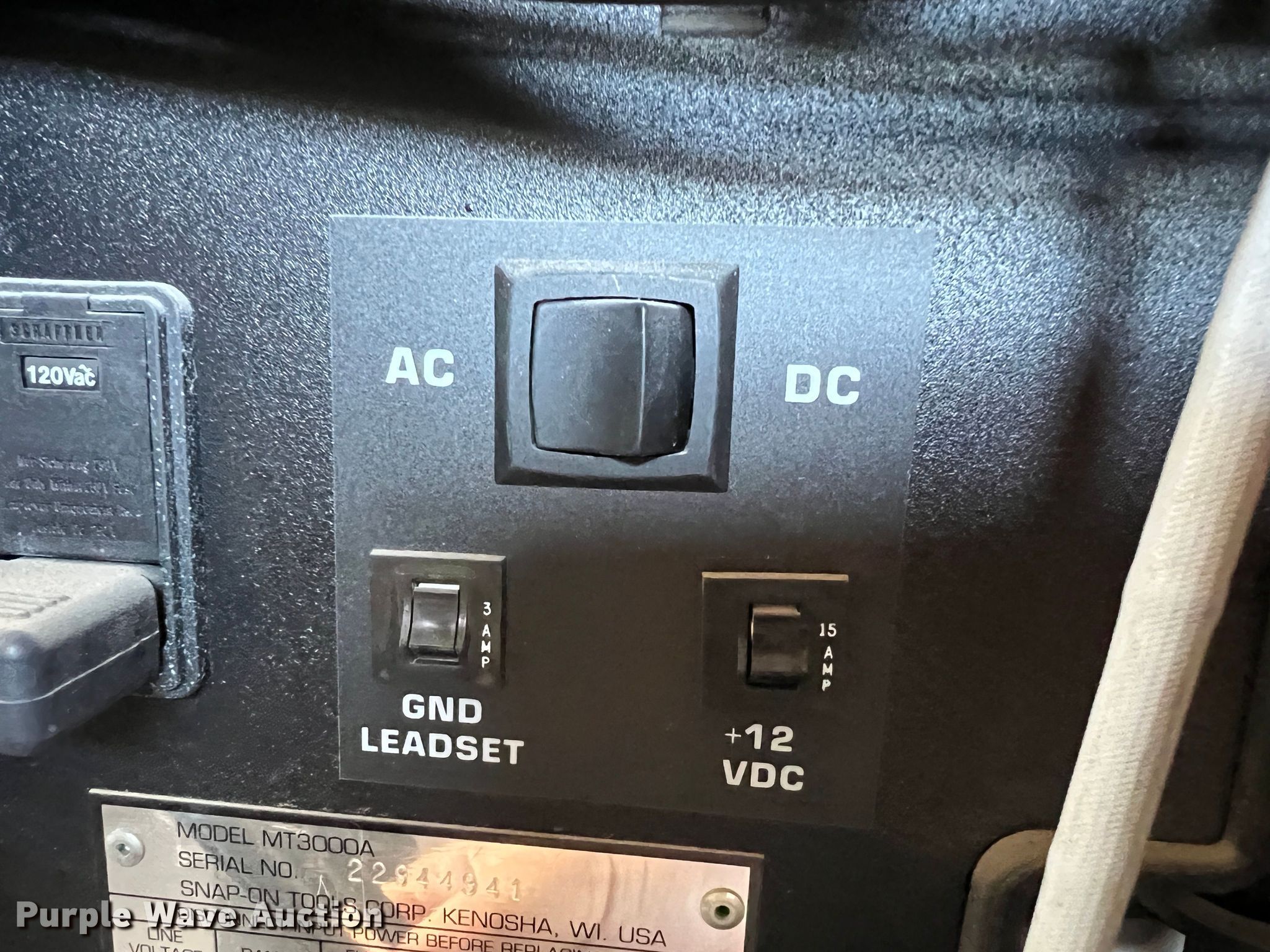 Purple Wave is selling a used Tools in Kansas. This item is a 1994 Snap-on MT3000A oscilloscope with the following: AMP probe, Vacuum probes, Cabinet with arm, Serial: 22944941