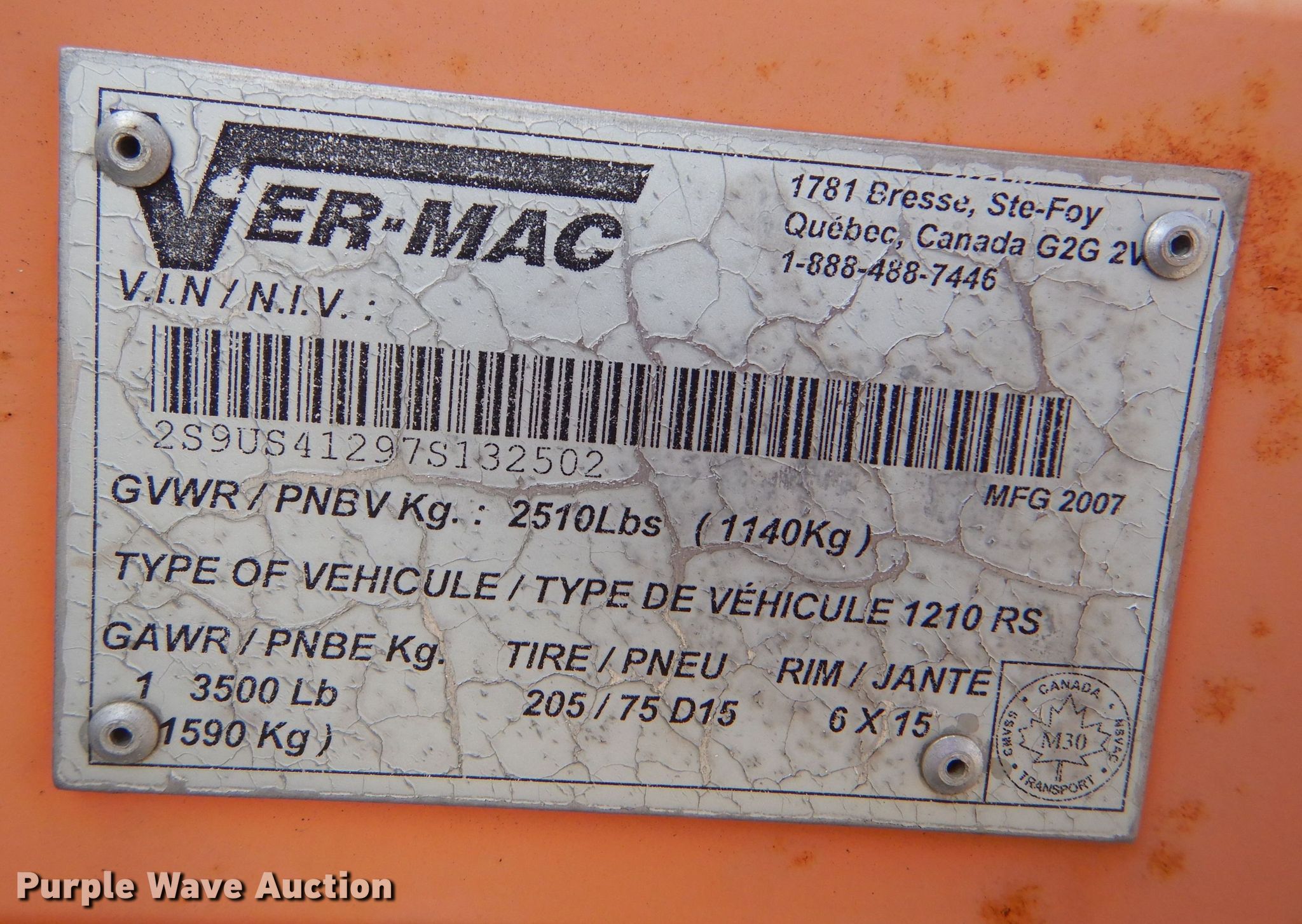 2007 Ver-Mac PCMS 1210 message board trailer. VIN: 2S9US41297S132502, KDOT ID: 553-2017. Dimensions Overall: 14' L x 86" W. Features Solar panel, (6) 6V batteries. Chassis Hitch: Pintle, Ball hitch: 2", Brakes: Hydraulic, GVWR: 2,510 lbs. Tires Size: 205/75R15. Kansas Title. Titles will be distributed after confirmation of payment and removal. Title distribution may be delayed up to 30 days from verification of funds. Kansas Department of Transportation. 1006 North 3rd. Salina, KS 67401