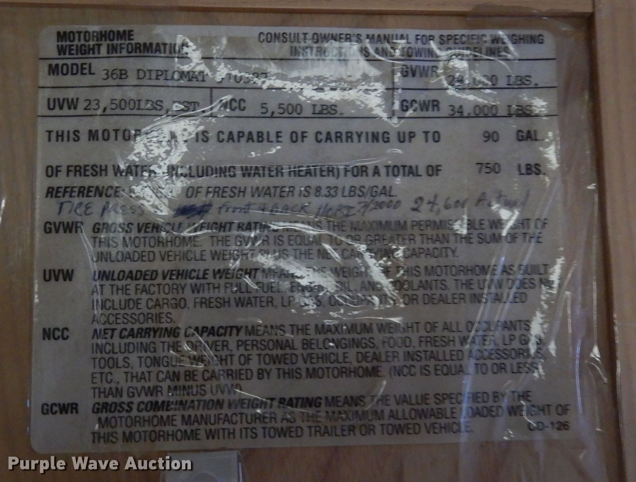 Purple Wave is selling a used RV or Camper in Colorado. This item is a 1999 Monaco Diplomat RV with the following: Miles: 81,270 on odometer, Camper length: 36', VIN: 1RF120418X2007724