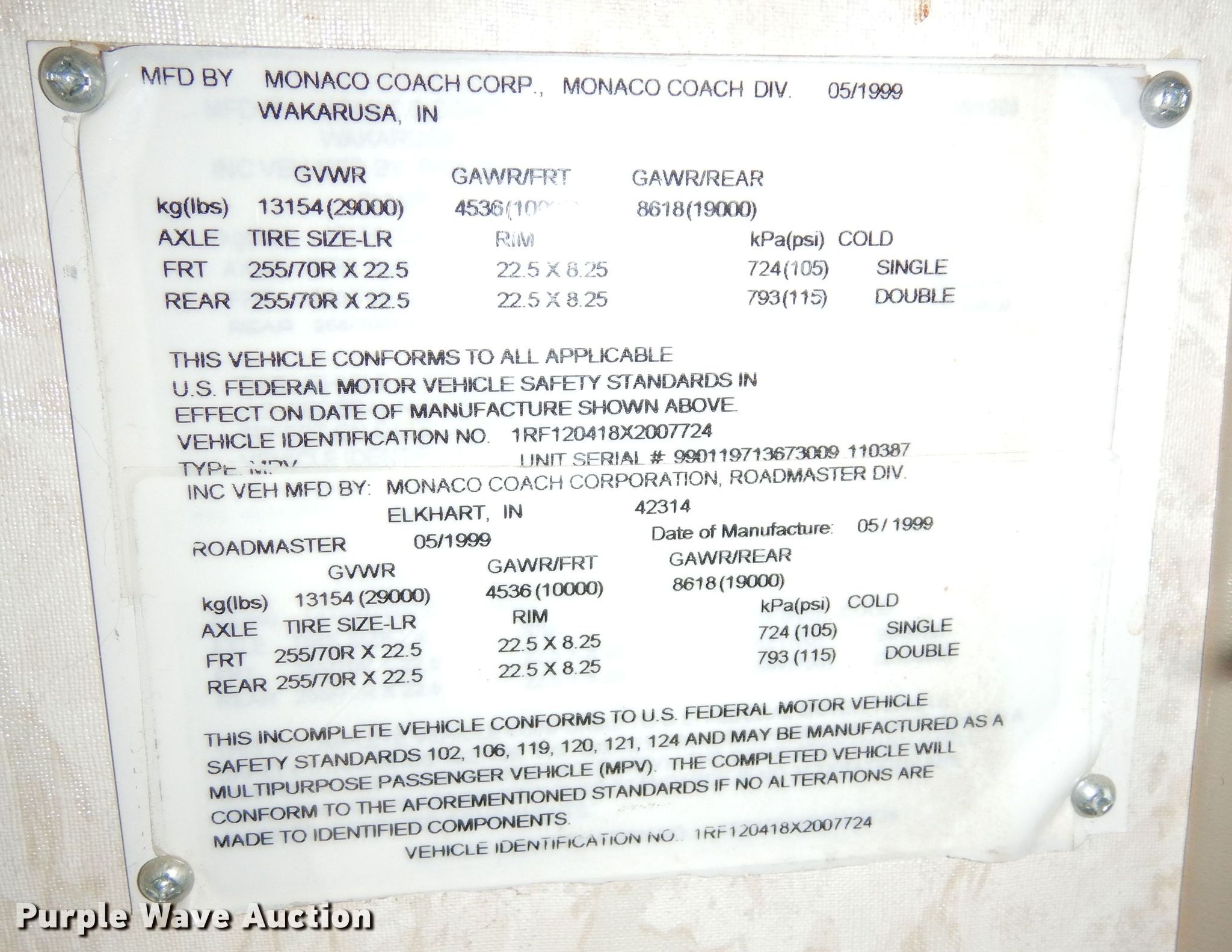 1999 Monaco Diplomat RV. Miles: 81,270 on odometer, Camper length: 36', VIN: 1RF120418X2007724. Engine Cummins ISB 275, Cylinders: 6, Fuel type: Diesel, HP: 325. Transmission Automatic. Chassis Axles: Single, Brakes: Air, GVWR: 29,000 lbs, GAWR: 19,000 lbs. Interior Kitchen: Sink, Refrigerator, Freezer, Convection Oven, Stove: Propane, Living room: Pull Out Couch, Bathroom, Beds: 1 Bed type: Queen, TVs: 1, Heater, AC units: 2, Washer/dryer hookups. Features Slide outs: 1, Awnings: 4 Awning type: Manual, Generator Onan 7.5HDKAJ11451D, Hours: 340 on meter, Fuel type: Diesel, kW: 7.5, Rear hitch, Cruise control, Engine brake, Backup camera. Tires Size: 275/70R22.5. Colorado title. Title distribution may be delayed up to 14 days from verification of funds. 6765 East 50th Avenue. Commerce City, CO 80022