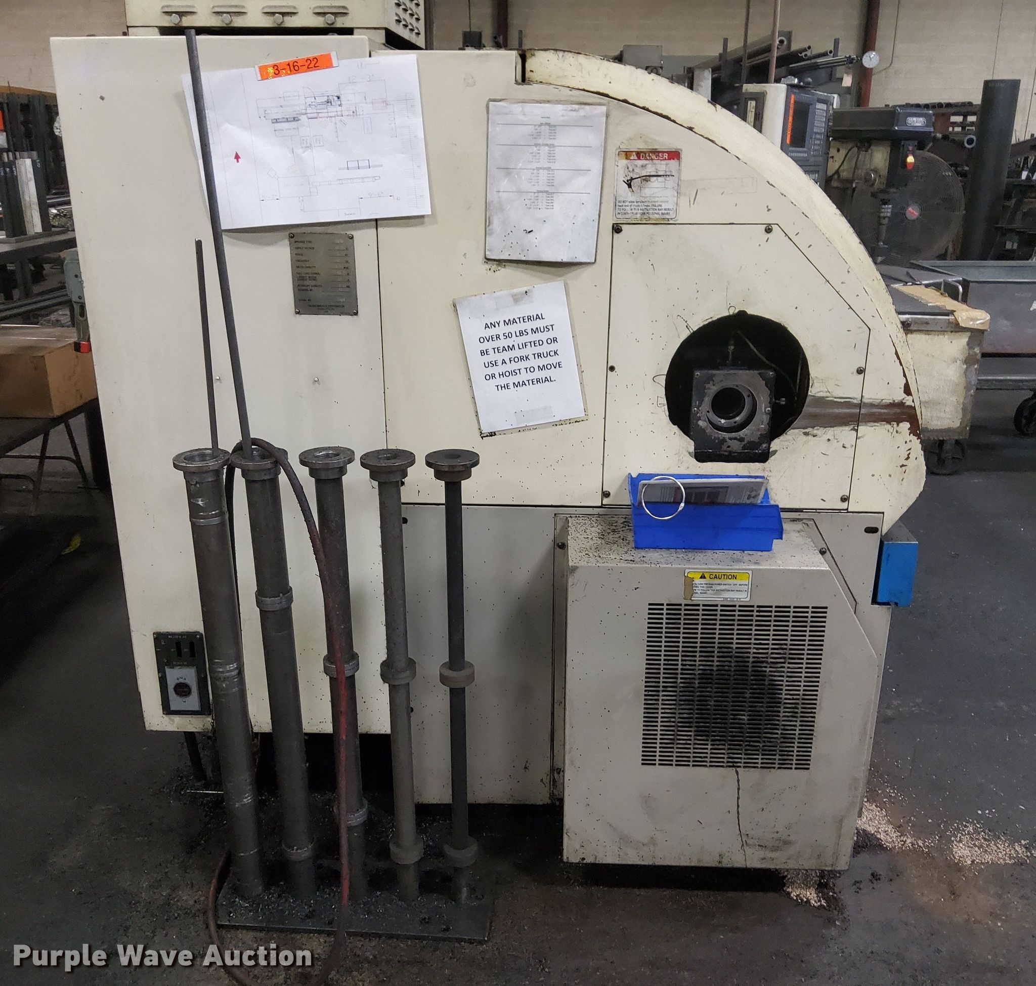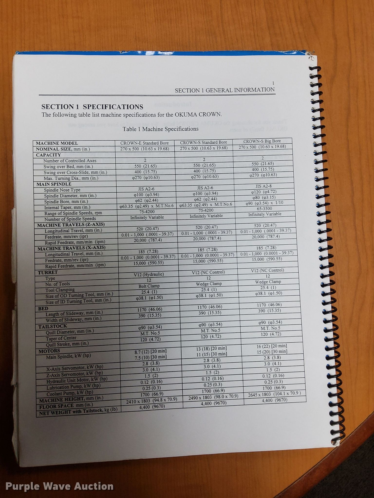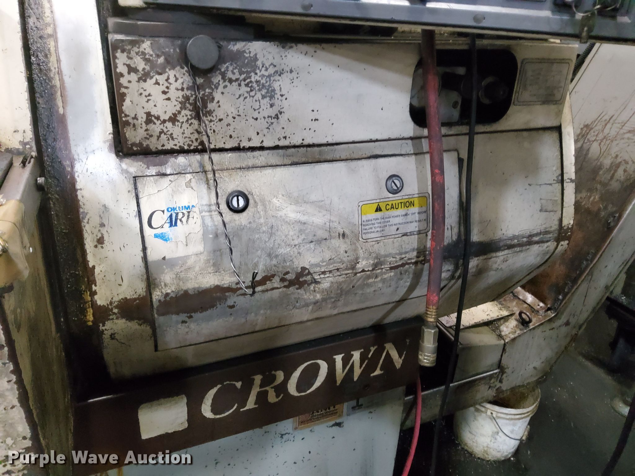 Purple Wave is selling a used Cutting Systems in Kansas. This item is a Okuma Crown 762S-BB CNC lathe with the following: Electric motor, 220/480V, Three phase, Okuma OSP700L control, Henning KM0-0320-00 chip conveyor, Width: 12", Serial: 6289, (5) spindle liners, (15) collets, Serial: 0498