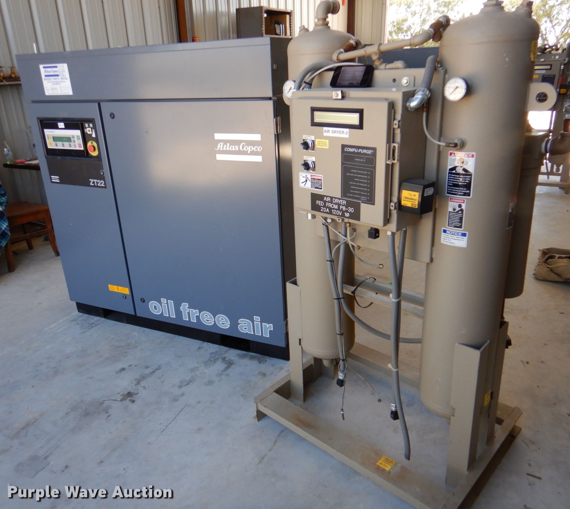 1997 Atlas Copco ZT22 air compressor. Hours: Unknown, Serial: ATF 040336. Electric Motor Siemens, HP: 55, kW: 22, Volts: 440/460, Phase: Three. Features Air compressor PSI: 125, Skid mounted. Air Dryer Deltech Compu-purge , Model: PS161-BCFHMR, PSI: 150. Notes Unknown operating condition. 201 County Road 260. Liberty Hill, TX 78642