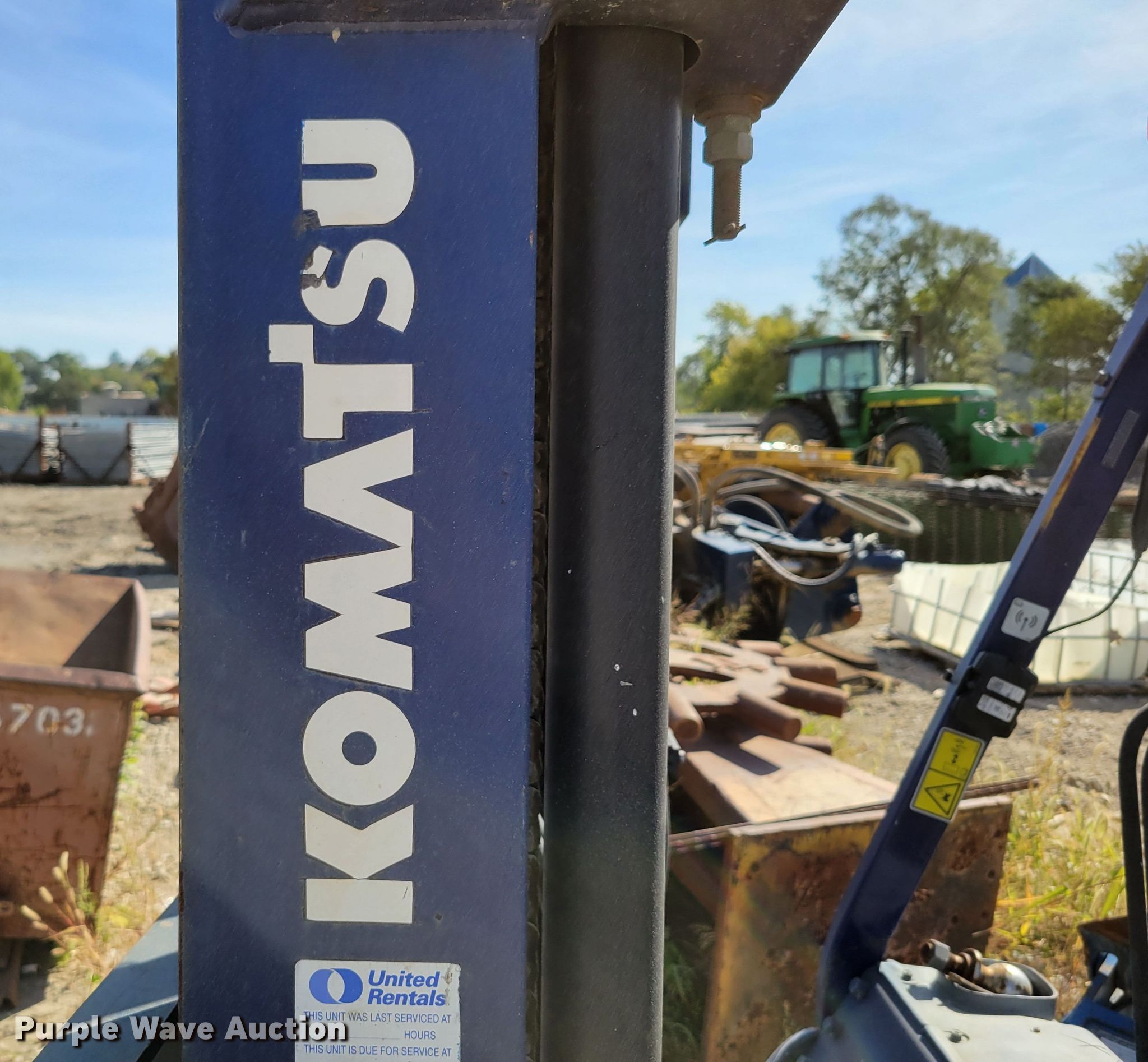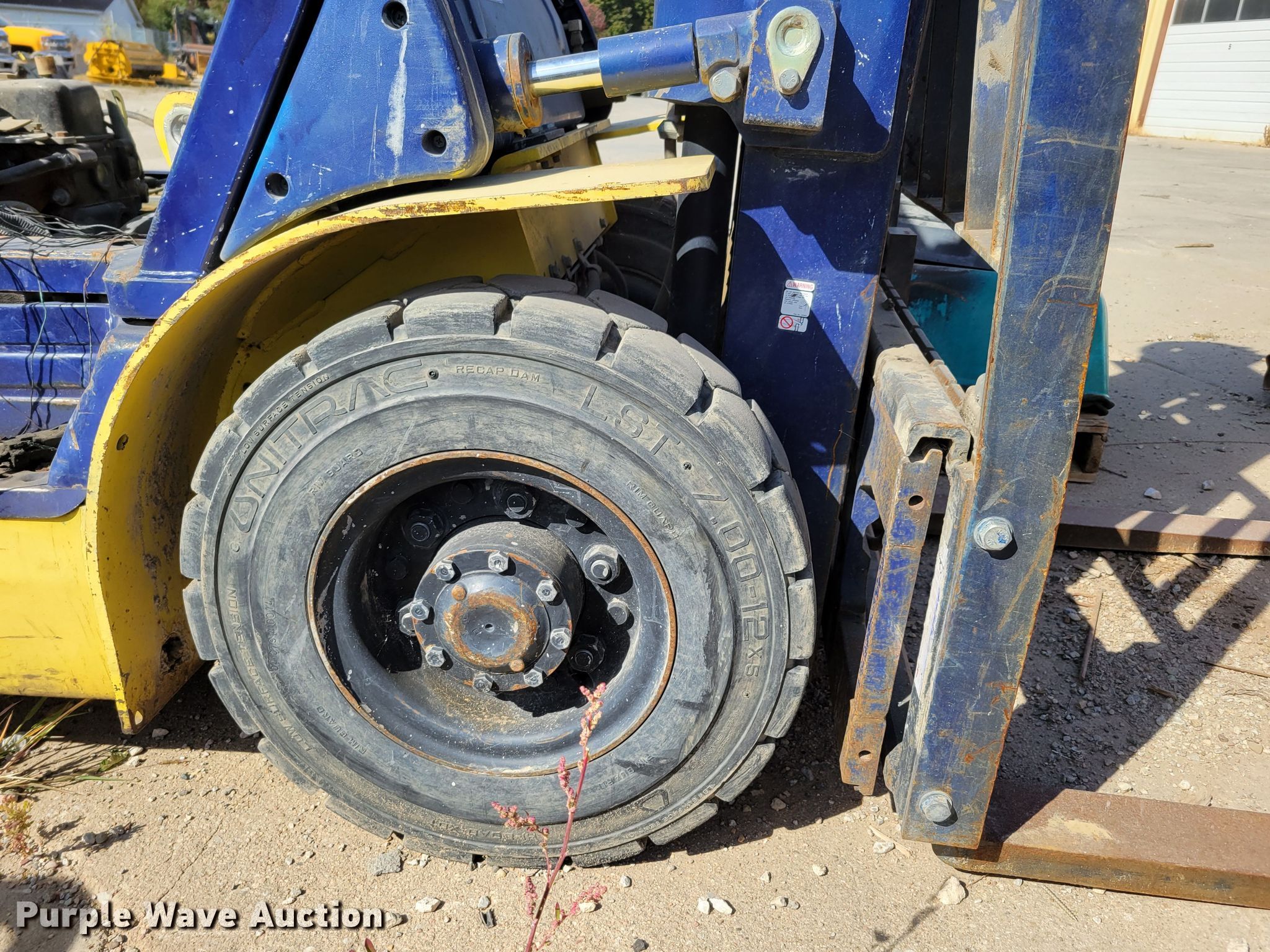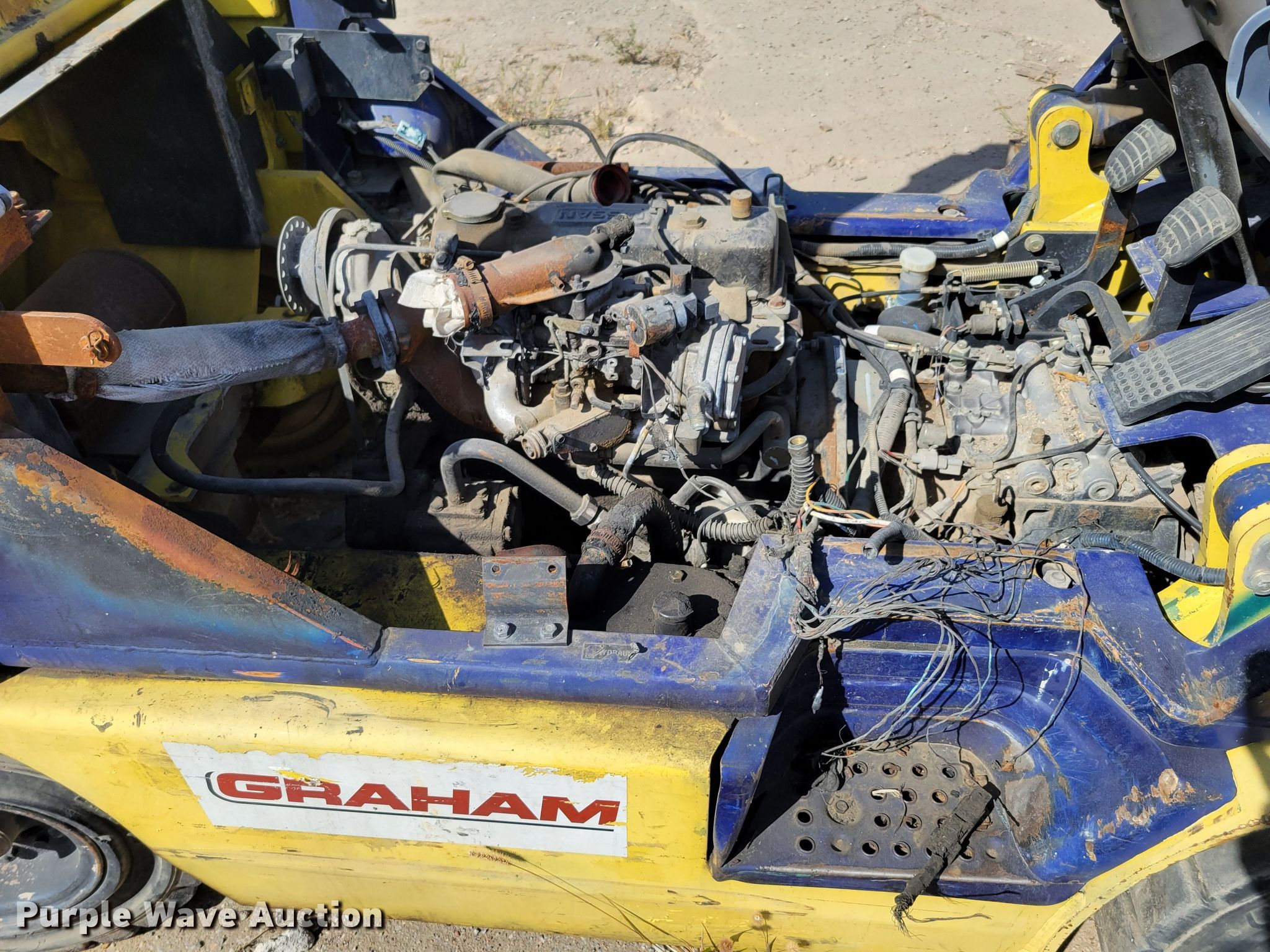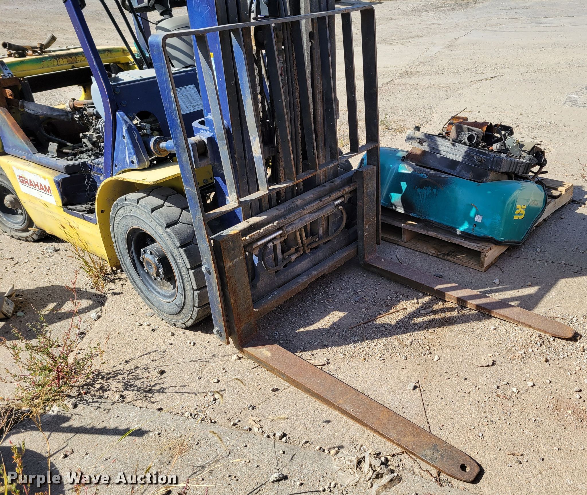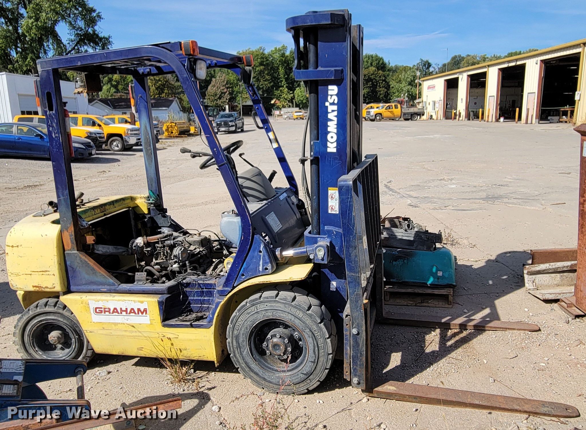 Komatsu FG25T-12 forklift. Hours: 4,646 on meter, Serial: 516543A. Engine Nissan, Cylinders: 4, Fuel type: LPG LP bottle: Not included. Transmission Hydrostatic. Operators station OROPS. Features Maximum lift capacity: 3,730 lbs, Maximum lift height: 188", Mast stages: 3, Side shift, Mast tilt, Fork length: 42". Tires Front: 7.00-12, Rear: 6.50-10, Foam filled. Notes Fire damage, Non-operational unit. Graham Construction, Inc.. 2209 N 88th St. Omaha, NE 68134