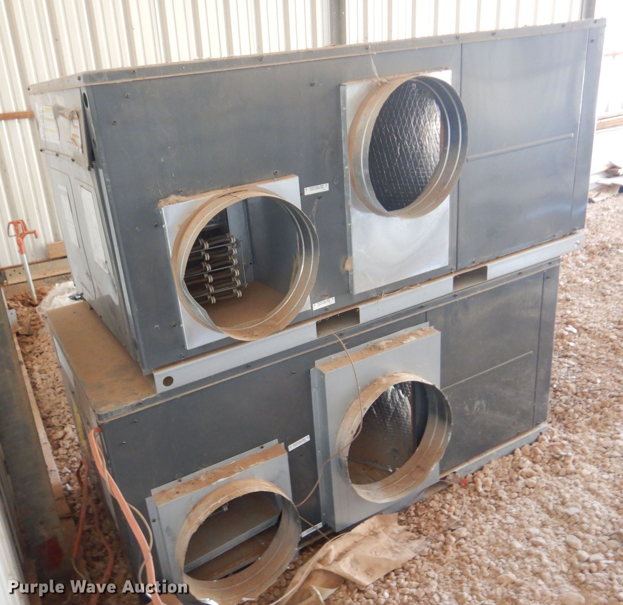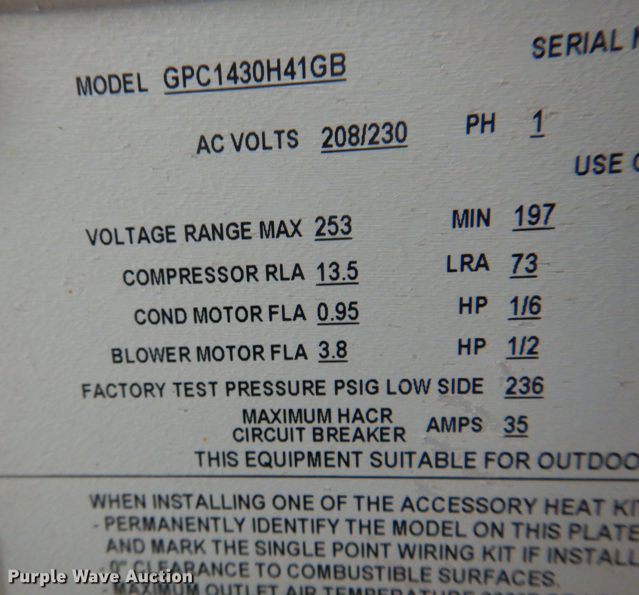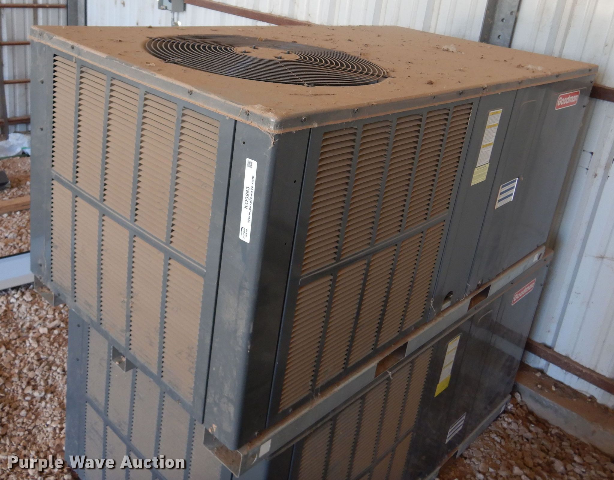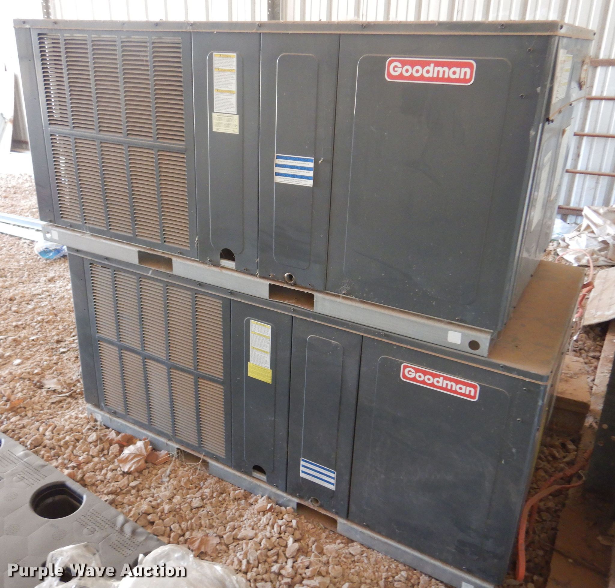Purple Wave is selling a used Appliances in Oklahoma. This item is a (2) Goodman GPC1430H41GB combination AC units with the following: Single phase, 208/230 volts, Serial: 2005208573, 2007274869