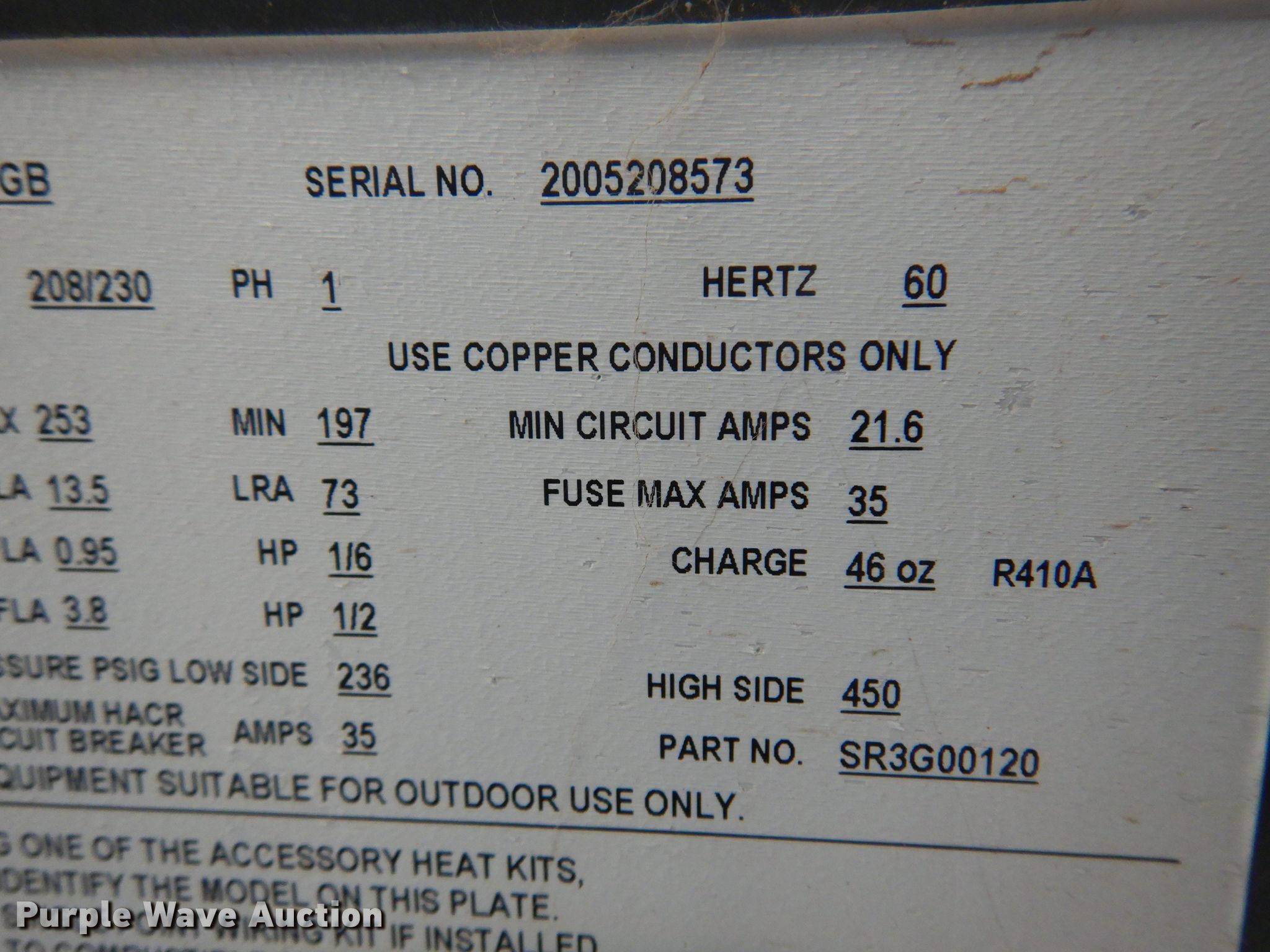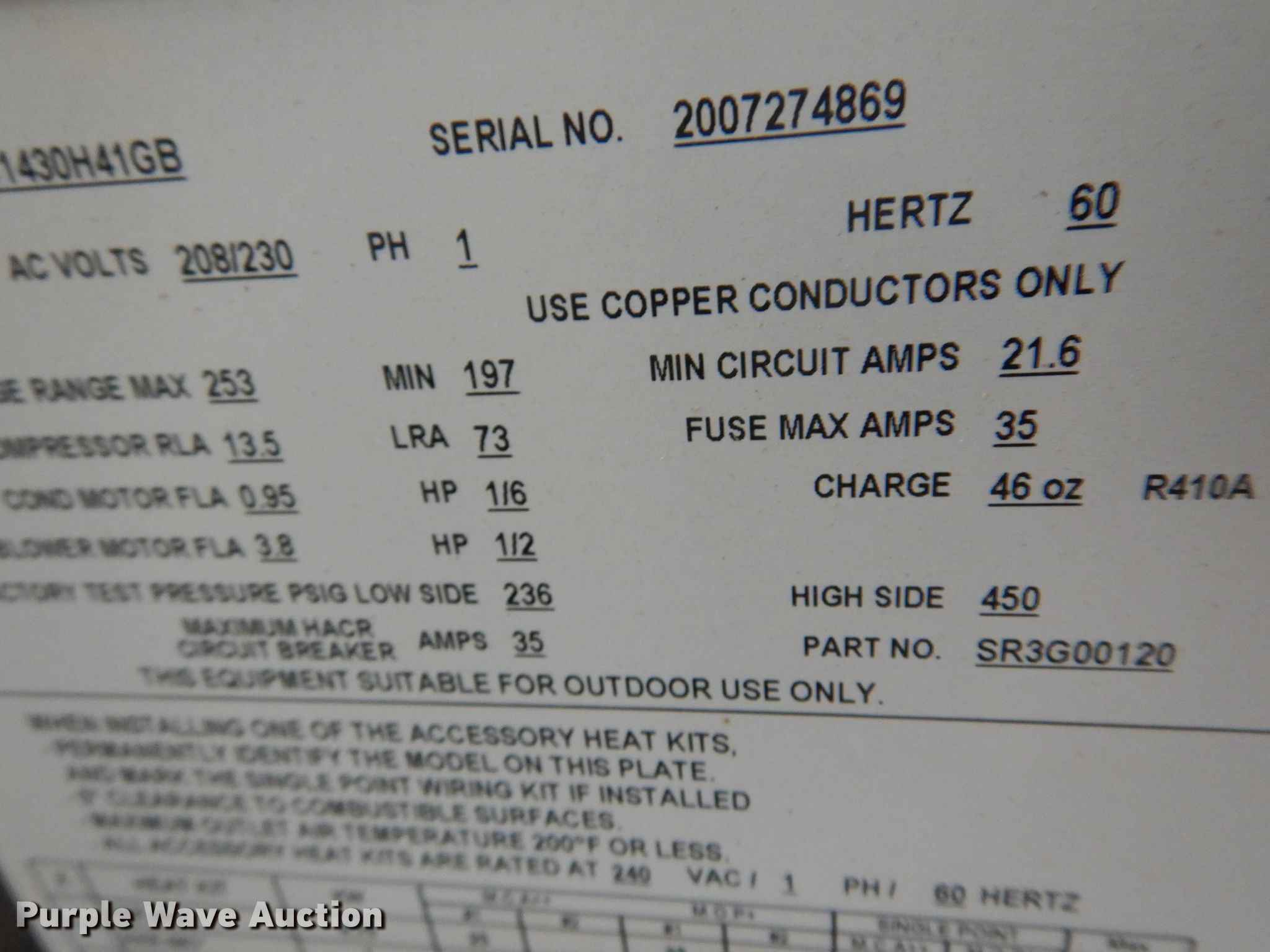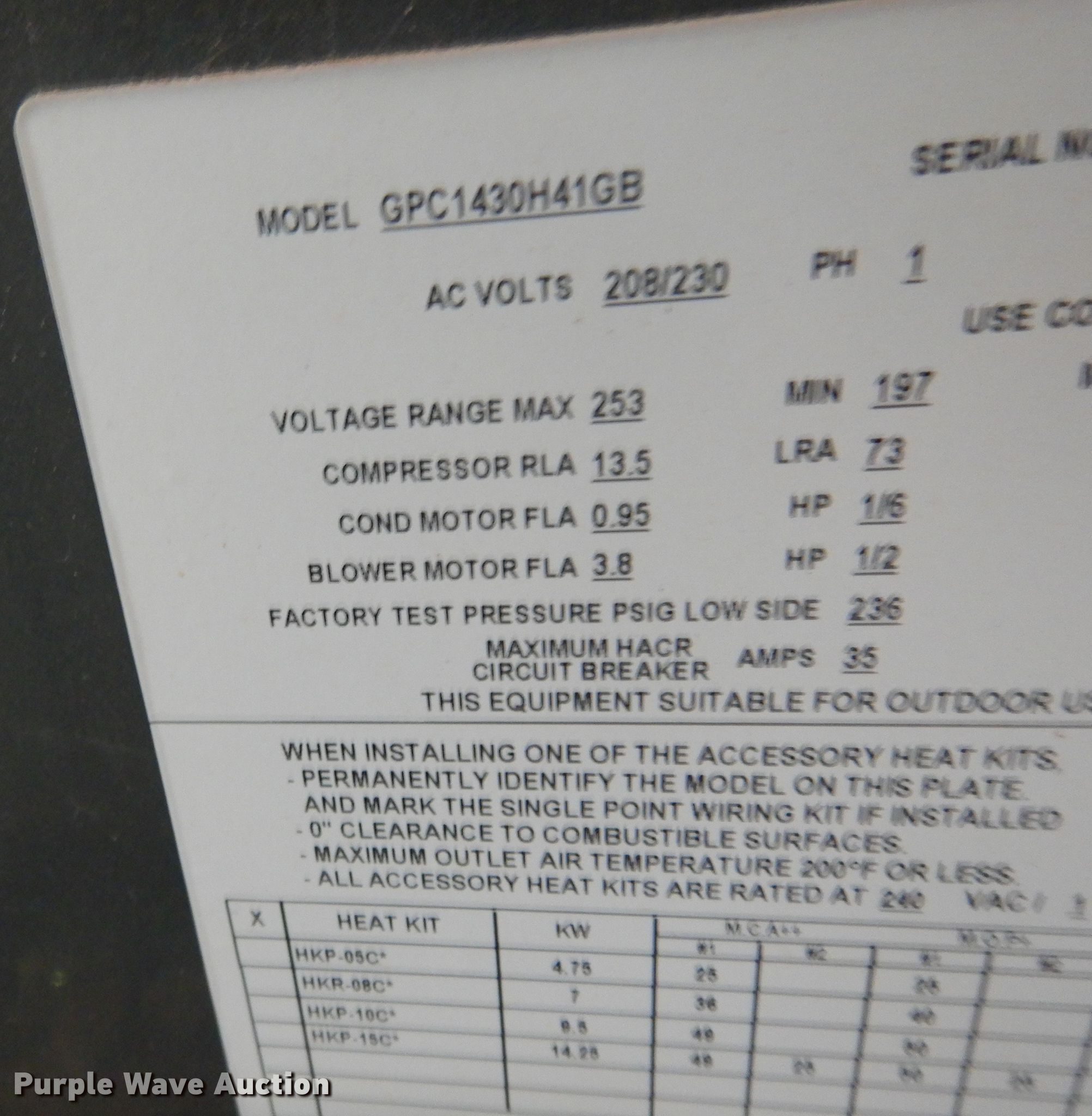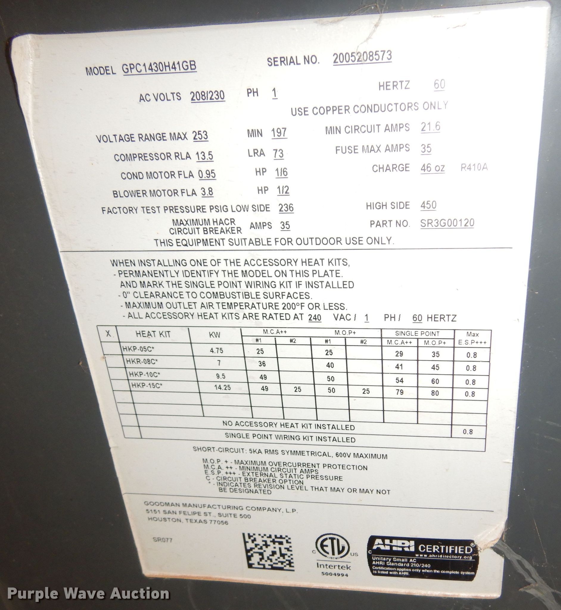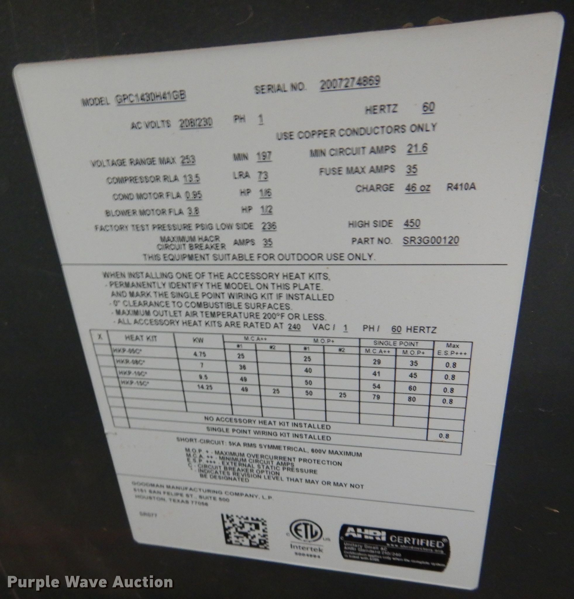Purple Wave is selling a used Appliances in Oklahoma. This item is a (2) Goodman GPC1430H41GB combination AC units with the following: Single phase, 208/230 volts, Serial: 2005208573, 2007274869
