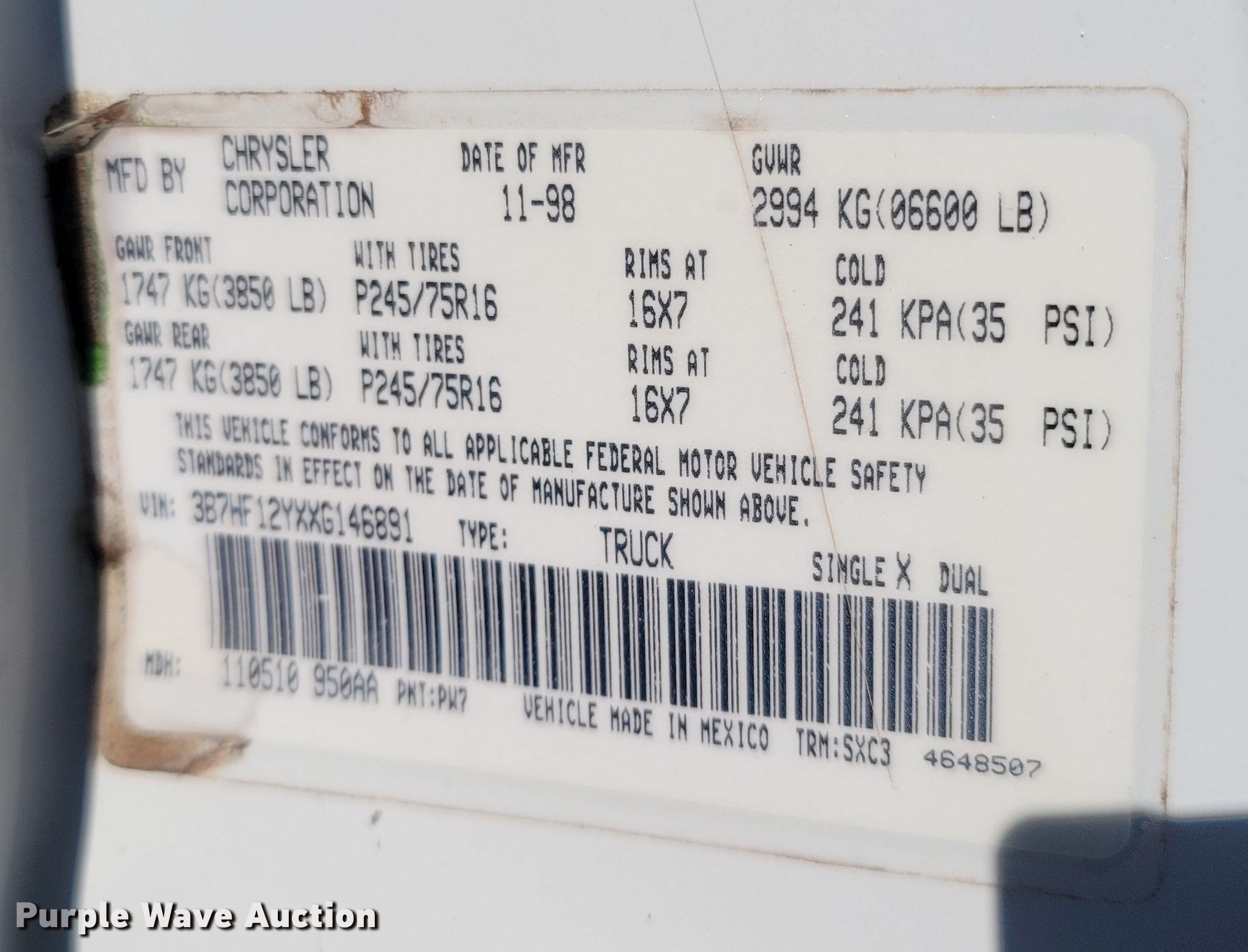 • VIN: 3B7HF12YXXG146891