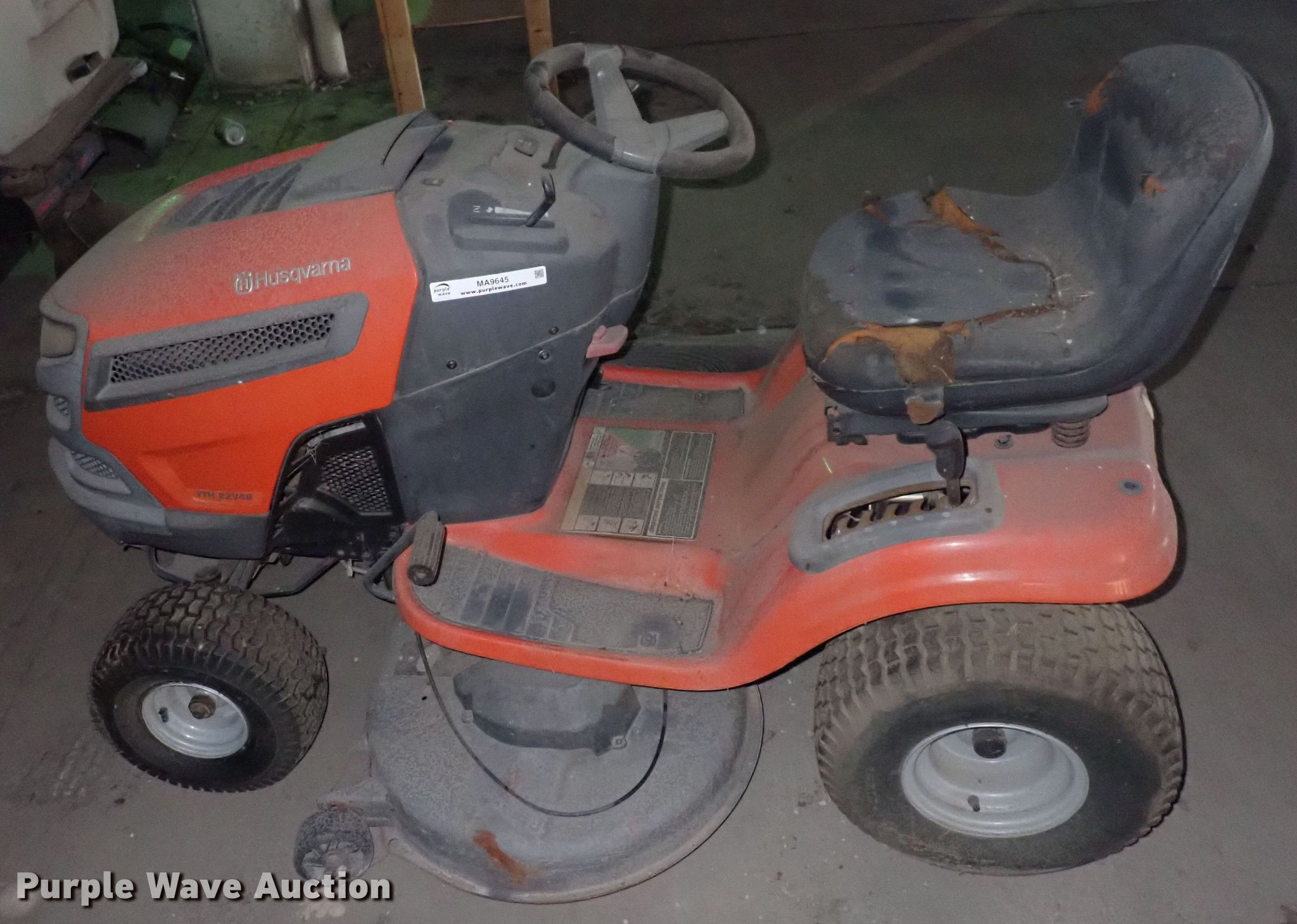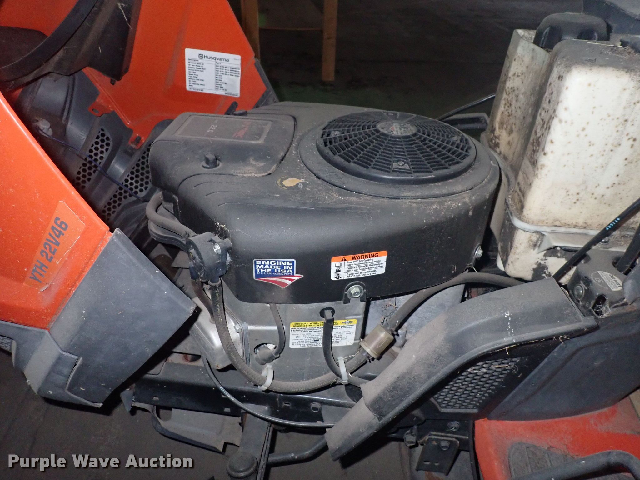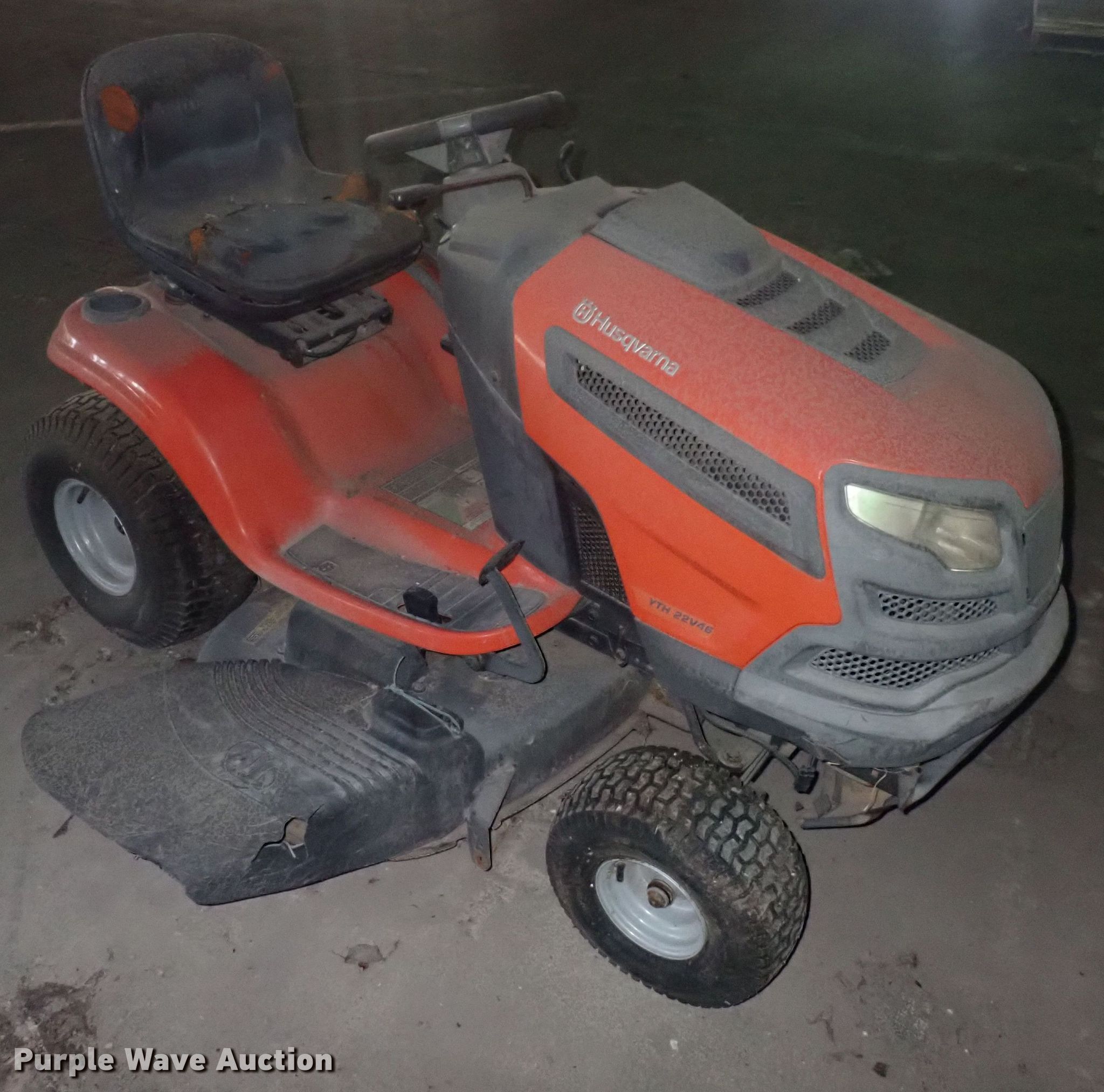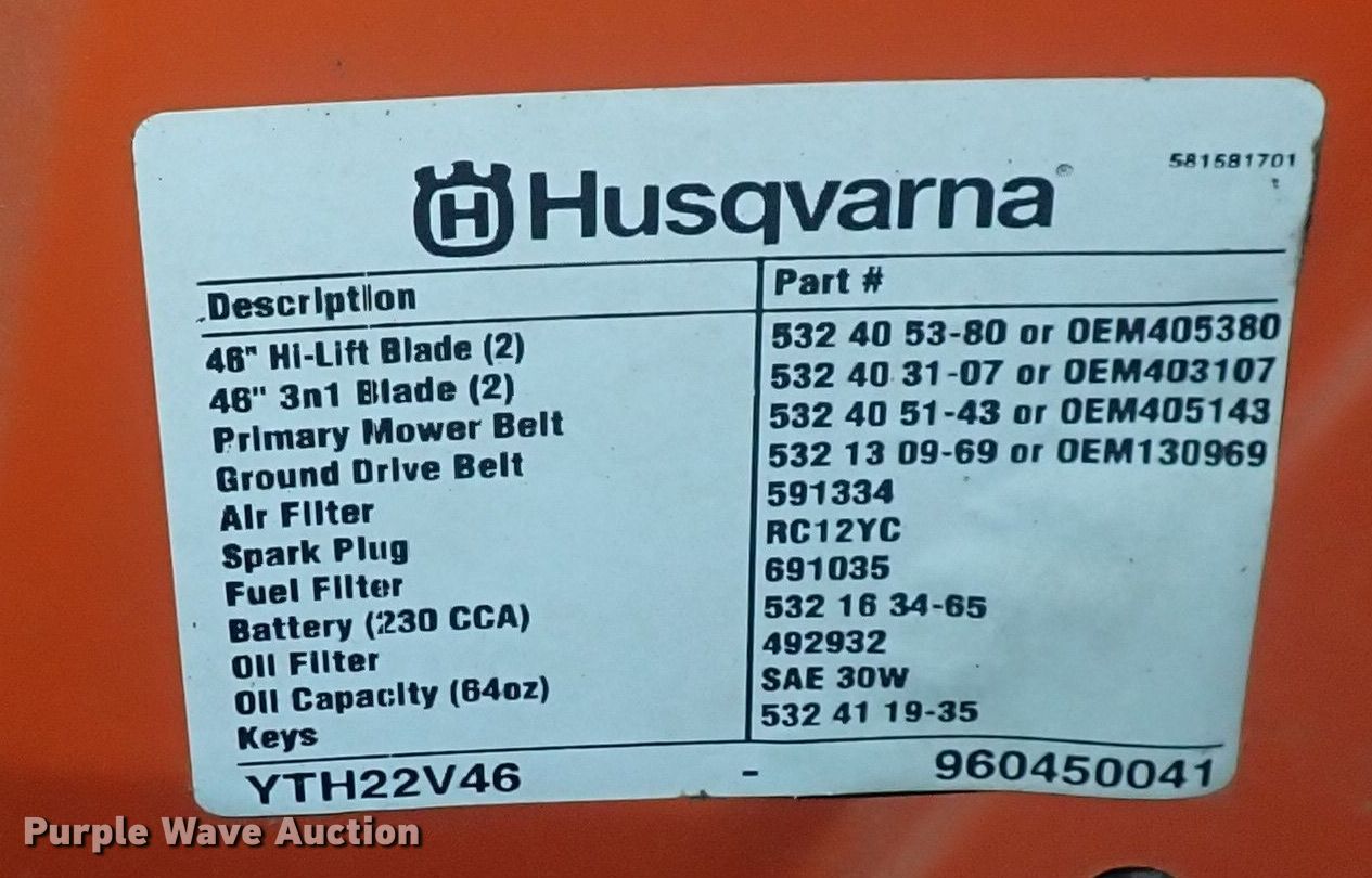 Purple Wave is selling a used Lawn Mower in Kansas. This item is a Husqvarna YTH22V46 lawn mower with the following: Cutting width: 46", Serial: 960450041