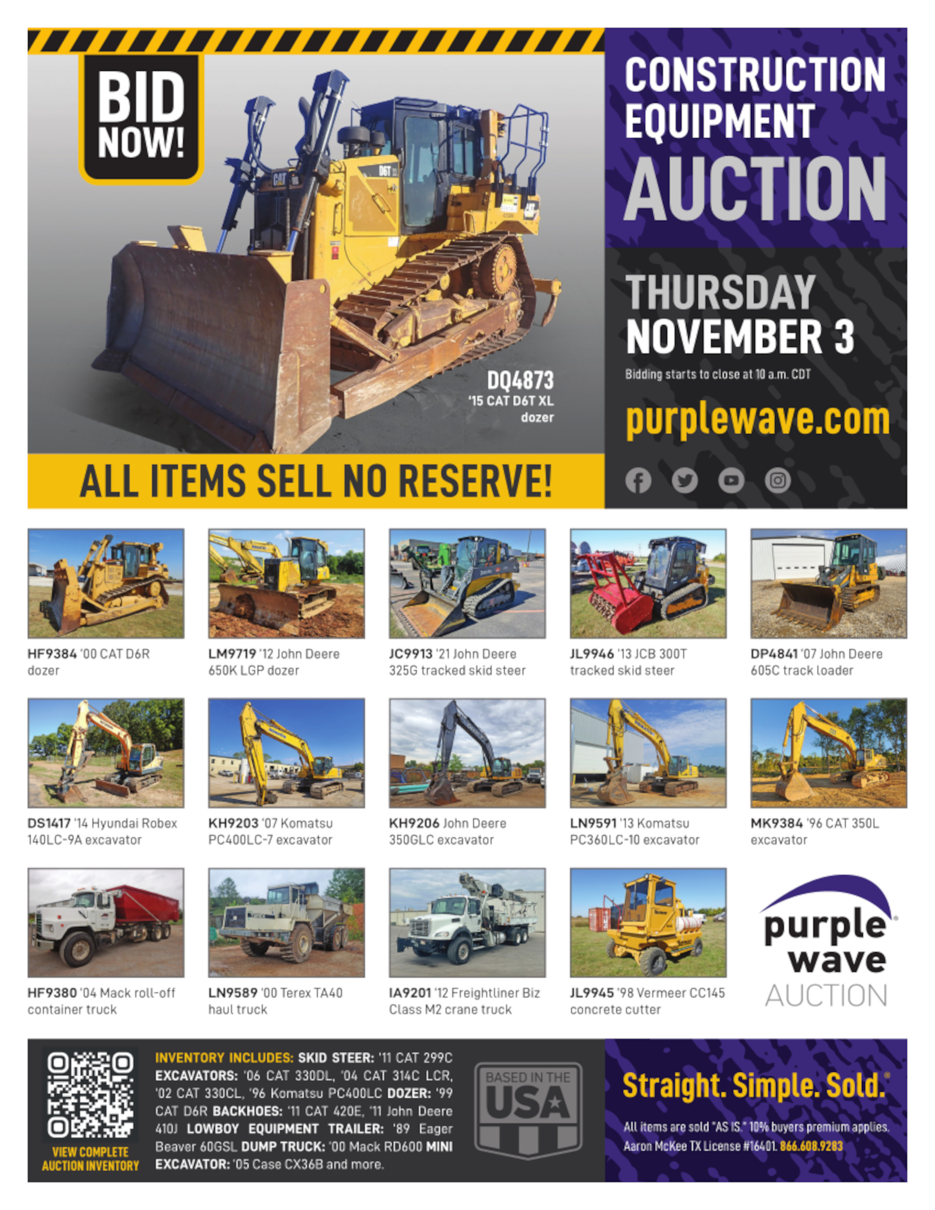 This auction is conducted by Purple Wave, Inc., whose home office is 825 Levee Drive, Manhattan, Kansas. Aaron McKee, Texas auctioneer license # 16401, operates Purple Wave, Inc. Complaints against us may be directed to the Texas Department of Licensing and Regulation, P.O. Box 12157, Austin, Texas 78711, (512) 463-6599. For additional required information, see the attached document.