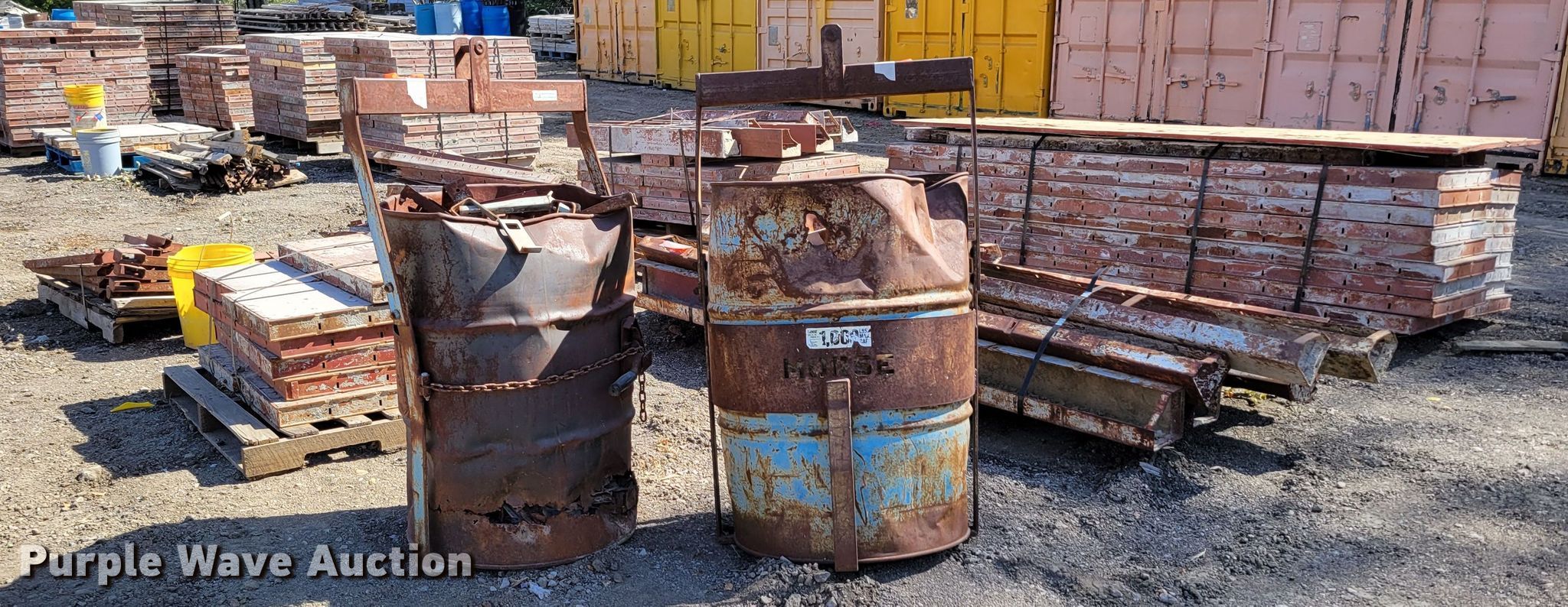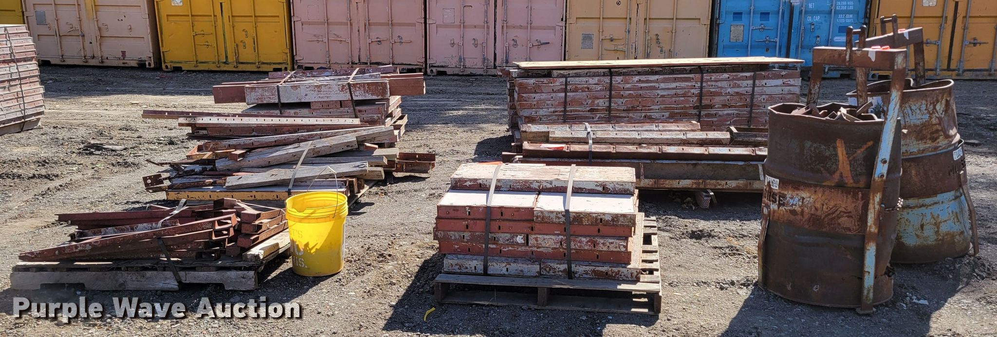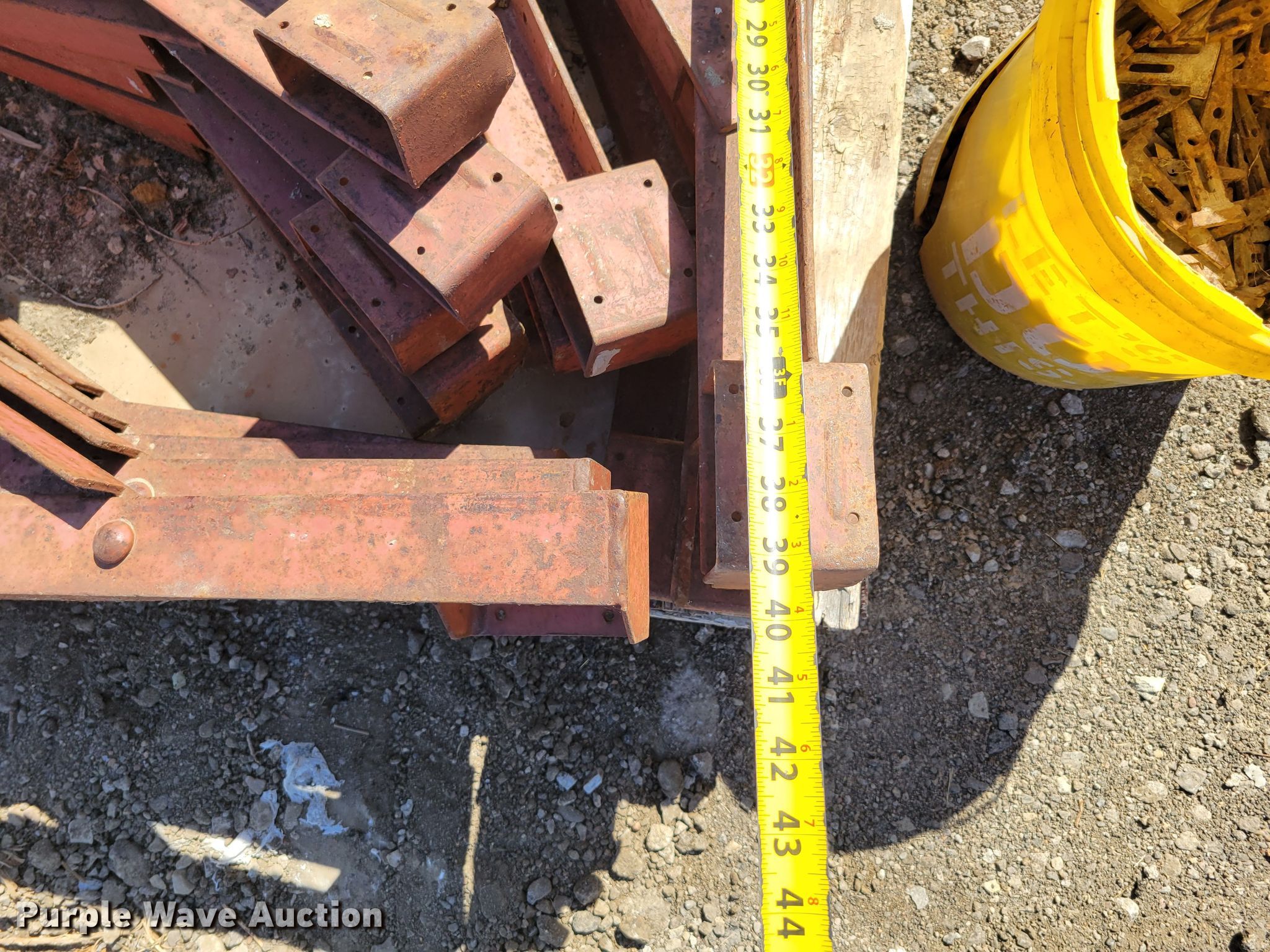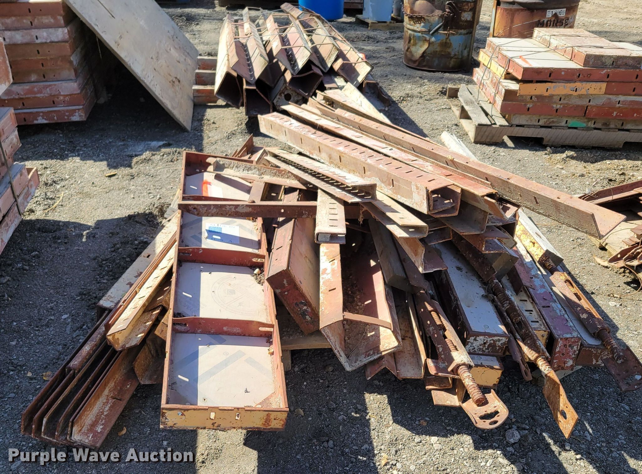 Purple Wave is selling a used Building Materials in Nebraska. This item is a Approximately 50 Symons concrete forms with the following: (18) 24" W x 96" H, (8) 24" W x 48" H, (2) 12" W x 48" H, (2)10" W x 48" H, (15) 6" x 6" x 48" L corner forms, (5) 6" x 6" x 96" L corner forms, Pallet of form braces, Bucket of hardware pins, (2) barrels of form hardware