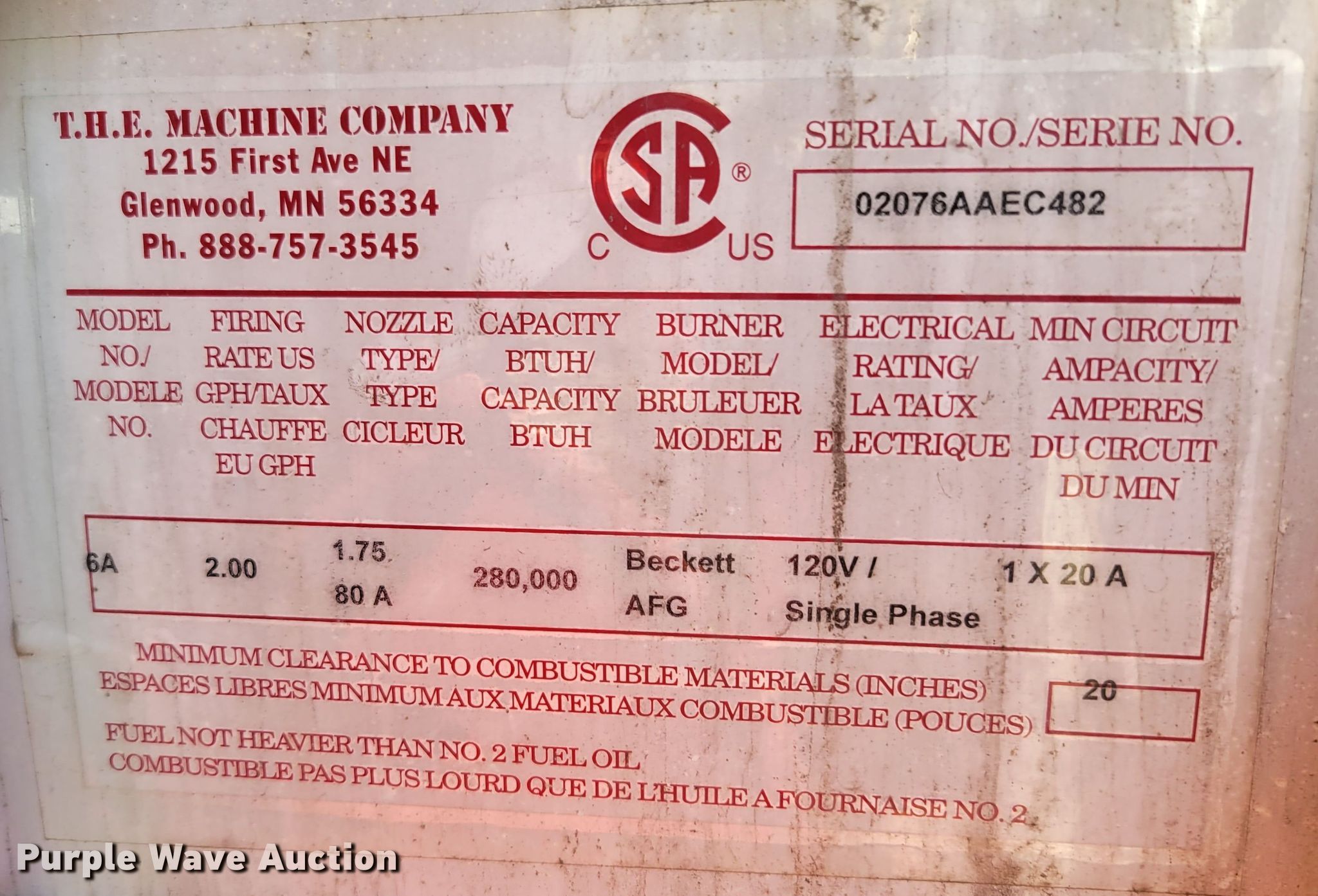 2007 Thawzall 6A ground thaw trailer. VIN: 1T9BT15127G576482, Serial: 02076AAEC482. Dimensions 14' L x 80" W. Engine Lombardi, Displacement: 349 cc, Cylinders: Single, Fuel type: Diesel, Hours: 2,756 on meter. Features Beckett AFG oil burner Serial: 070108-16317, BTU: 280,000, Single phase, 120V, Wayne Porta pump HP: 1/2, (10) auxiliary hose hookups 1" diameter, 2" diameter, Hose reel, Hercules foot switch , Auxiliary fuel tank 56" W x 29" D x 24" H, Safety chains. Chassis Ball hich: 2 5/16", Landing gear: Single. Tires Size: 225/75R16. Notes Non-operational engine, Non-operational unit. Transfer of ownership documentation will be a bill of sale. Graham Construction, Inc.. 2209 N 88th St. Omaha, NE 68134