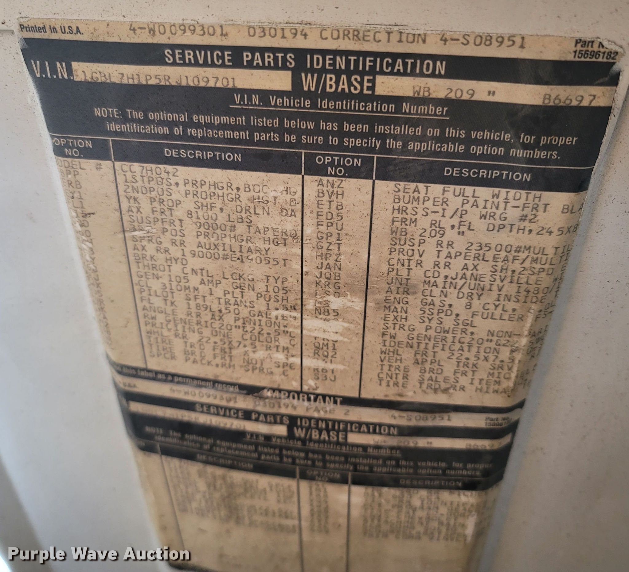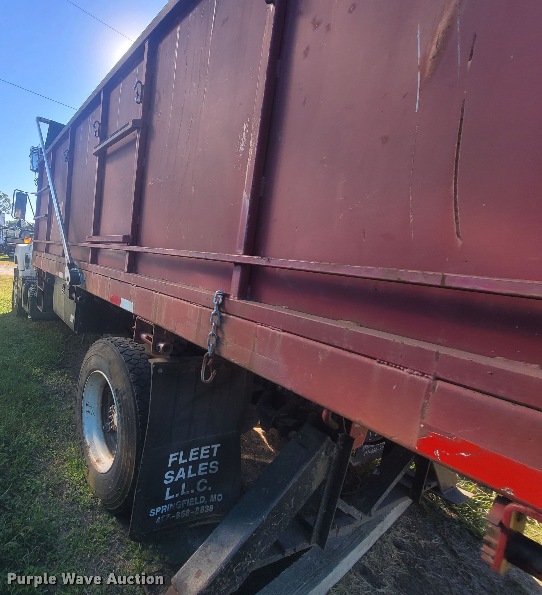 1994 Chevrolet Kodiak scissor lift dump truck. Miles: 160,621 on odometer, VIN: 1GBL7H1P5RJ109701. Engine Cylinders: 8, Fuel type: Gas. Transmission Eaton Fuller, Manual, Speed: 5. Chassis Axles: Single, Suspension: Spring, Brakes: Hydraulic, PTO, GVWR: 26,000 lbs, Wheelbase: 209". Interior Heat. Features Scissor lift dump bed 16' L x 98" W, Side height: 55", Bed type: Steel, Roll tarp, Ram: Dual, End gate: Manual. Tires Front: 11R22.5, Rear: 10R22.5. Notes Unknown operating condition dump bed, Engine disassembled Parts may be missing, Non-operational unit. Missouri title. 615 North West Bypass. Springfield, MO 65803