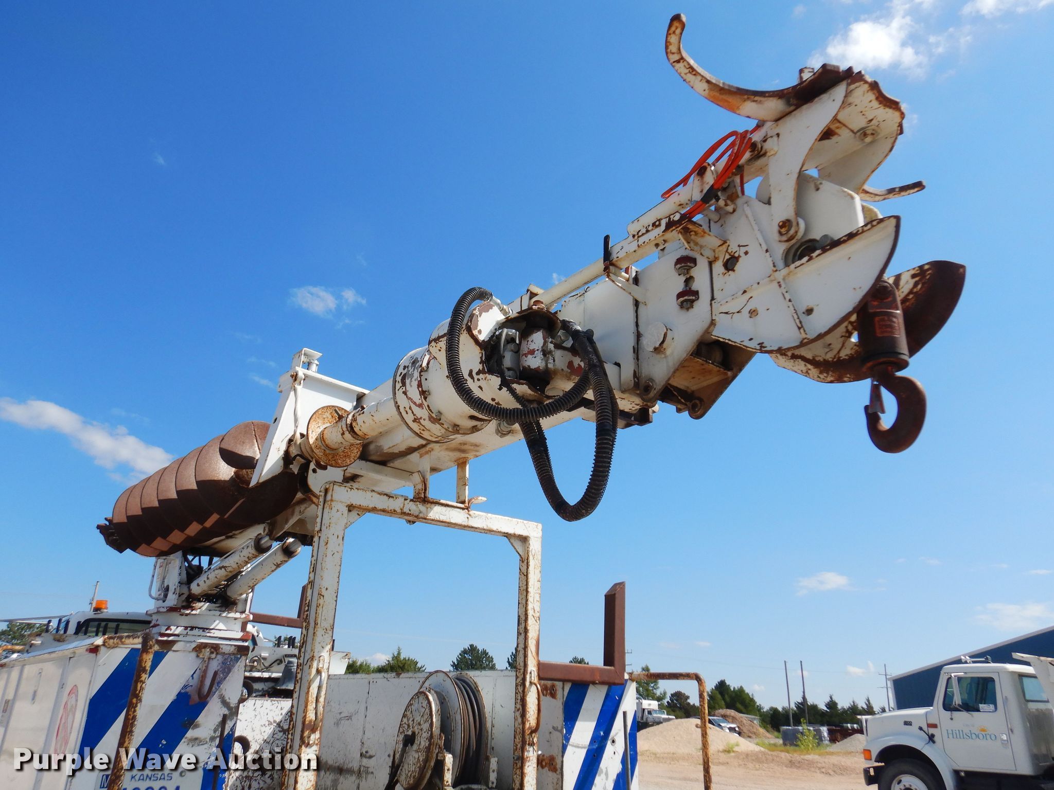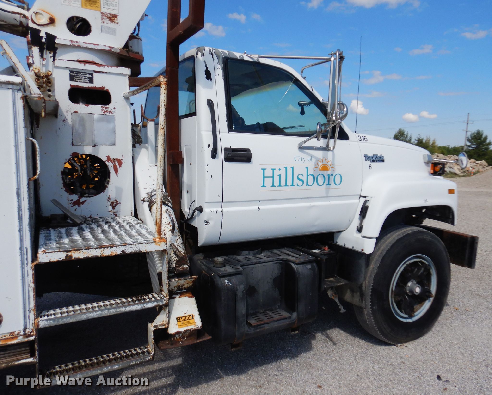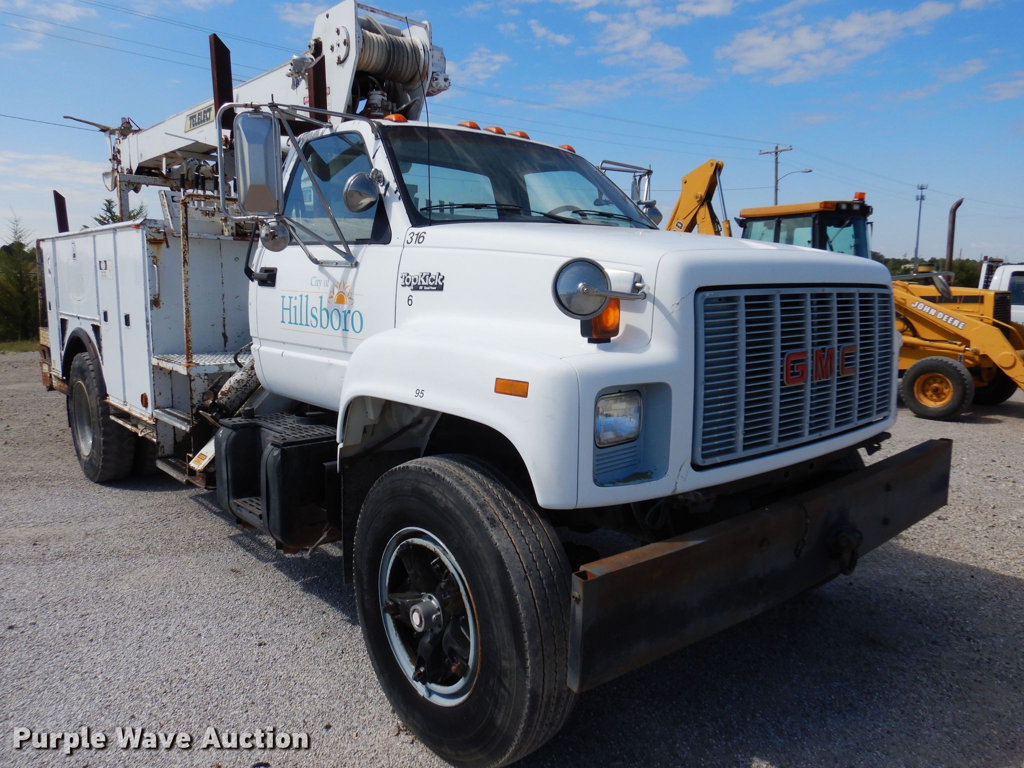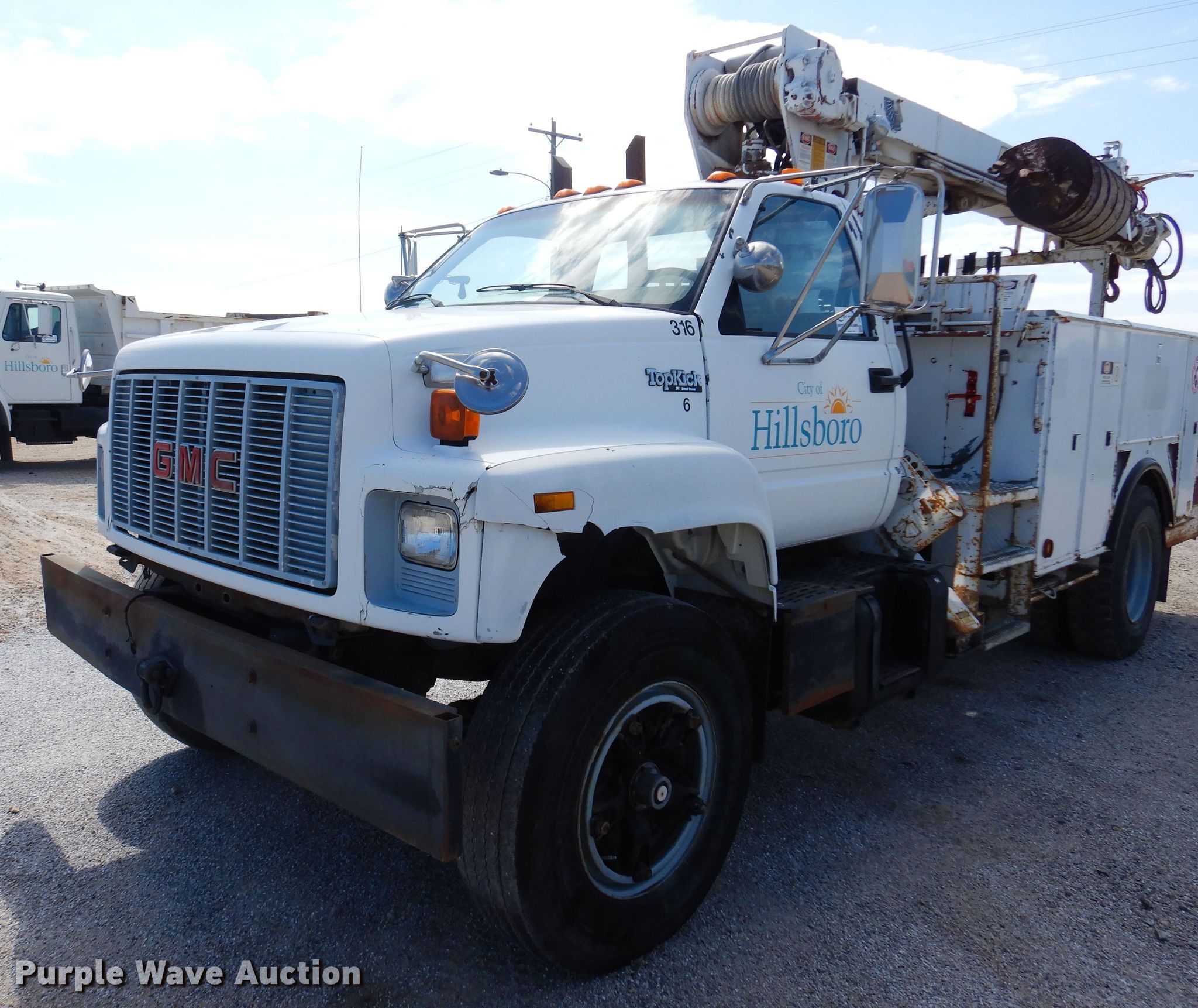 1991 GMC TopKick C6500 digger derrick truck. Miles: 71,878 on odometer, VIN: 1GDM7H1J6MJ508147. Engine Cylinders: 6, Fuel type: Diesel. Transmission Automatic. Chassis Axles: Single, Suspension: Spring, Brakes: Air. Interior Heat. Operational Bed 11' 4" L x 92" W, Boom Simon-Telelect Commander 4500, Serial: 1198-45DY, Maximum lift capacity: 21,600 lbs, Maximum lift height: 4,500', Boom controls Ground, Pole guide, Auger Diameter: 16".. Tires Size: 11R22.5. Notes Partial barrel of Mobile DTE11M hydraulic luid, No batteries, Hydraulic leaks. Kansas title. Mileage has not been verified. Exempt will be written in the odometer disclosure on the title. City of Hillsboro. Hillsboro, KS 67063