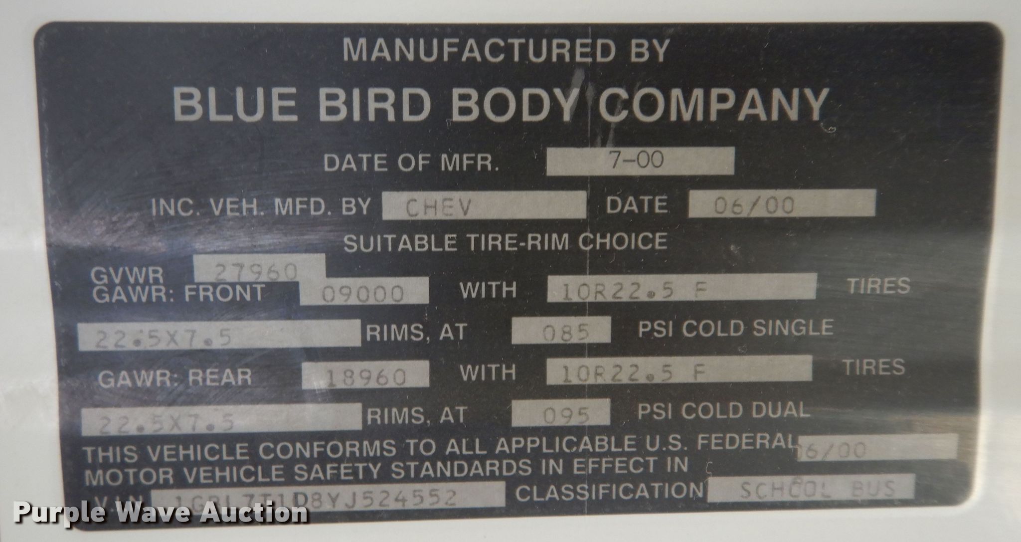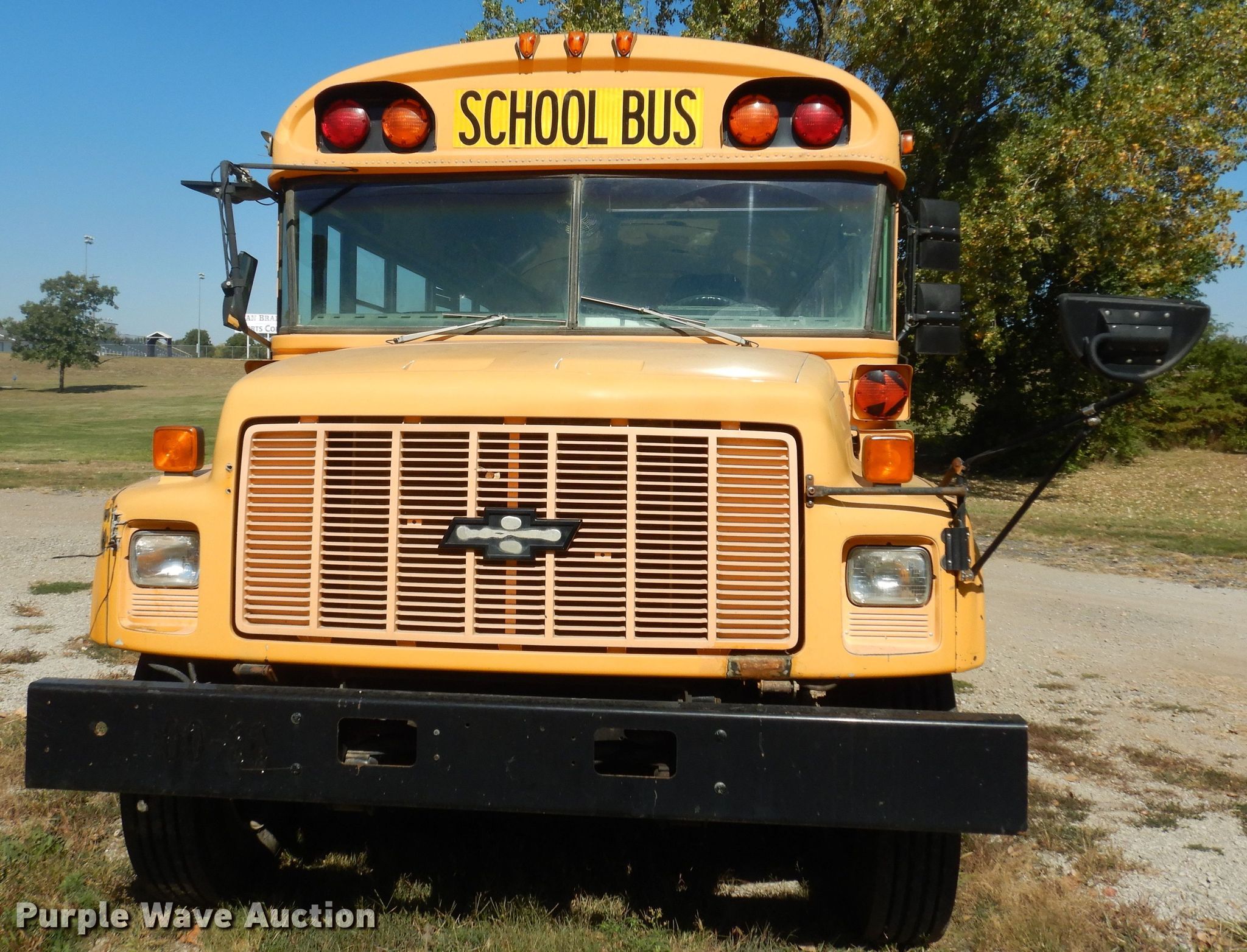 2001 Chevrolet Blue Bird school bus. Miles: 145,409 on odometer, VIN: 1GBL7T1D8YJ524552, Unit #: 00 10. Engine Displacement: 7.4L, Cylinders: 8, Fuel type: Gas. Transmission Automatic. Chassis Axles: Single, Suspension: Spring, Brakes: Hydraulic, GVWR: 27,960 lbs, Wheelbase: 254". Interior Heat, Passengers: 65. Tires Size: 10R22.5, Brand: Firestone. Notes Steering gear box issues, damaged, Windshield chipped or cracked. Kansas title. McLouth, KS 66054