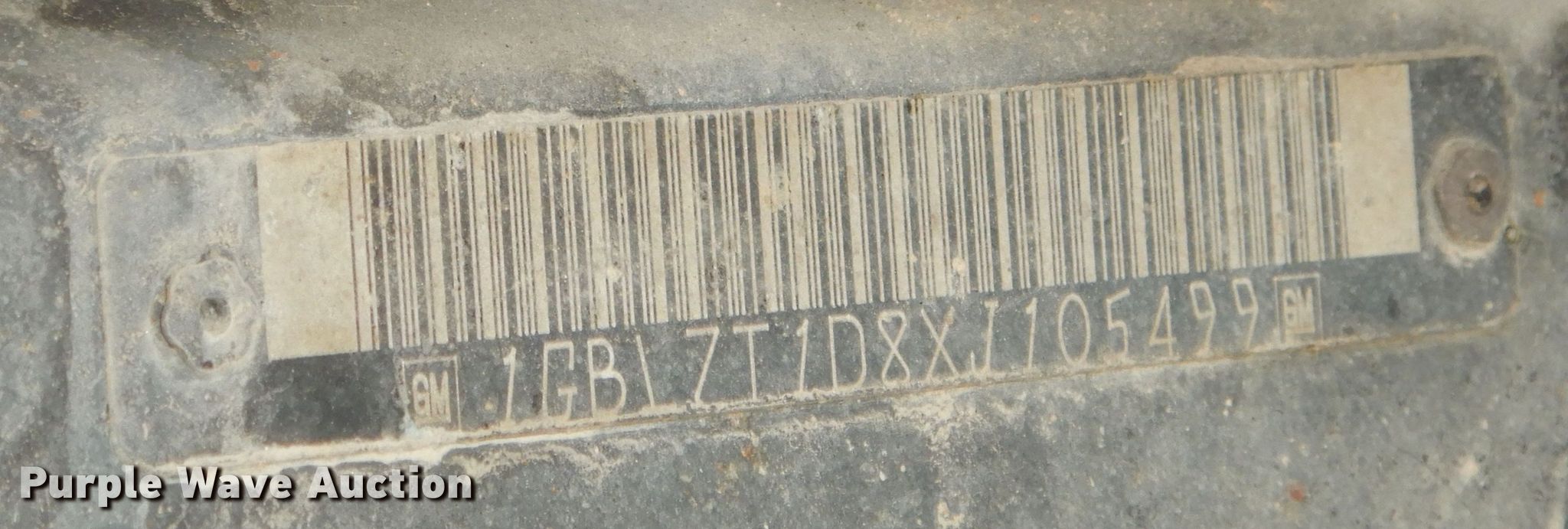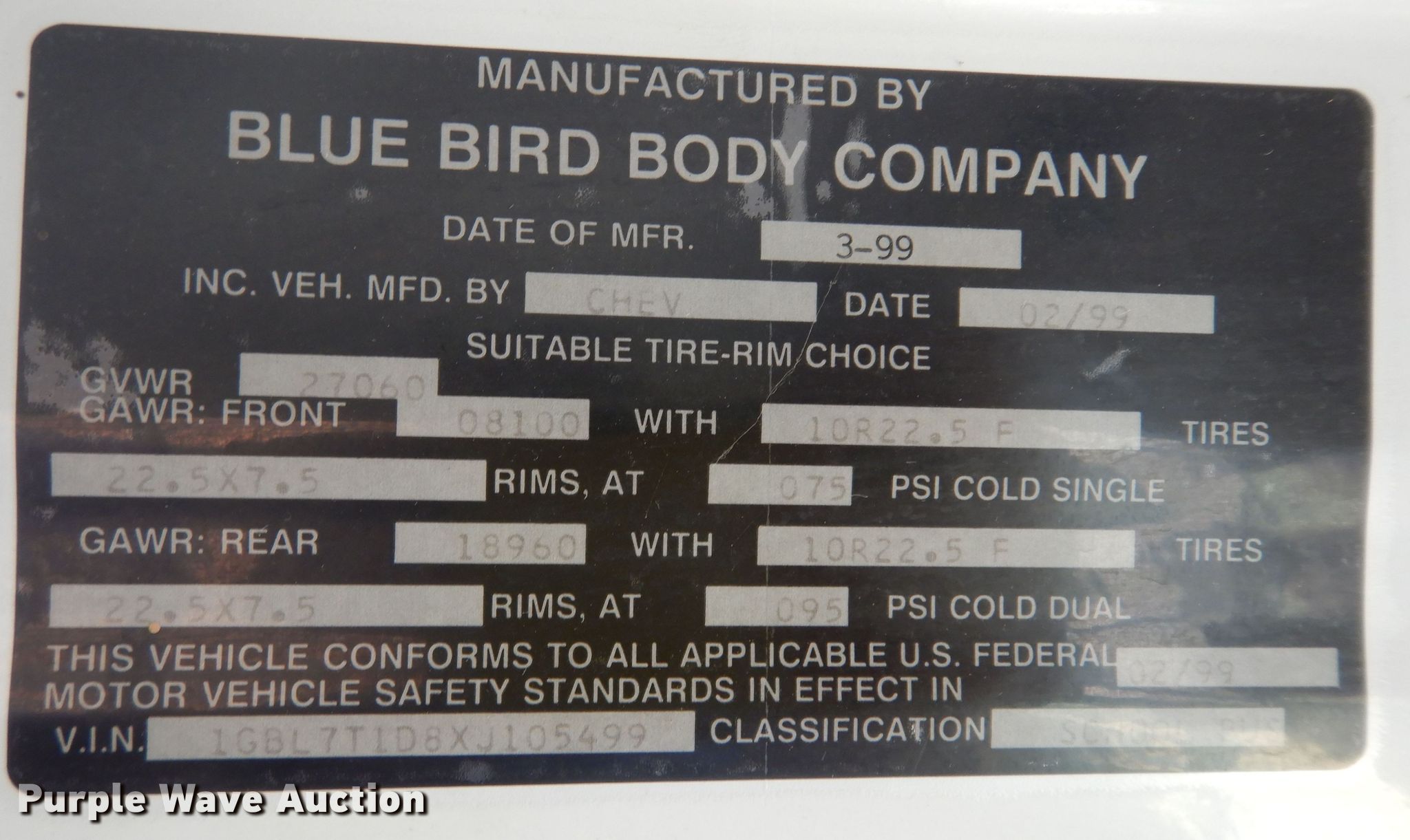 1999 Chevrolet Blue Bird school bus. Miles: 121,484 on odometer, VIN: 1GBL7T1D8XJ105499, Unit #: 99 2. Engine Displacement: 7.4L, Cylinders: 8, Fuel type: Gas. Transmission Automatic. Chassis Axles: Single, Suspension: Spring, Brakes: Hydraulic, GVWR: 27,060 lbs, Wheelbase: 254". Interior Heat, Passengers: 65. Tires Size: 10R22.5, Brand: Firestone. Notes Engine turns over, but will not start, Dead battery, Unknown operating condition. Kansas title. McLouth, KS 66054